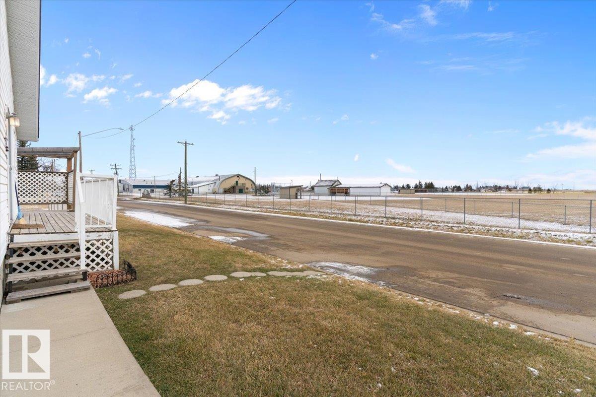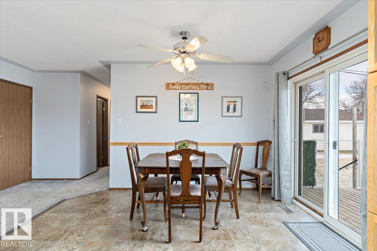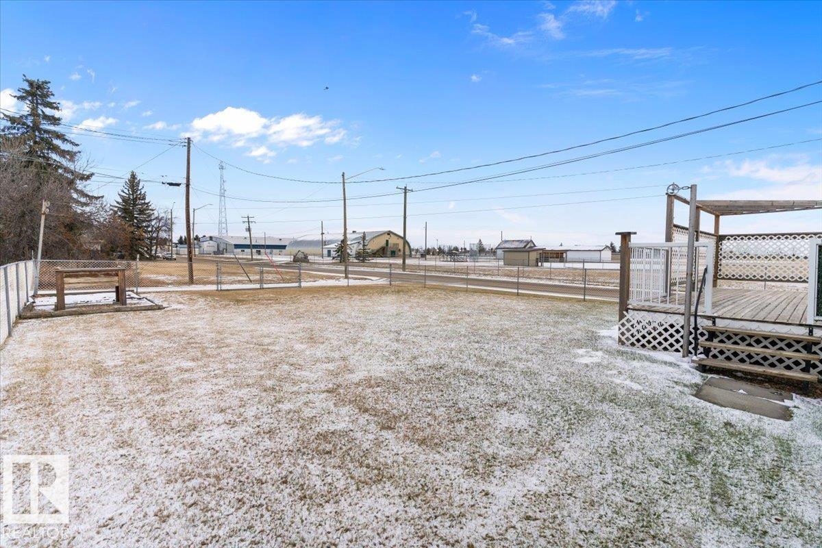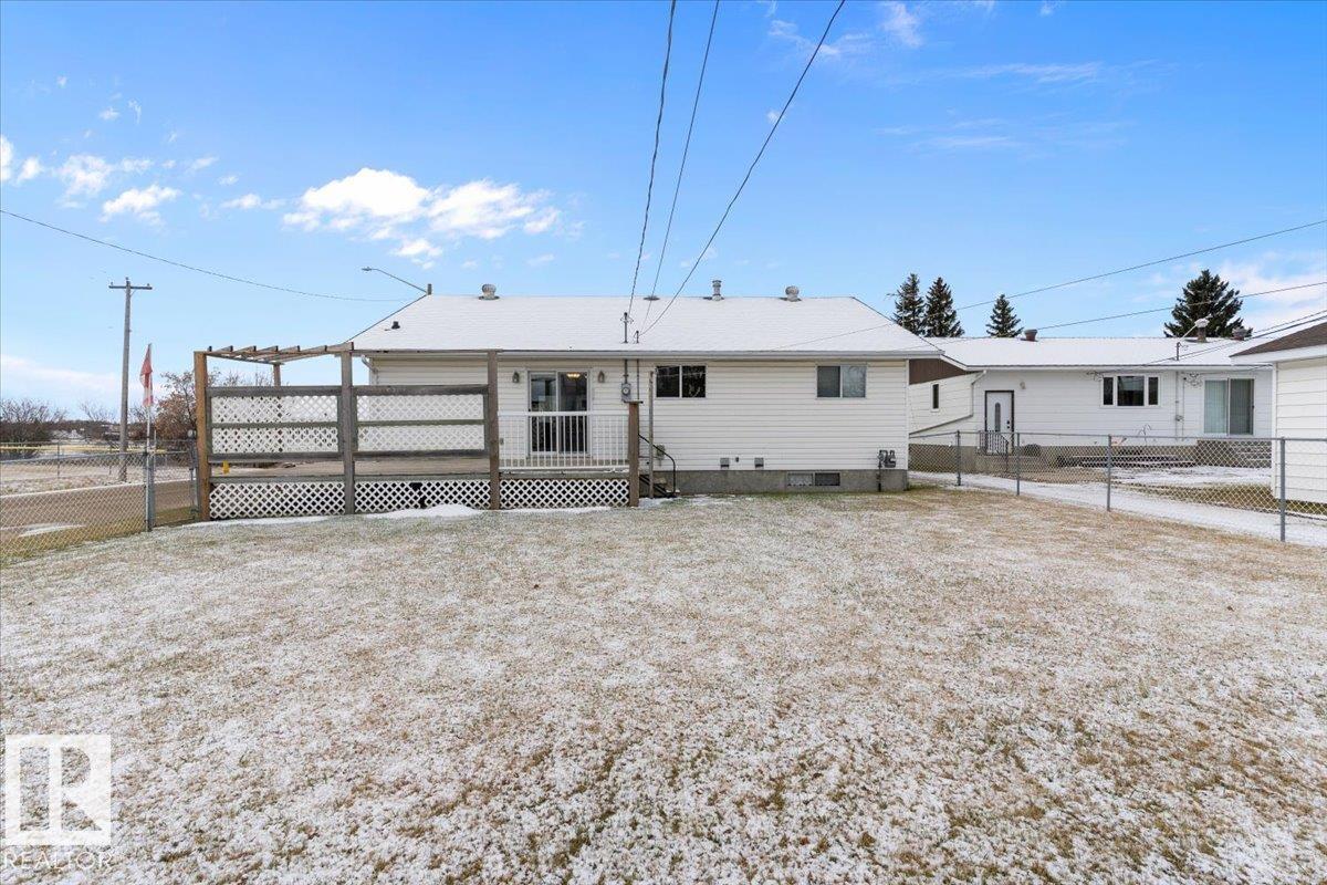 Well cared for & maintained 4 bedroom, 3 bathroom bungalow with double detached garage in the charming community of Tofield. Sunny living room greets you upon entering this lovely home. Kitchen has lots of cabinets and has adjoining dining area with access to back deck. Primary bedroom with 3pc ensuite, 2nd & 3rd bedroom (3rd bedroom has been converted to laundry room), and 4pc bathroom completes the main floor. Basement is finished with family room with adjoining rec area, bedroom, 3pc bathroom, utility/laundry room, and cold room. Backyard is fully fenced with big lawn area and back alley access. Huge wrap around deck with pergola is perfect for entertaining guests. Excellent location- unobstructed view of the fairgrounds and walking distance to rec facilities & downtown amenities. Great family home- a must see !!