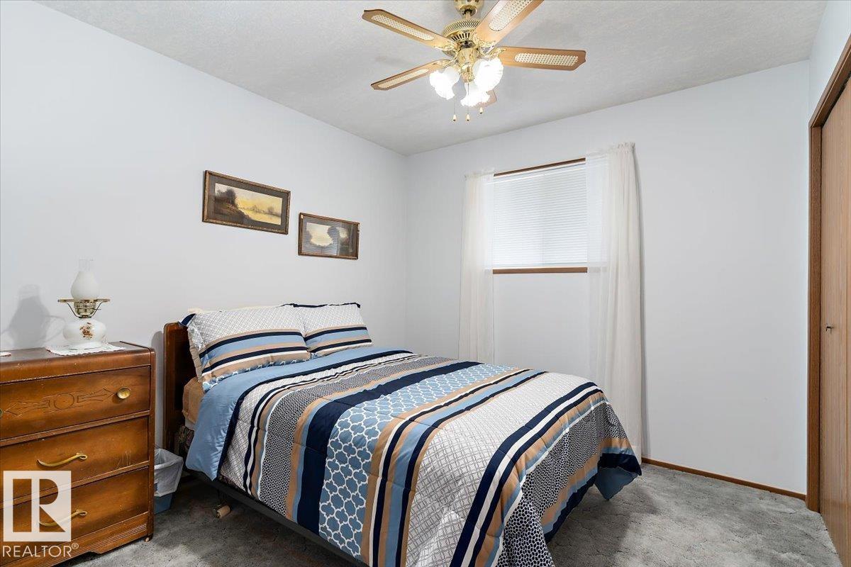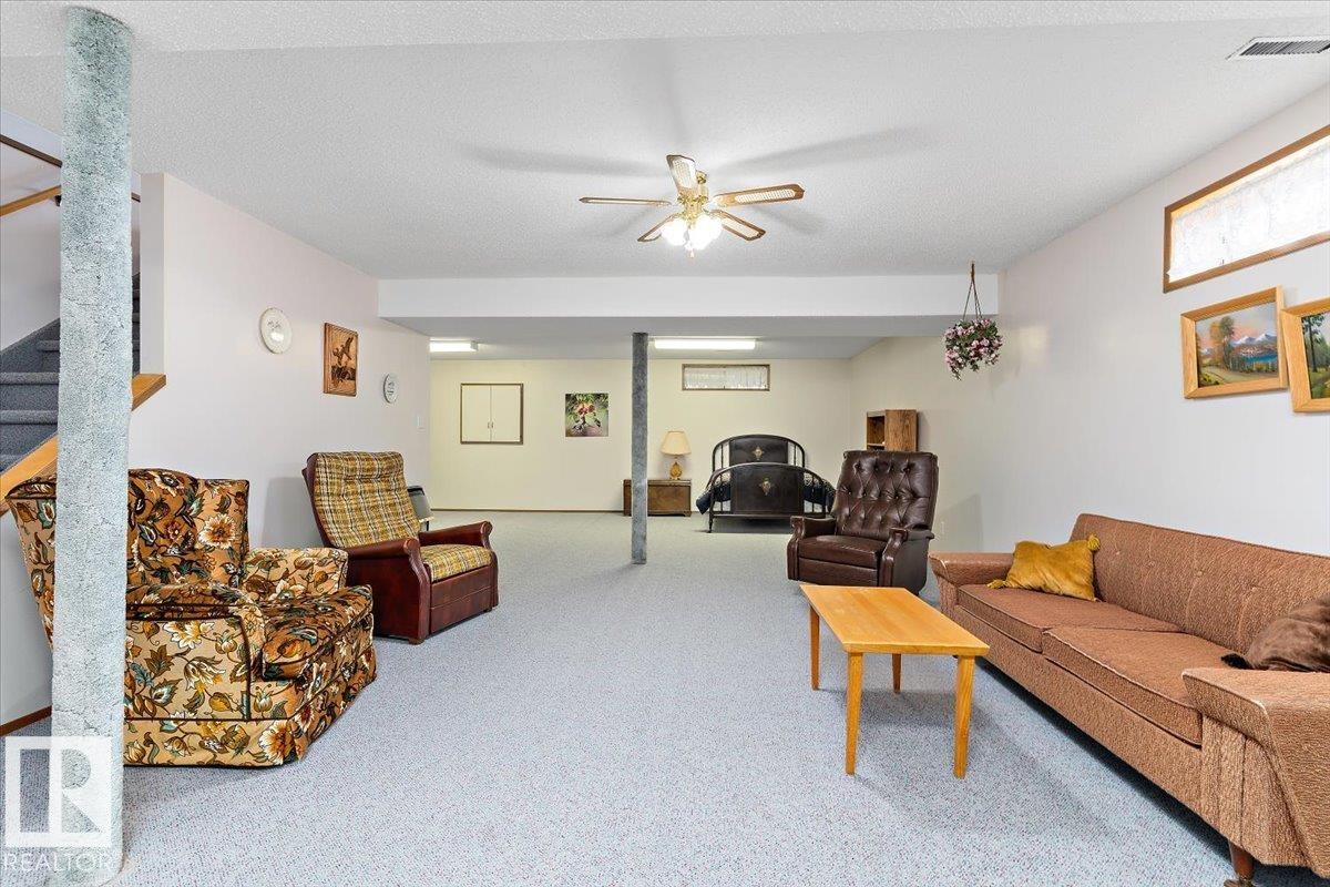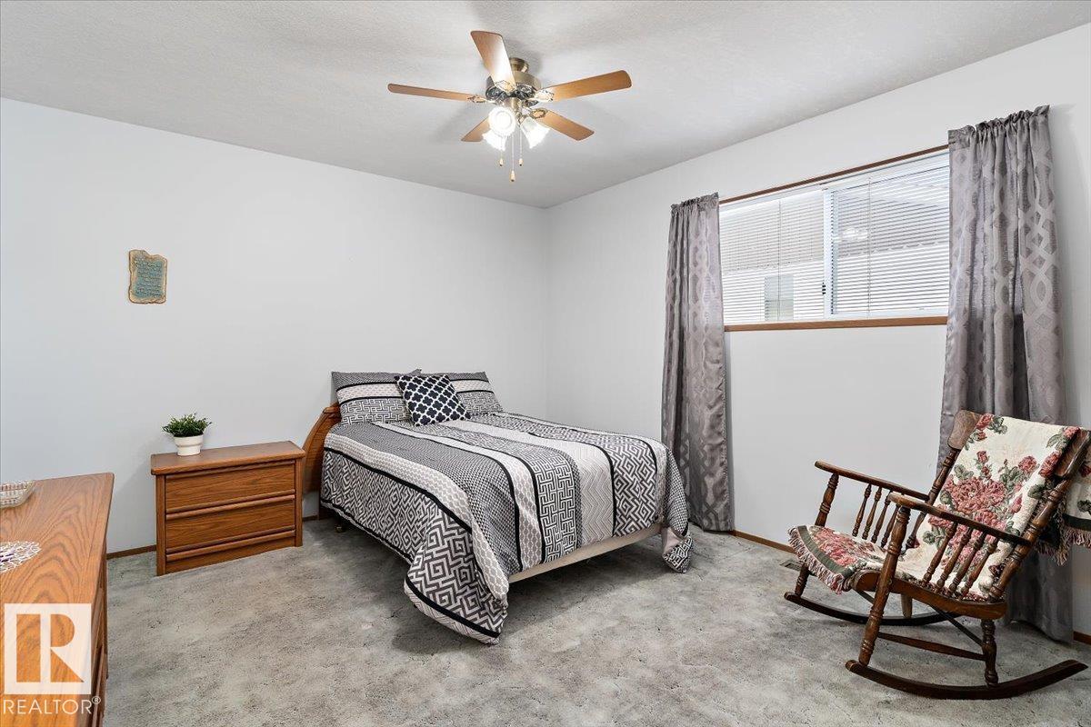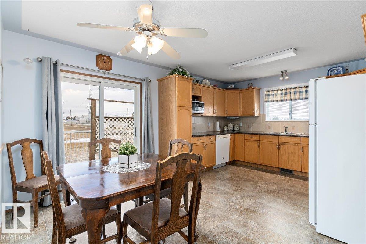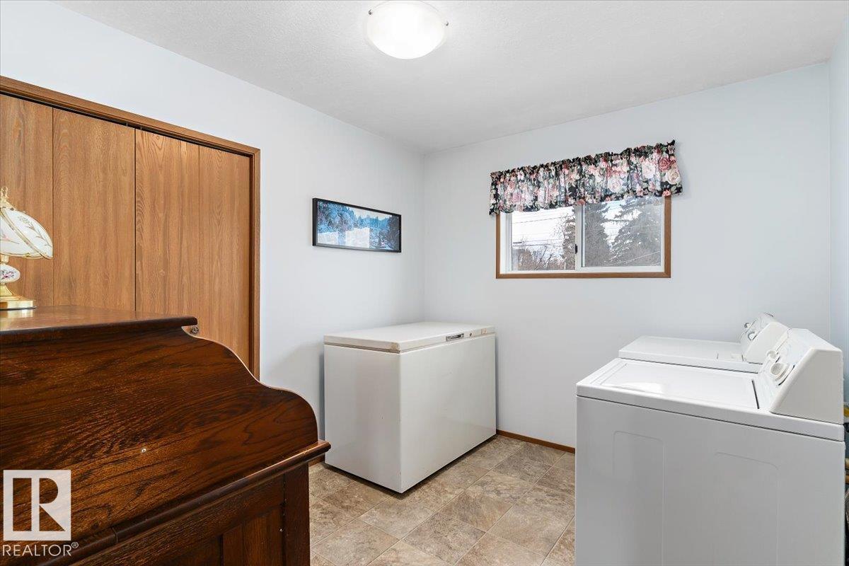 Well cared for & maintained 4 bedroom, 3 bathroom bungalow with double detached garage in the charming community of Tofield. Sunny living room greets you upon entering this lovely home. Kitchen has lots of cabinets and has adjoining dining area with access to back deck. Primary bedroom with 3pc ensuite, 2nd & 3rd bedroom (3rd bedroom has been converted to laundry room), and 4pc bathroom completes the main floor. Basement is finished with family room with adjoining rec area, bedroom, 3pc bathroom, utility/laundry room, and cold room. Backyard is fully fenced with big lawn area and back alley access. Huge wrap around deck with pergola is perfect for entertaining guests. Excellent location- unobstructed view of the fairgrounds and walking distance to rec facilities & downtown amenities. Great family home- a must see !!