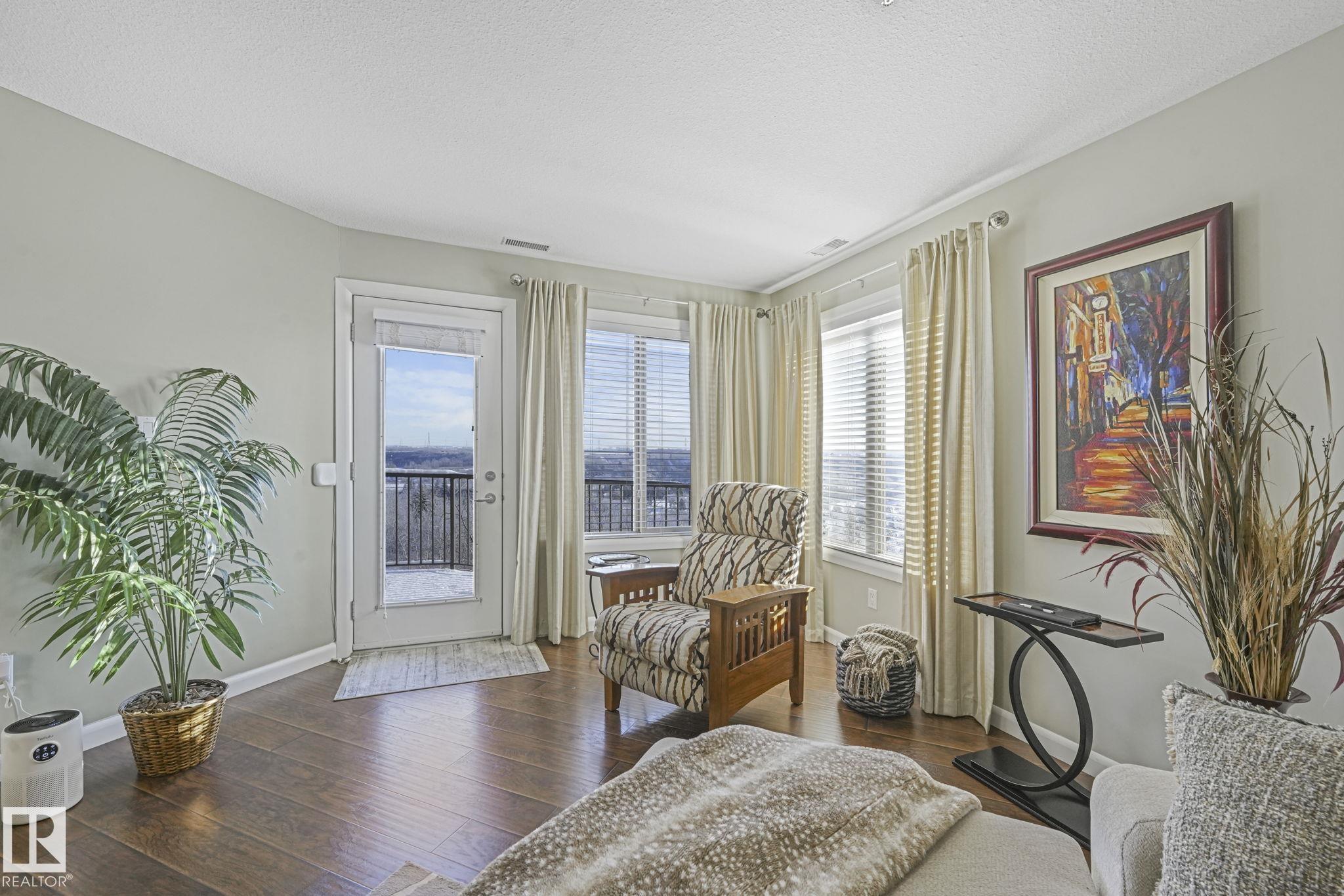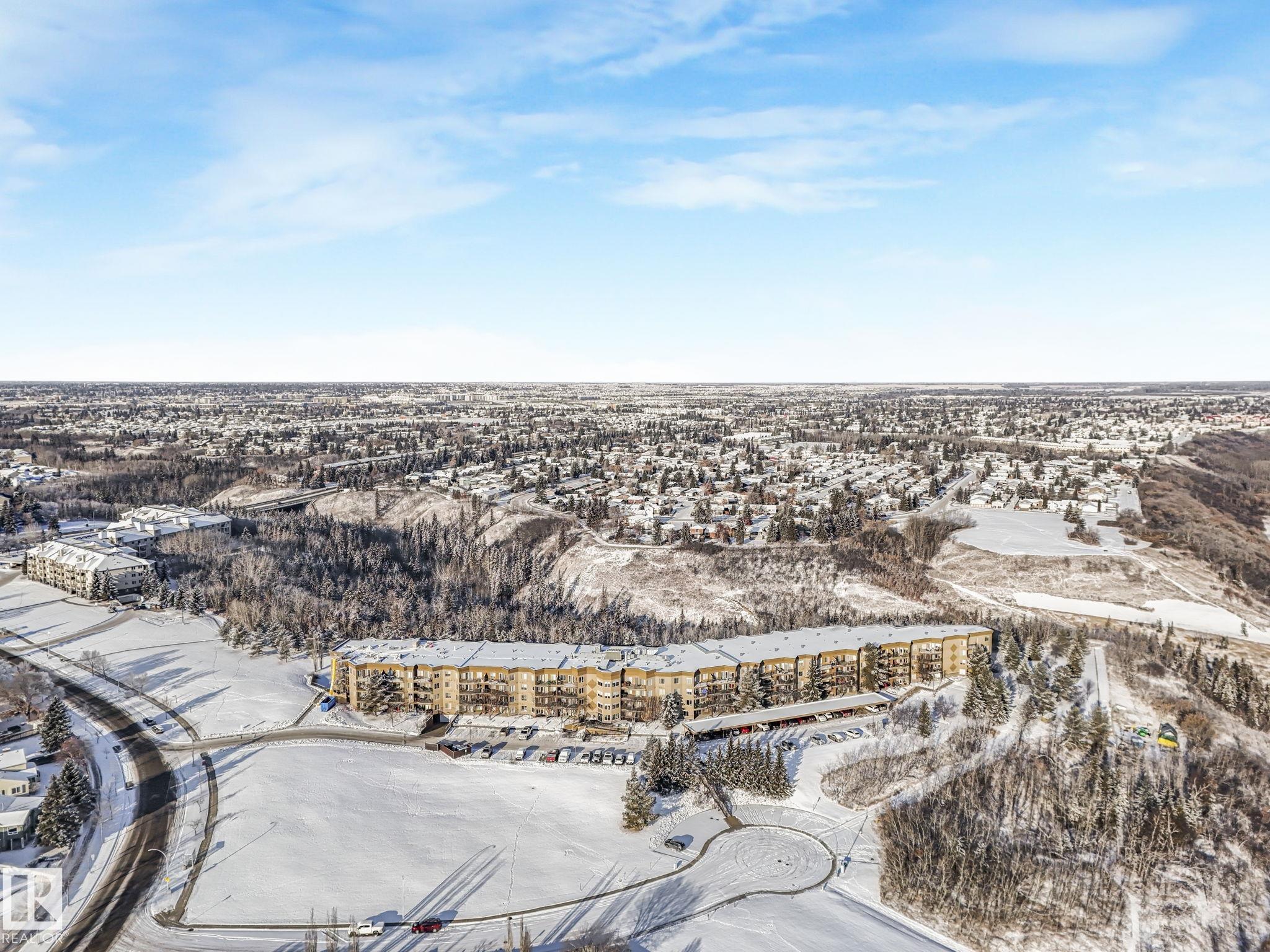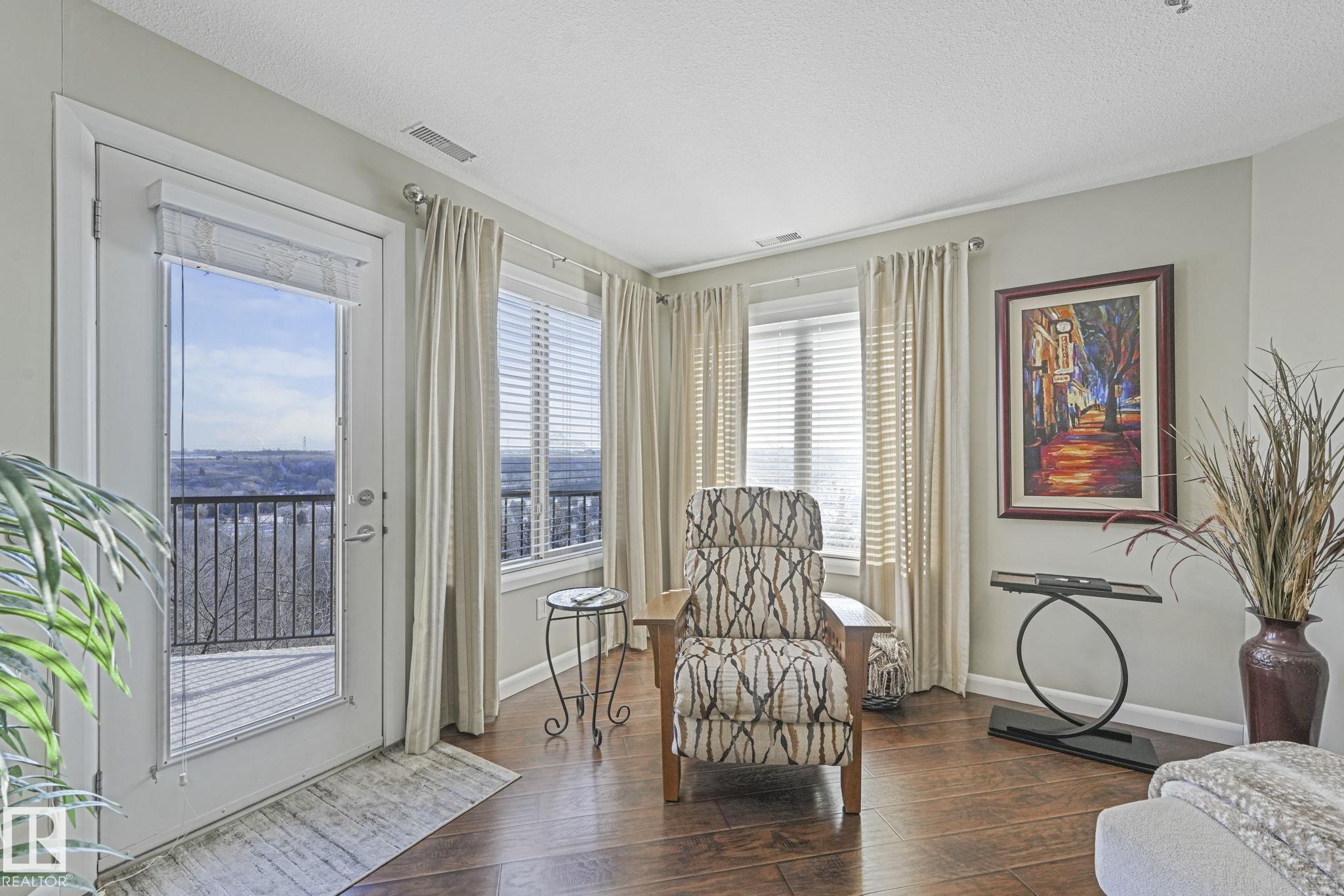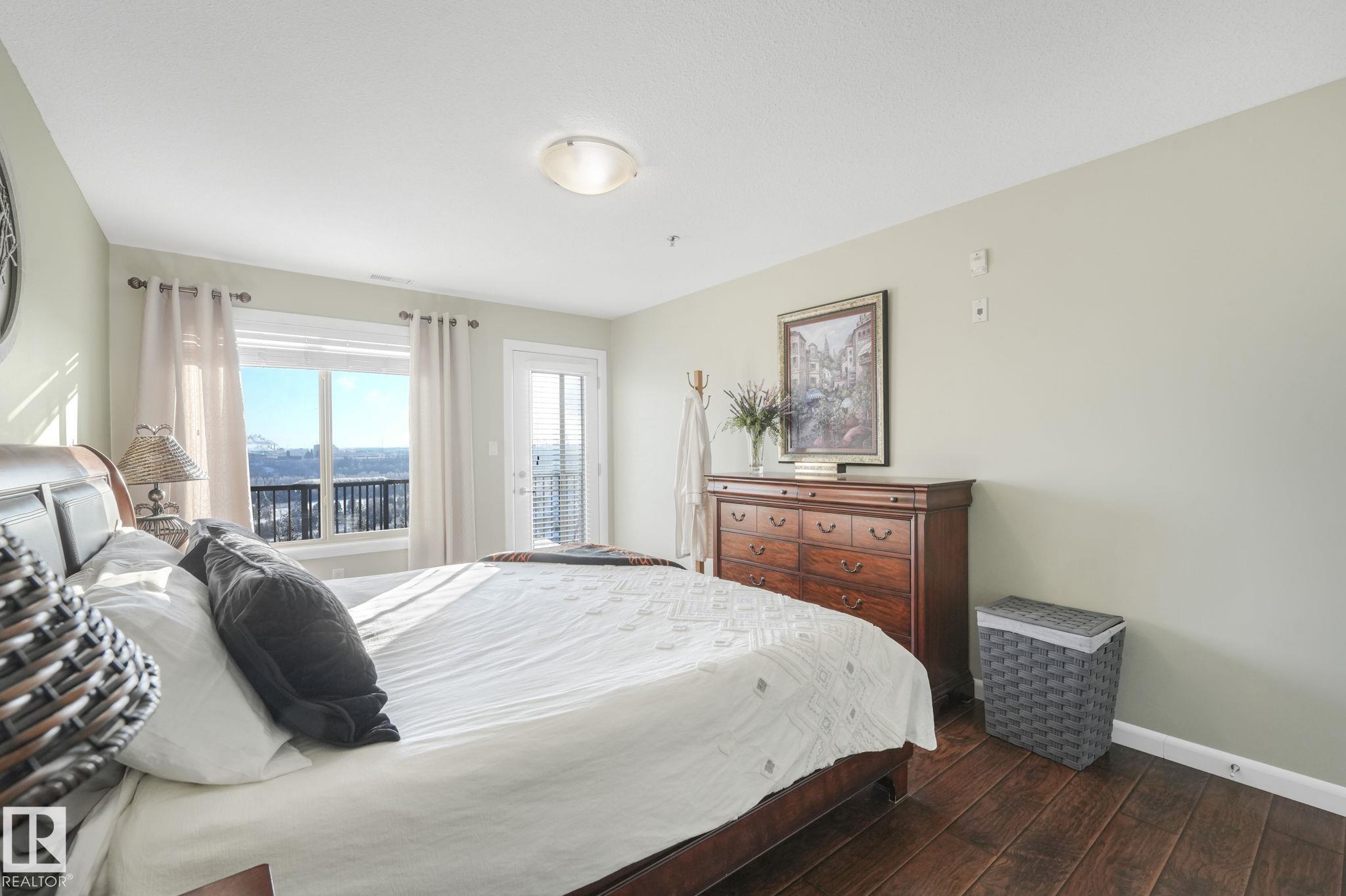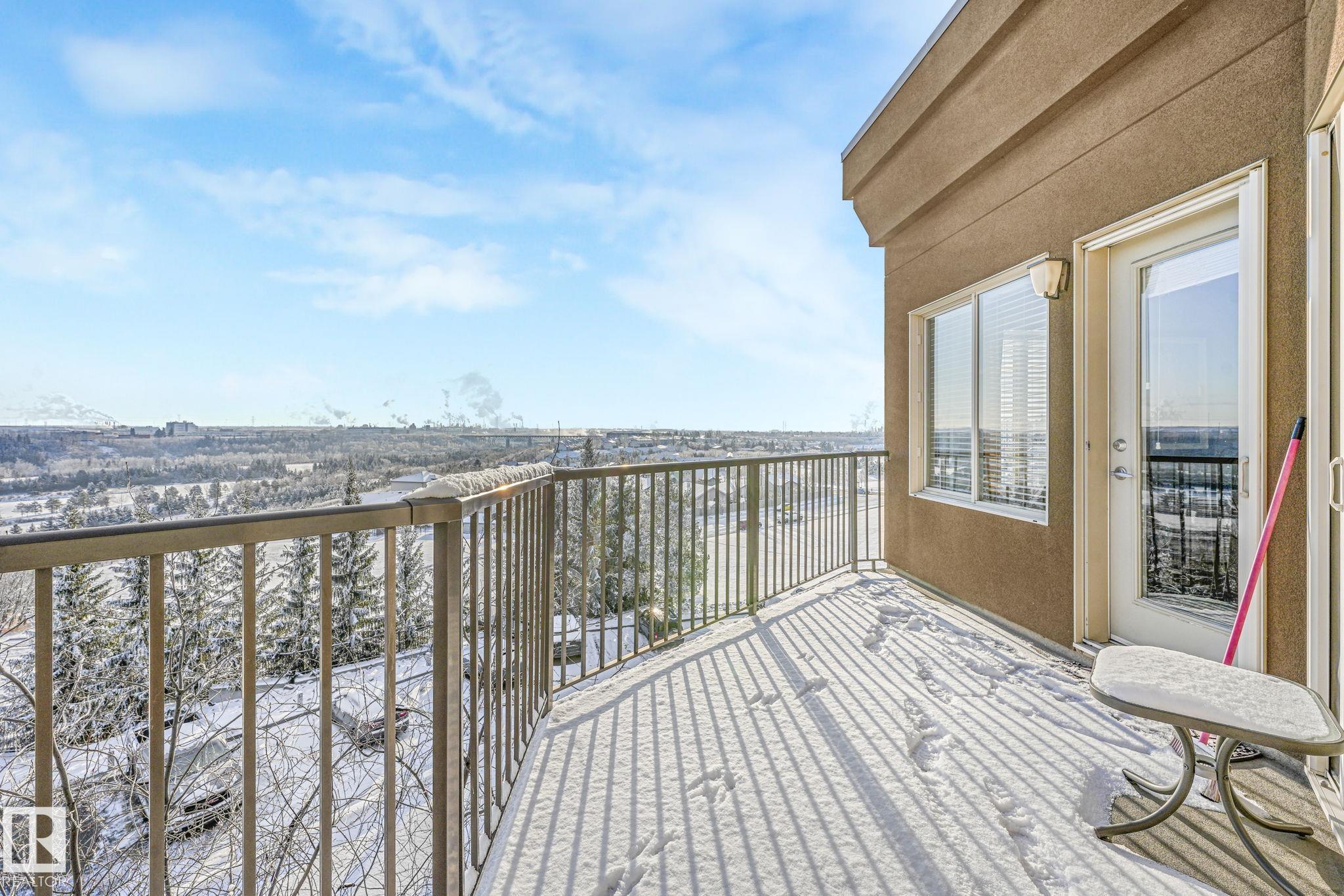 Executive top-floor penthouse condo with 1200 plus sq. ft. of bright, open living space with spectacular river valley views from all rooms. This 2-bed, 2 full bath unit delivers outstanding river valley views from a large deck with a natural gas hookup. The layout feels wide and inviting with an open kitchen, dining and living area. Big windows fill the space with natural light. Both bedrooms are oversized, and the primary suite feels especially roomy. You get in-suite laundry, stainless steel appliances, air conditioning and a separate storage locker. The heated underground parkade includes a titled stall locker room and a car wash. The complex is 18 plus and offers a social room with a pool table, plus an exercise room. The location sits right on the ravine, close to shopping, schools, transit and easy access to walking paths. A standout unit in a quiet, well-kept building. Upgraded quartz countertops throughout. Spectacular place to live!