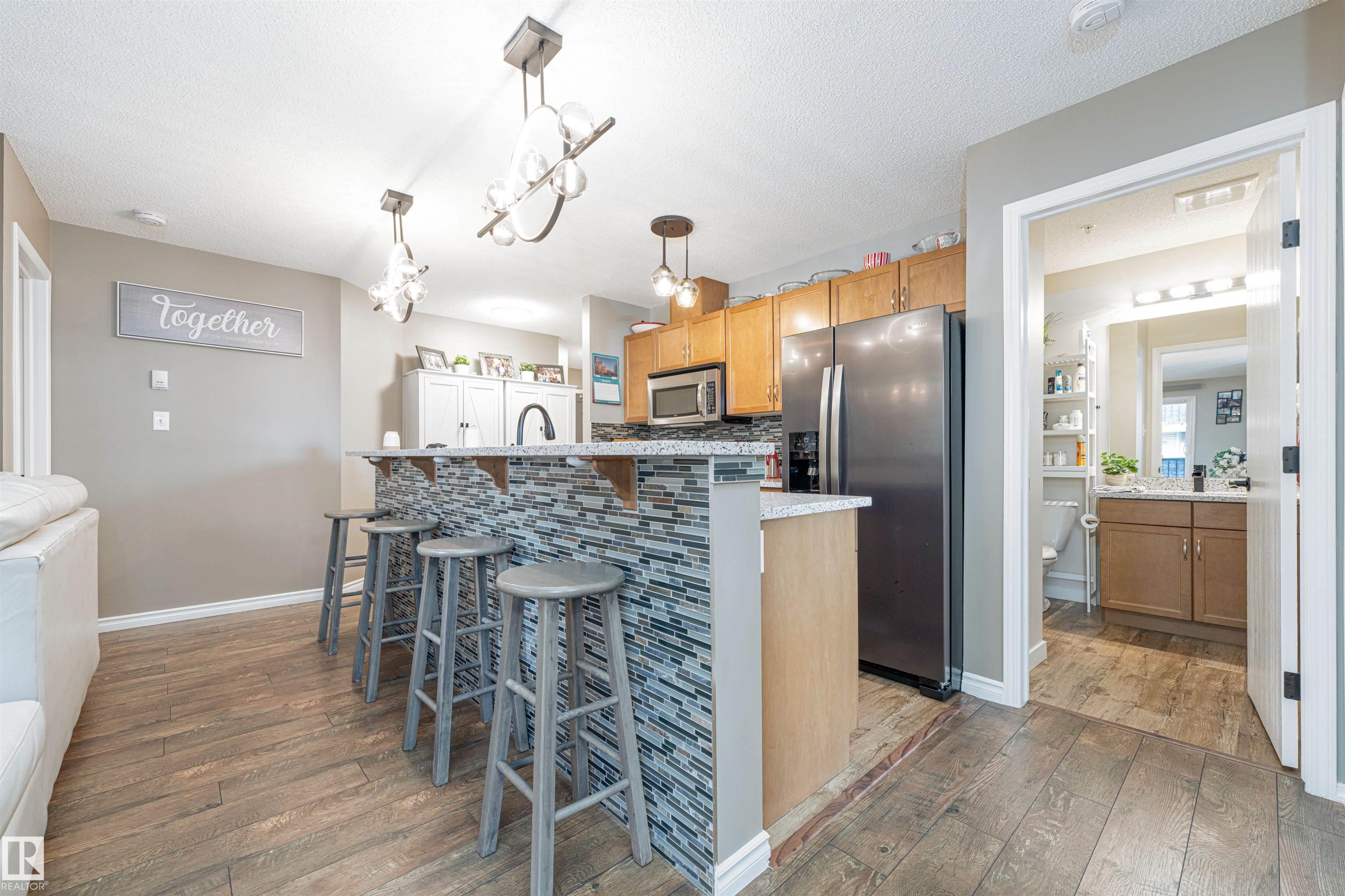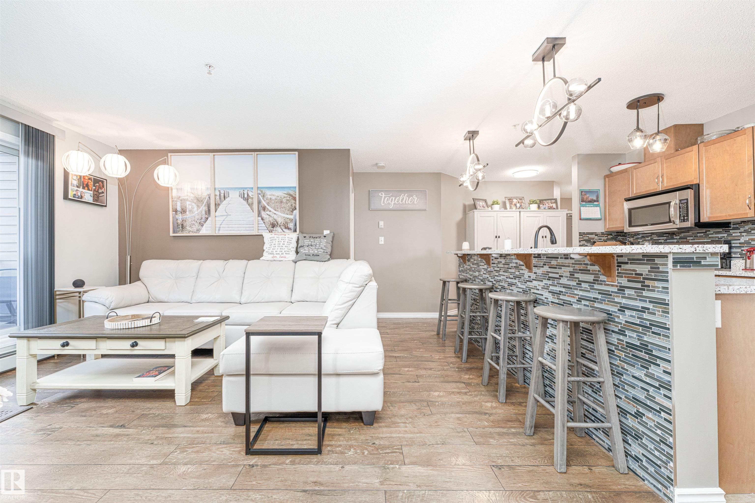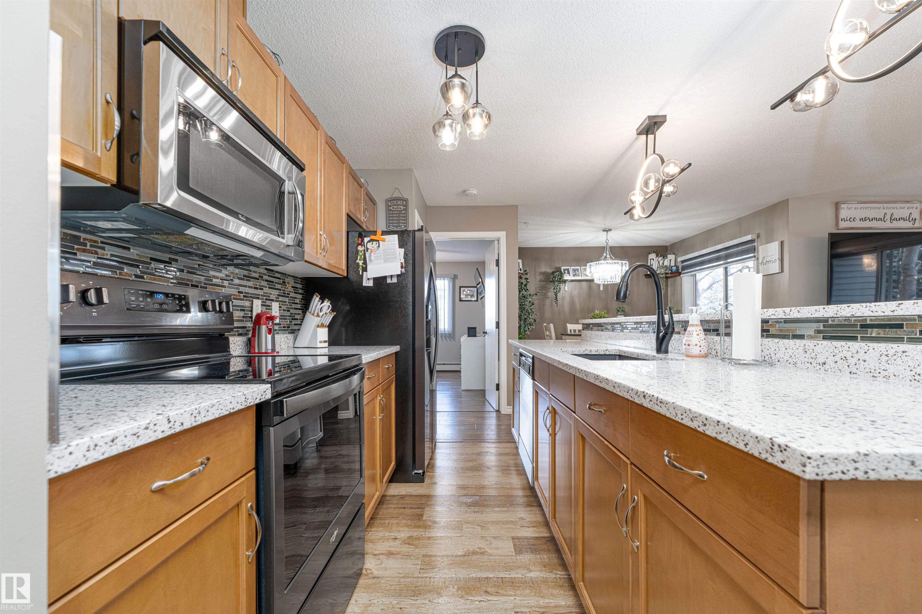 Do not miss out on this spacious, ground floor, corner unit in the very well kept low rise condo complex called The Avenue. This 2 bedroom home includes a master bedroom with walk through closet and 4 piece ensuite. The tastefully decorated open concept kitchen, living room and dining area separates the second bedroom from the master for privacy. A new washer and dryer are included in a larger laundry room with space for storage. This beautifully decorated home boast many upgrades including new appliances, paint 2025, flooring throughout 2017, kitchen and bathroom reno 2020. Extra large patio with privacy fencing surrounds this home for sheltered evenings outside. Close to Hermitage Park. Easy and quick access to Victoria Trail and the Yellowhead. Condo fees are going down!!