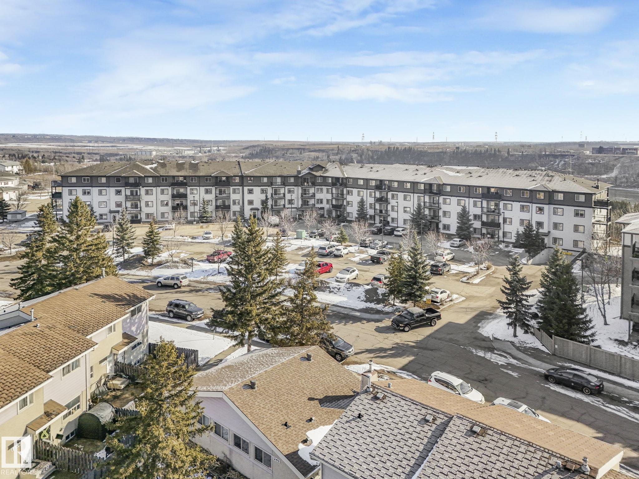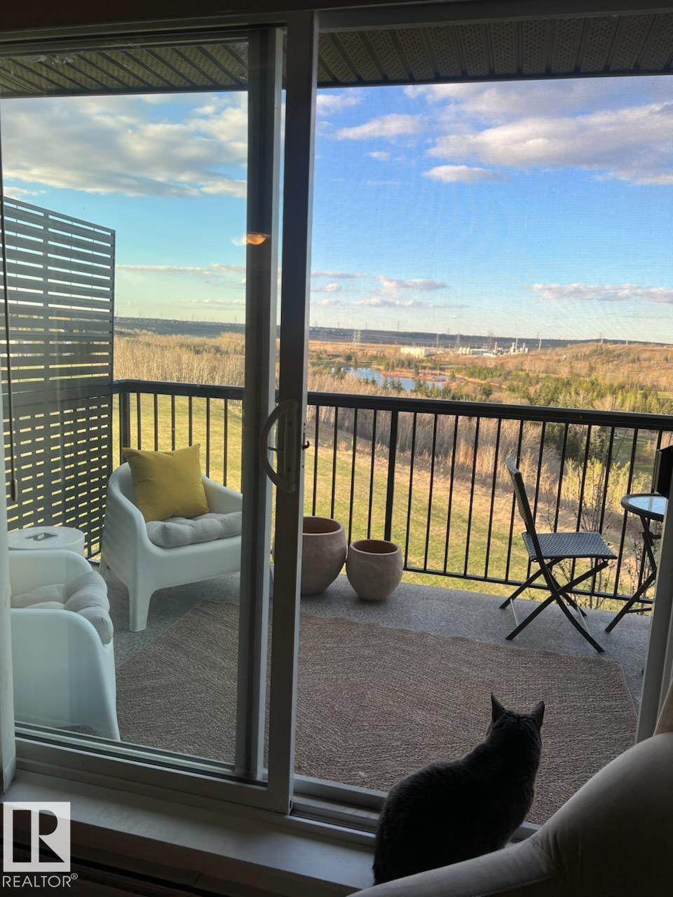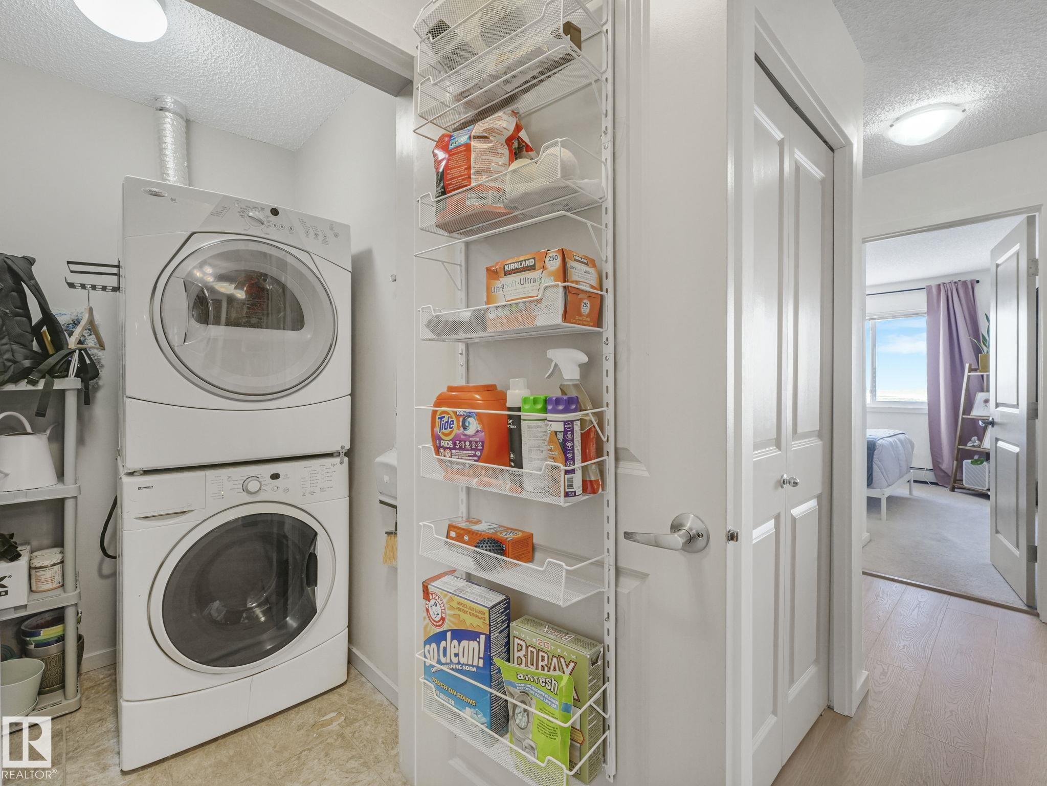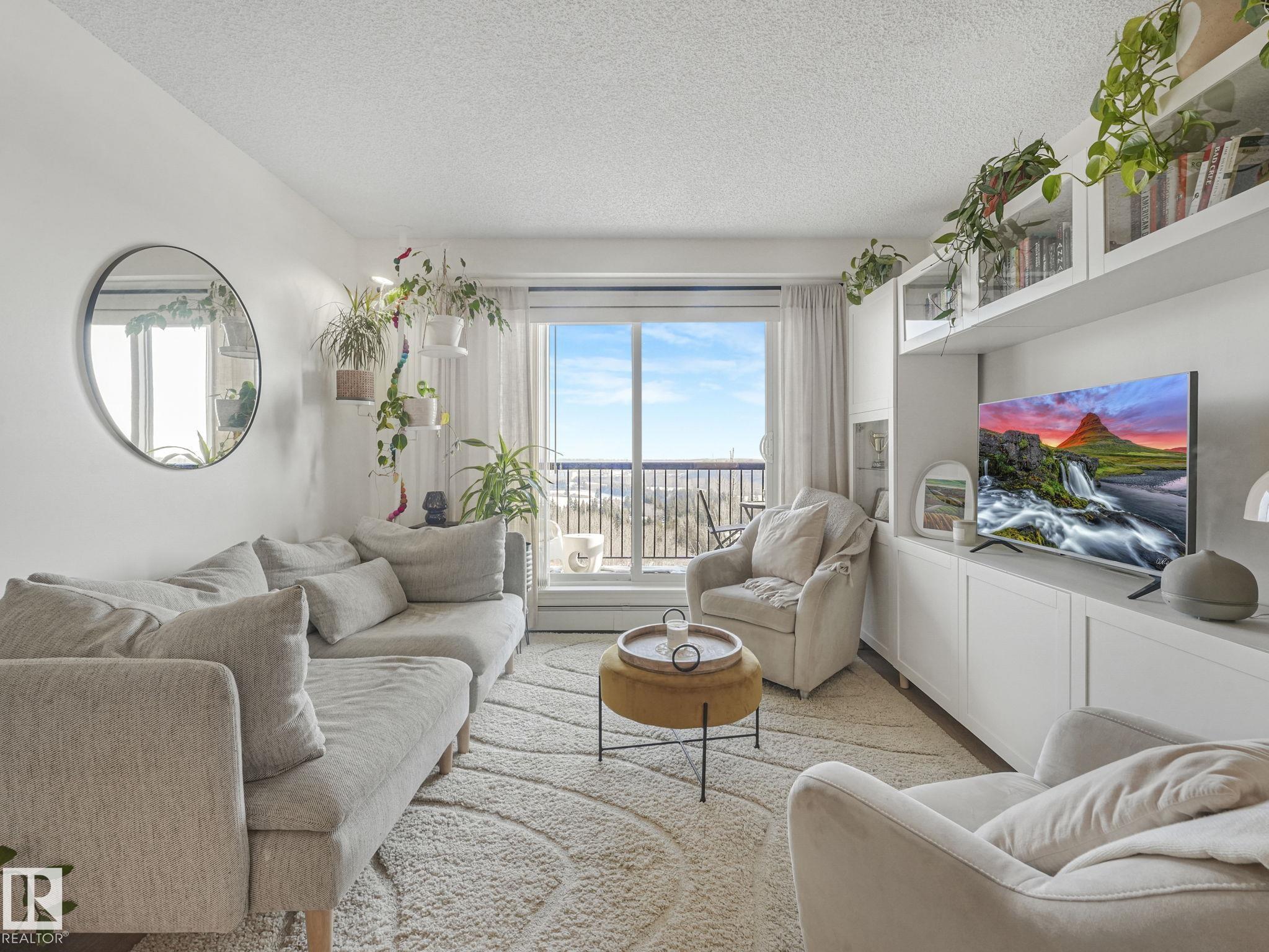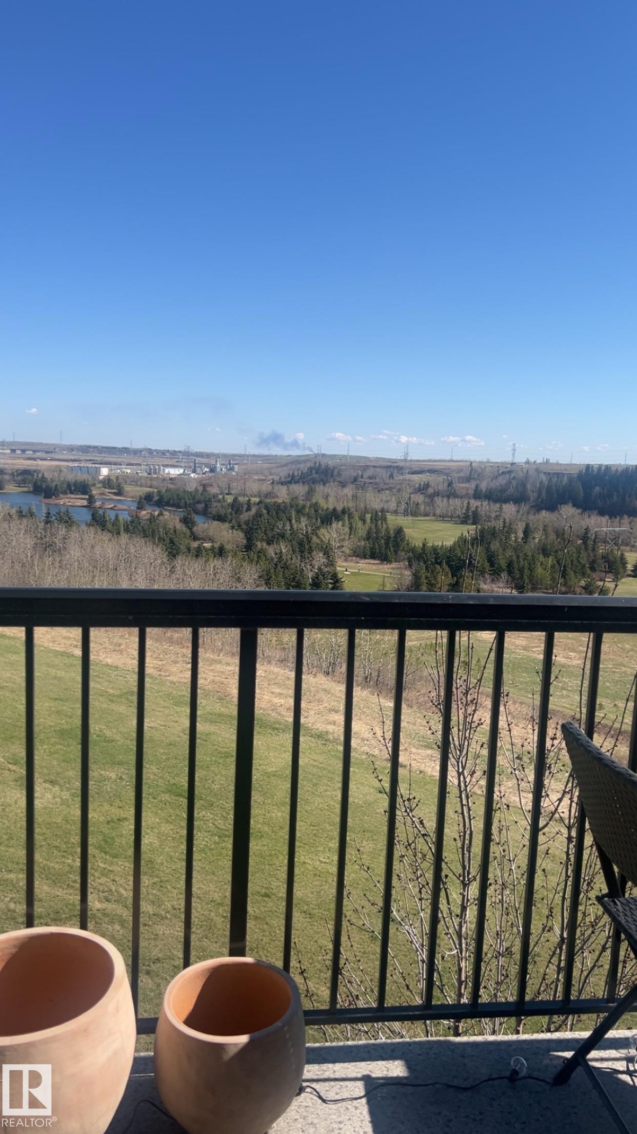 TOP FLOOR, bright, updated unit with unobstructed views of the river valley! 810 sq ft, 2 bedrooms / 2 full baths, plus 2 titled UNDERGROUND HEATED parking stalls and storage cage (located on the same floor as the suite). Open-concept layout with an island kitchen with stainless steel appliances, pantry, a new built-in coffee nook. Fresh white paint throughout, and new laminate flooring in kitchen/living room. Microwave/hoodfan, dishwasher, kitchen faucet are new. Unit has insuite laundry! Easy access to Victoria Trail, Yellowhead, and the Henday + ample visitor parking.