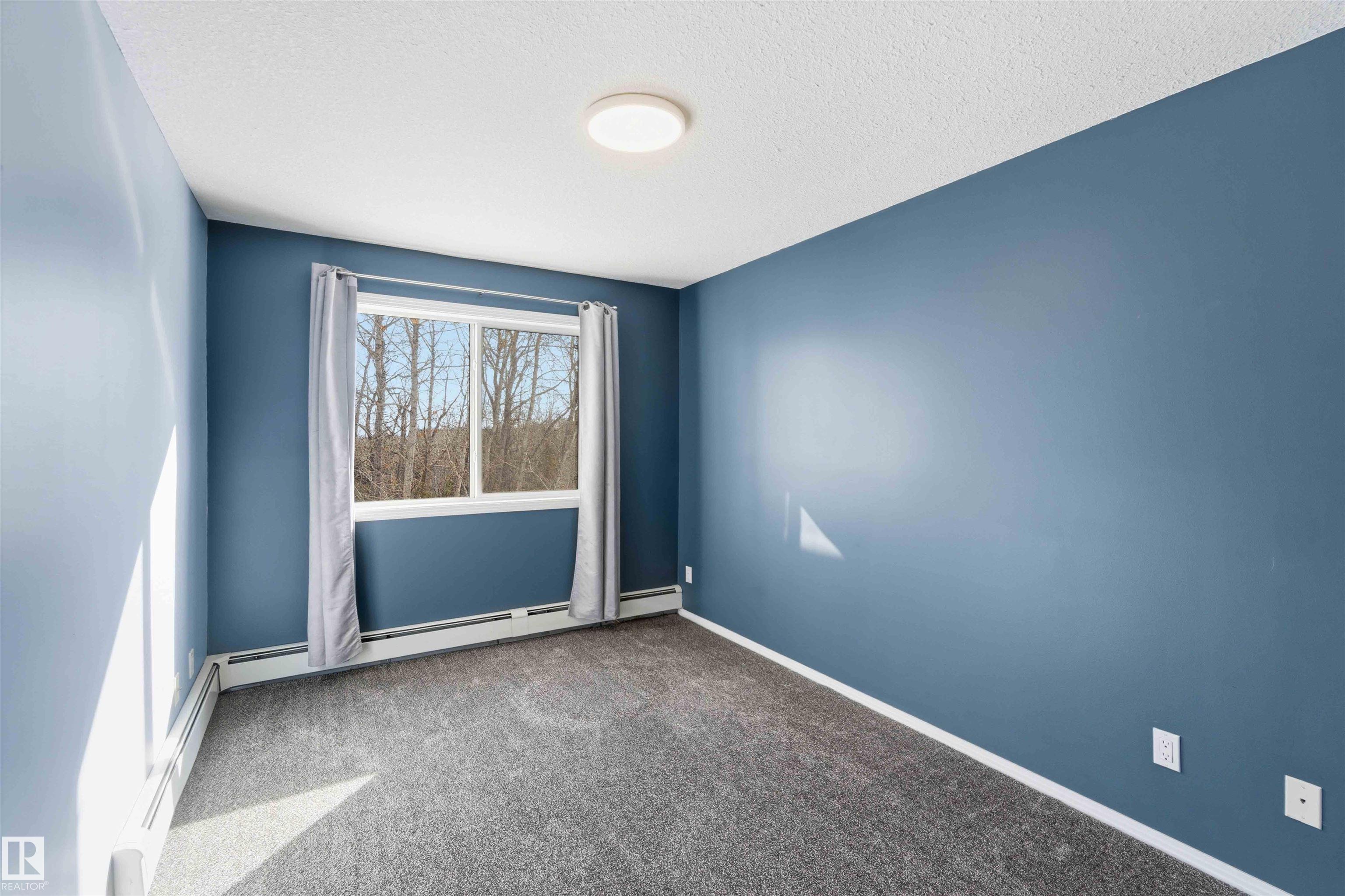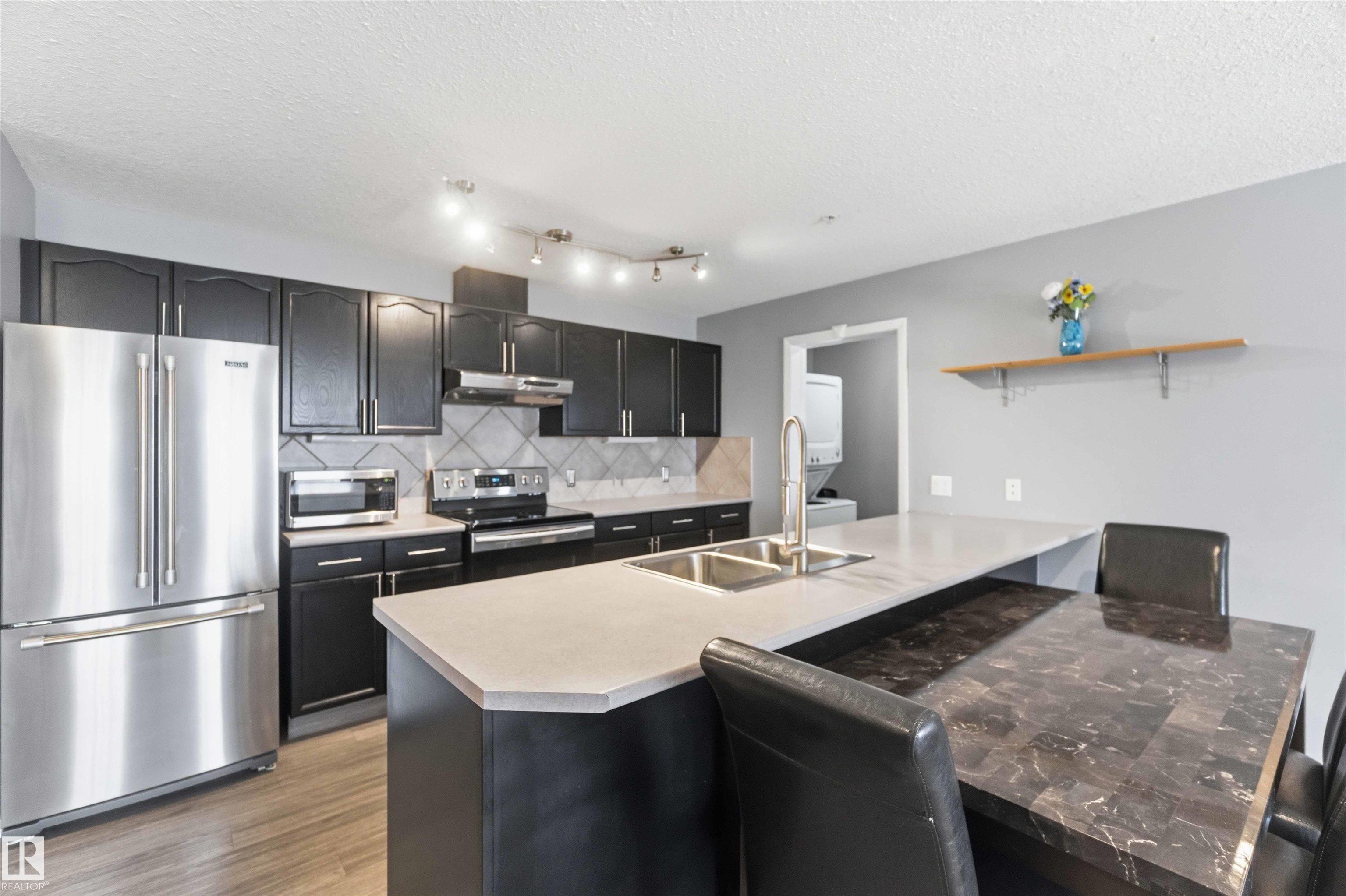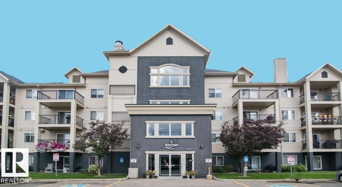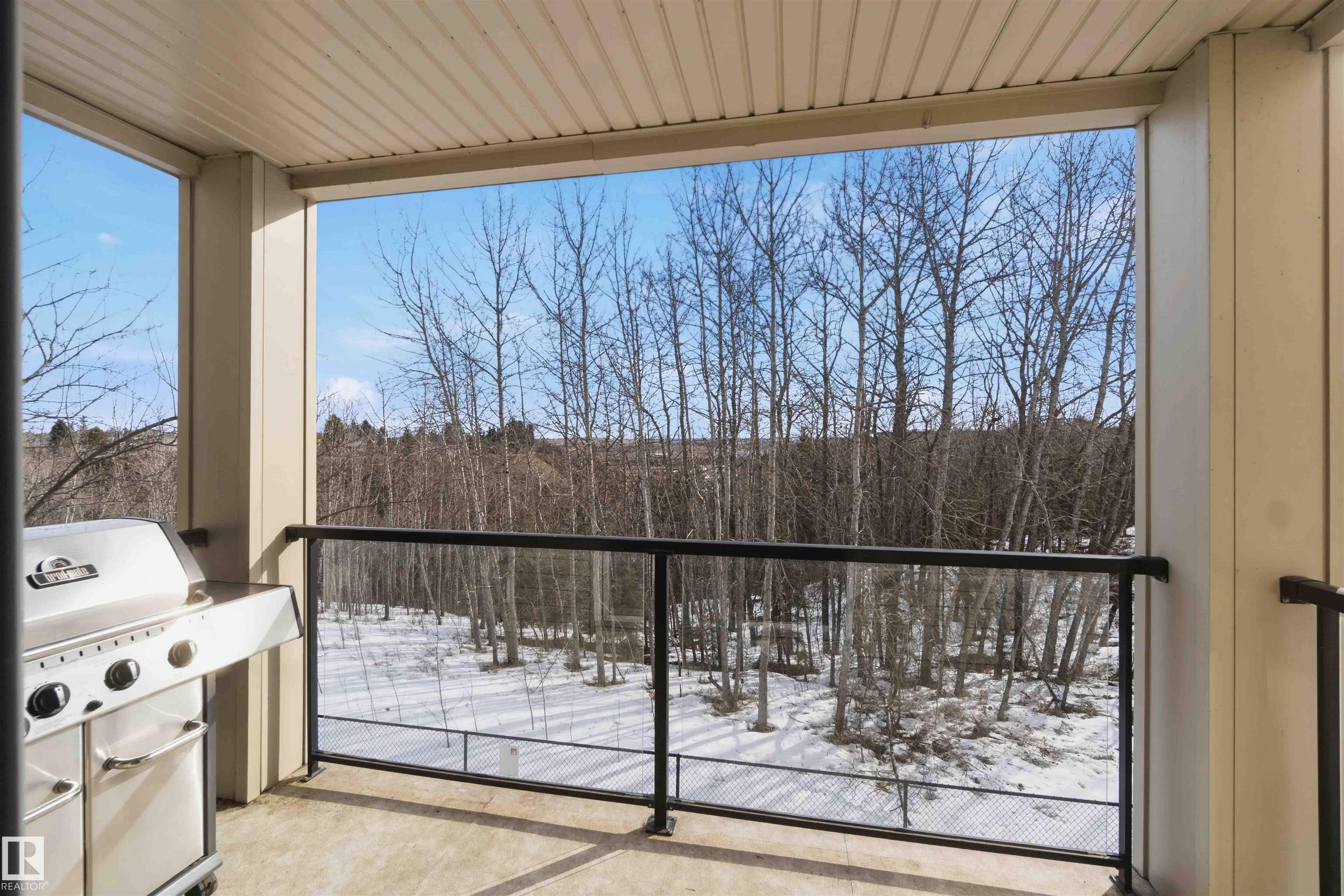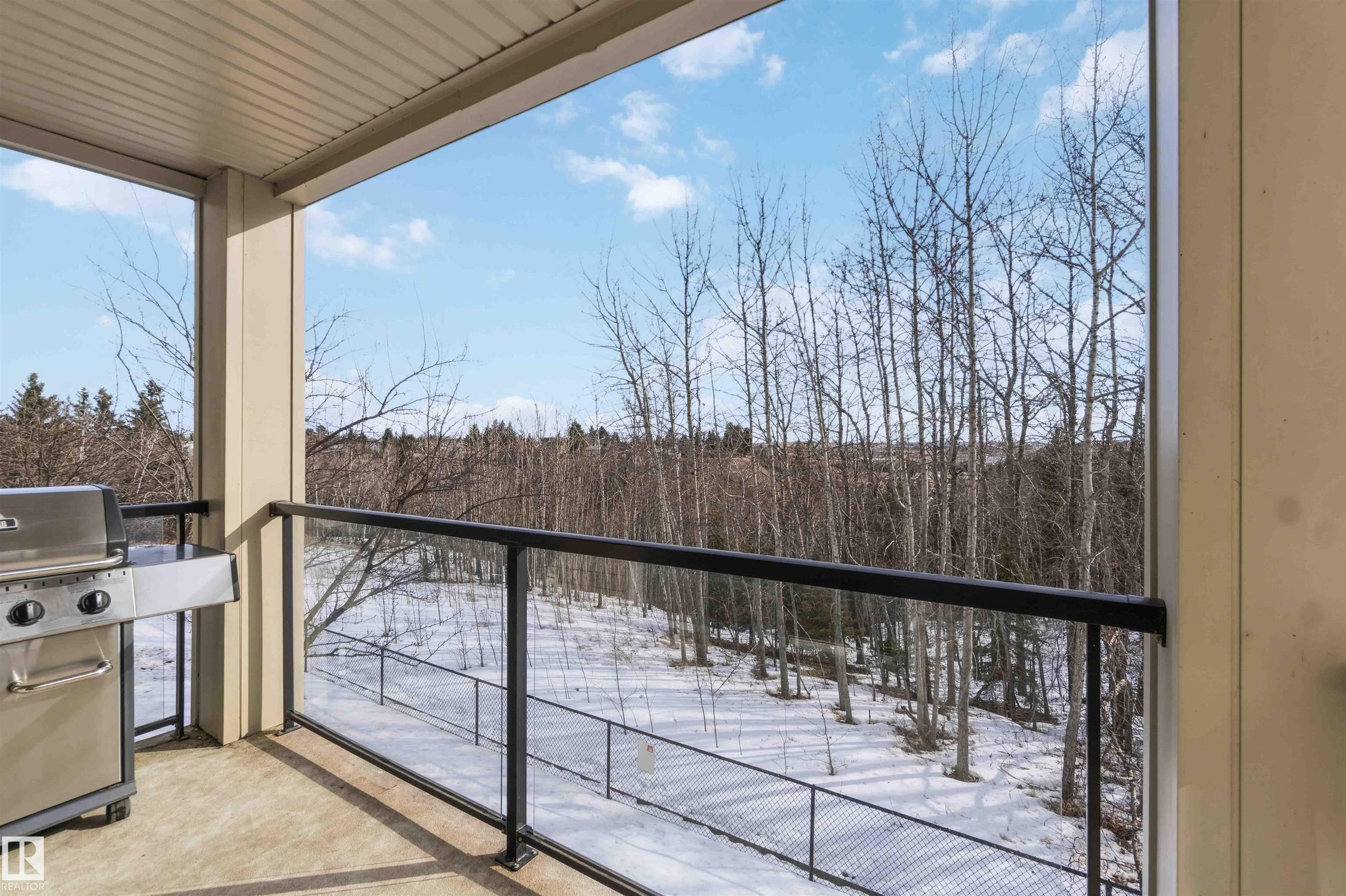 Featuring beautiful forest & ravine views, this modern 1,011 SqFt suite has TWO BEDROOMS + TWO FULL BATHS + heated/underground parking stall! Walk through the front door of this gorgeous home and you are welcomed by an open concept kitchen & living space. Enjoy a modern kitchen offering stainless steel appliances, large countertops, centre island and substantial cupboard storage. Like new in-suite stacked washer & dryer in the separate laundry + storage room. Walkout east-facing deck is perfectly quiet with calming forest views + has natural gas BBQ connection. The building itself is situated in a prime north Edmonton location, a stone's throw to ample shopping and ALL amenities. This home comes with 1 titled parking stall + an assigned handy storage cage in a heated underground parkade. ALL furnishings currently in unit included in sale. This home has been upgraded, meticulously well maintained and is great value, just turn the key and move in. This property is priced perfectly - don't miss out!