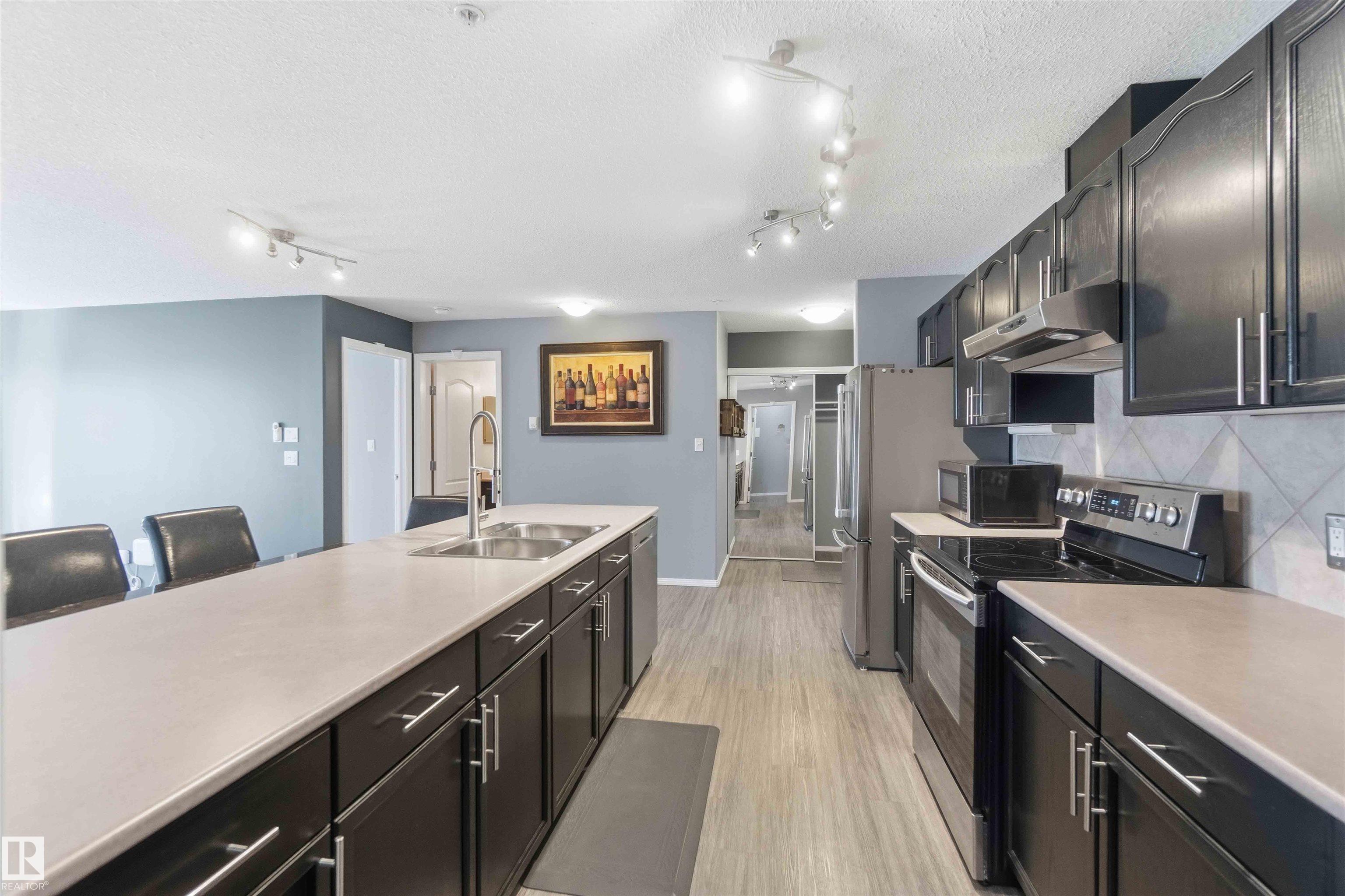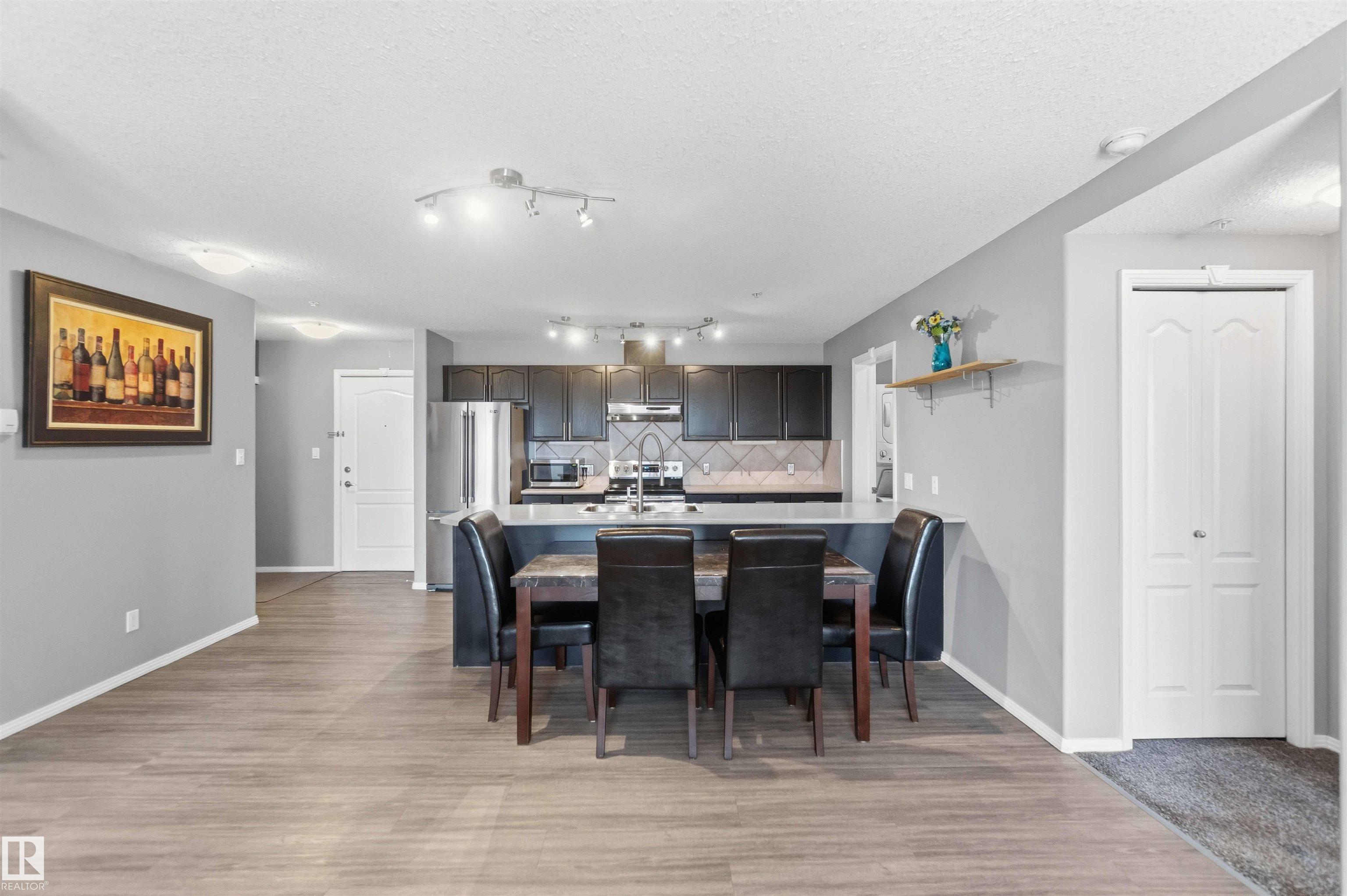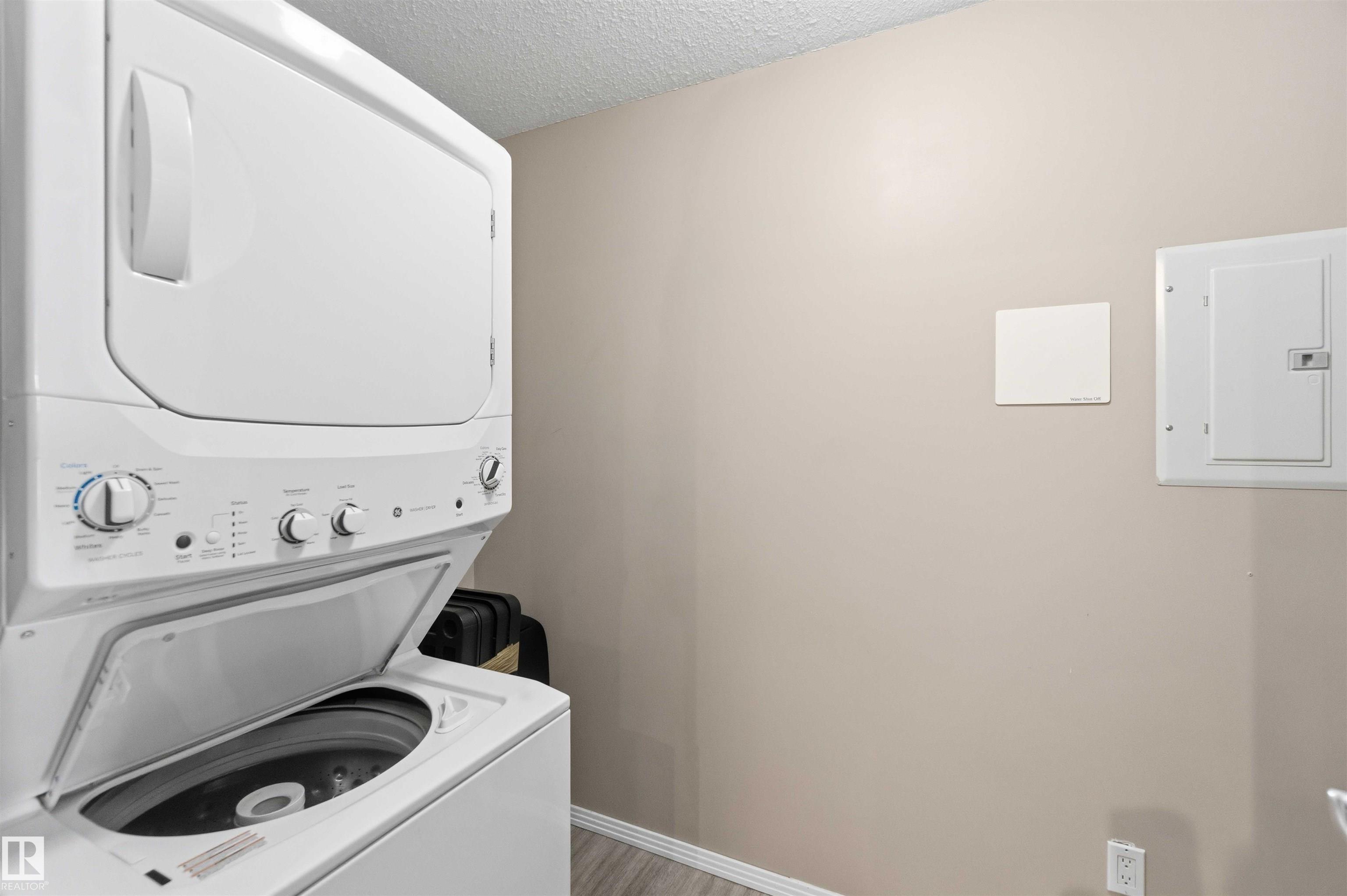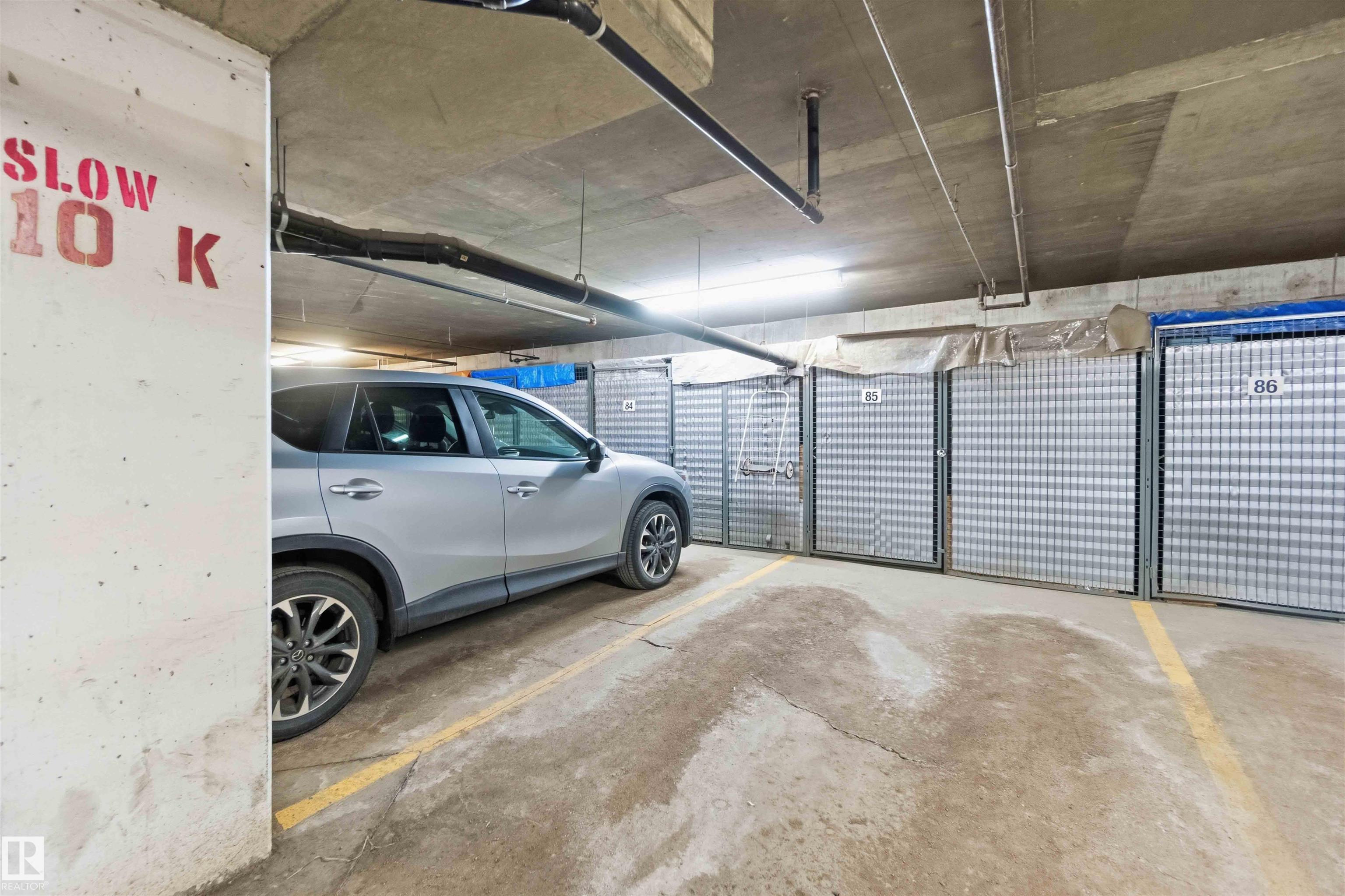 Featuring beautiful forest & ravine views, this modern 1,011 SqFt suite has TWO BEDROOMS + TWO FULL BATHS + heated/underground parking stall! Walk through the front door of this gorgeous home and you are welcomed by an open concept kitchen & living space. Enjoy a modern kitchen offering stainless steel appliances, large countertops, centre island and substantial cupboard storage. Like new in-suite stacked washer & dryer in the separate laundry + storage room. Walkout east-facing deck is perfectly quiet with calming forest views + has natural gas BBQ connection. The building itself is situated in a prime north Edmonton location, a stone's throw to ample shopping and ALL amenities. This home comes with 1 titled parking stall + an assigned handy storage cage in a heated underground parkade. ALL furnishings currently in unit included in sale. This home has been upgraded, meticulously well maintained and is great value, just turn the key and move in. This property is priced perfectly - don't miss out!