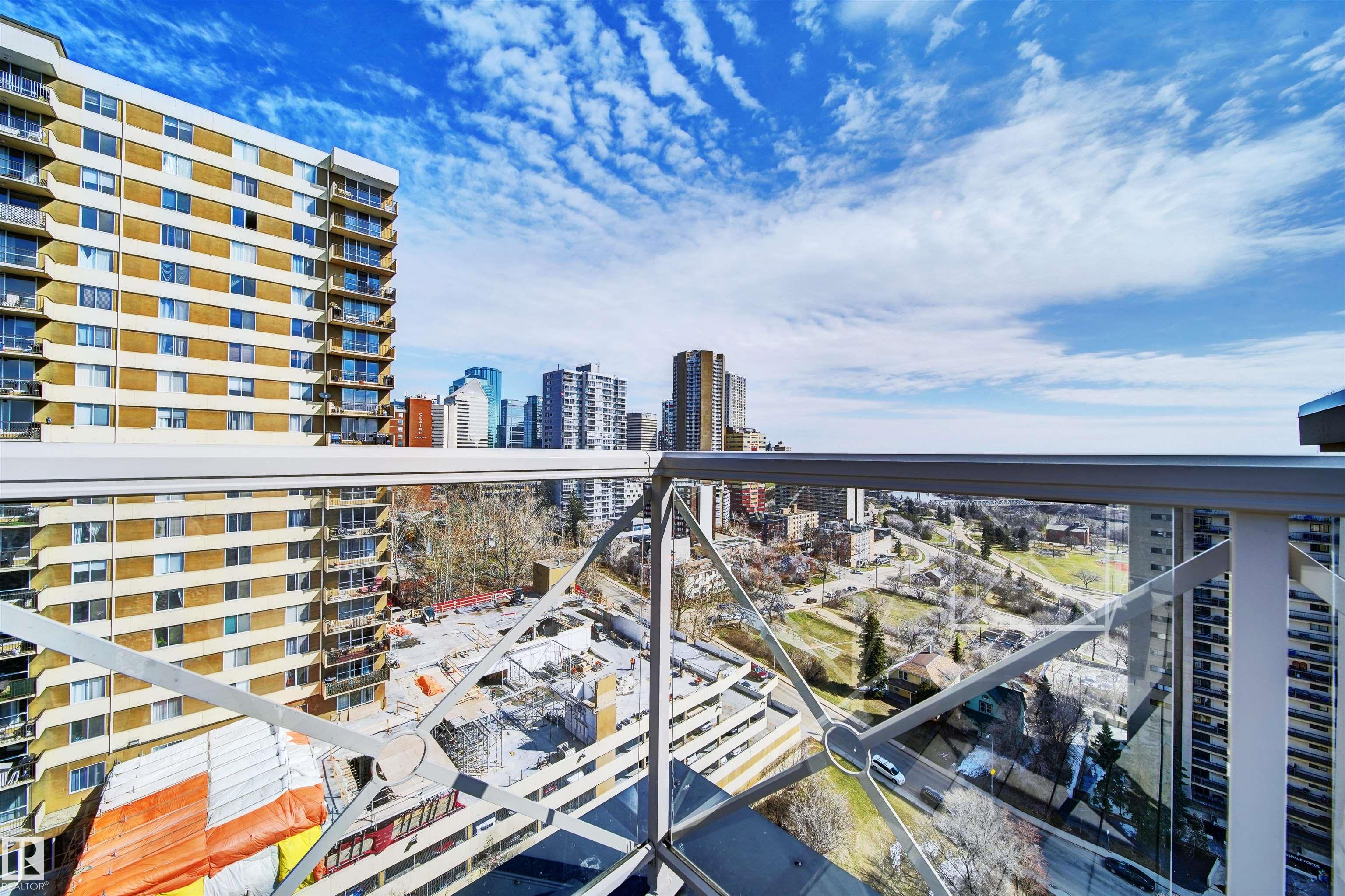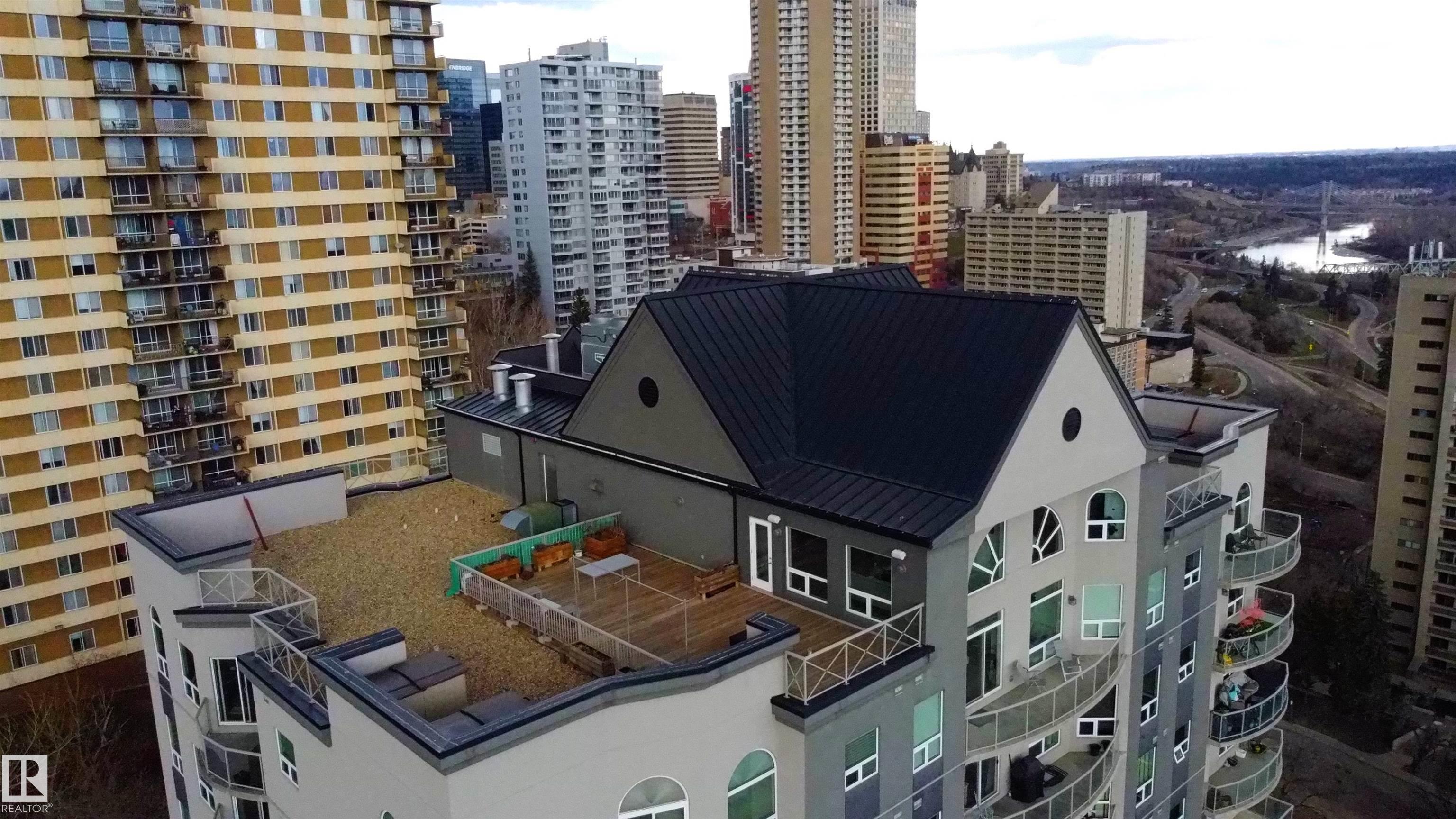 Experience downtown living at its finest in this stunning 1,252 sq. ft. high-rise condo with southwest views of Edmonton's skyline and river valley. This 2 bedroom, 2 bathroom home offers soaring 10 ft ceilings, central air conditioning, rich hardwood, and ceramic tile flooring that create an open and inviting feel. The spacious living room, dining area, and kitchen are filled with natural light from the large windows, making it perfect for both relaxing and entertaining. The primary suite is a true retreat with a walk-in closet, a 4-piece ensuite, and direct access to a private balcony where you can unwind and take in the views. A second bedroom and another full 4-piece bath add comfort and convenience for guests. Step outside your unit and enjoy the rooftop terrace with plenty of space for summer gatherings or quiet evenings under the stars. Just minutes from Victoria Golf Course, the river valley, and shopping along Jasper Avenue, this condo offers not just a home but an exceptional downtown lifestyle.