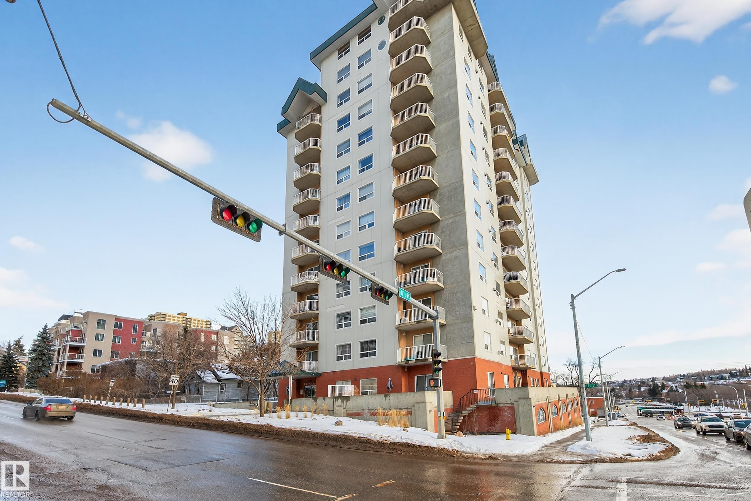 Live in the heart of downtown with stunning river valley views and over 1200 sq ft of living space in this beautiful corner unit condo. This two bedroom, two bathroom unit has titled underground parking and many updates such as flooring, lighting, paint + more! Located on the seventh floor of a concrete high-rise, you are a short walk from the LRT/transit system, Grant MacEwan, Norquest, Rogers Place, and the heart of the river valley trail system. The open-concept galley kitchen features stainless steel appliances, ample cupboard space and a oversized raised eating bar perfect for entertaining. The master bedroom easily fits a king-size bedroom set and boasts a five-piece ensuite with dual sinks. A second bedroom works as a bedroom or home office plus a 3pc bathroom. Enjoy the convenience of in-suite laundry & storage. Relax on your private balcony and take in city and river valley views. The building is pet friendly with board approval. Move in and embrace the ultimate river valley lifestyle.