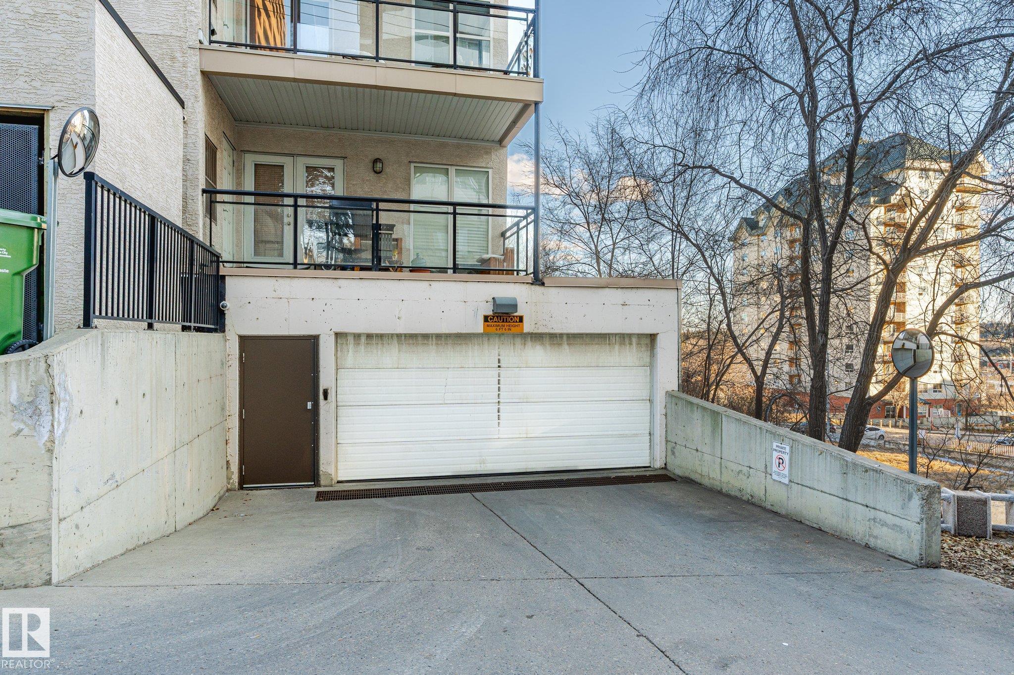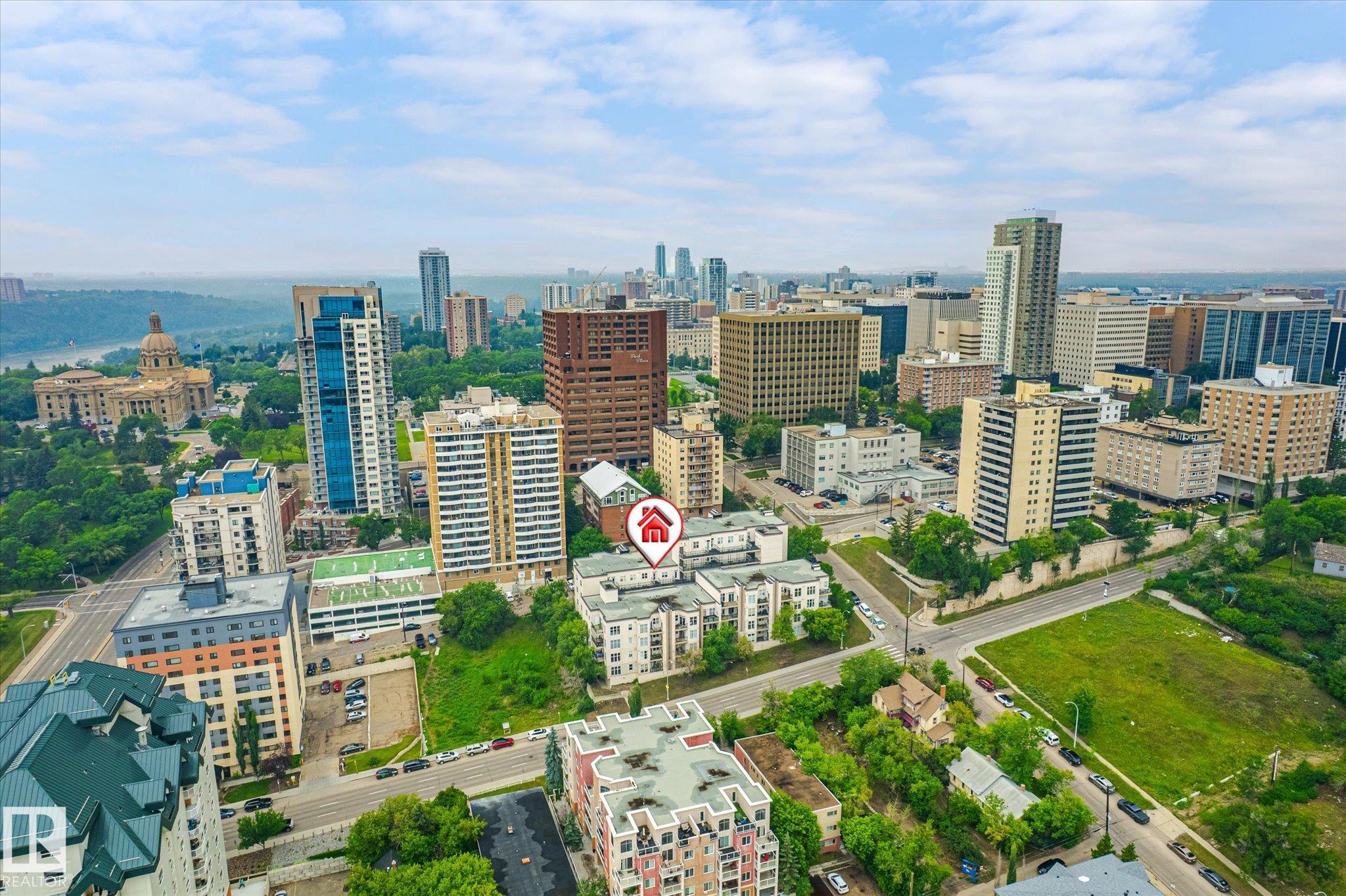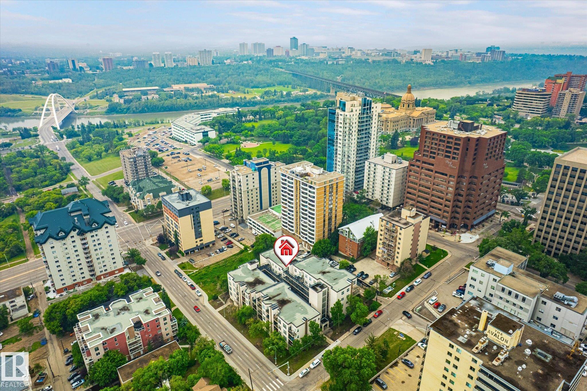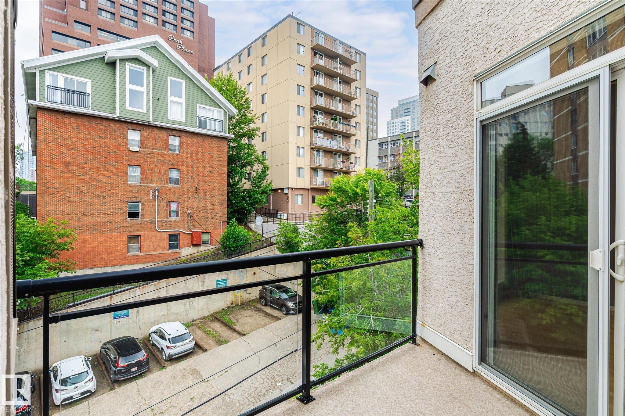 Top floor river valley unit! This contemporary condo is in a fantastic location, steps away from the Legislature, the river valley and the baseball park! As you walk to the suite's front door you will notice that your front entry and 2nd bedroom overlooks the river valley. Inside 9ft ceilings with floor to ceiling windows allows the sunlight in to bounce off of your hardwood flooring. A maple island kitchen with eating bar and tons of counters and cabinets is perfect for the chef in the family and it is also nicely equipped with stainless steel appliances. Patio doors lead to a balcony that faces west, A/C will keep you cool. The large master bedroom has a walk in closet and a full ensuite with tile tub surround and tile flooring. Main bathroom with tile flooring and shower, stackable washer and dryer and secure underground parking stall round out the features. There is ample visitor parking in the alley on the west side of the building. Some pictures are virtually staged.