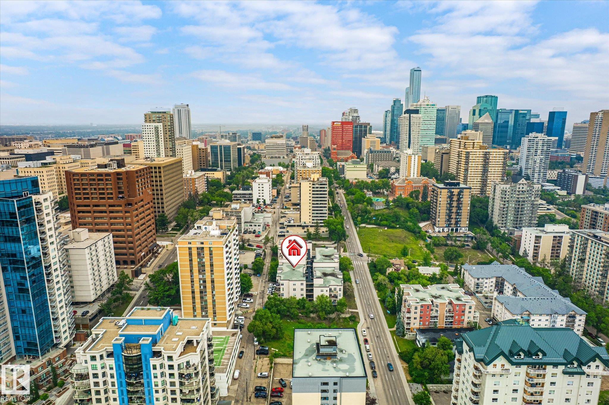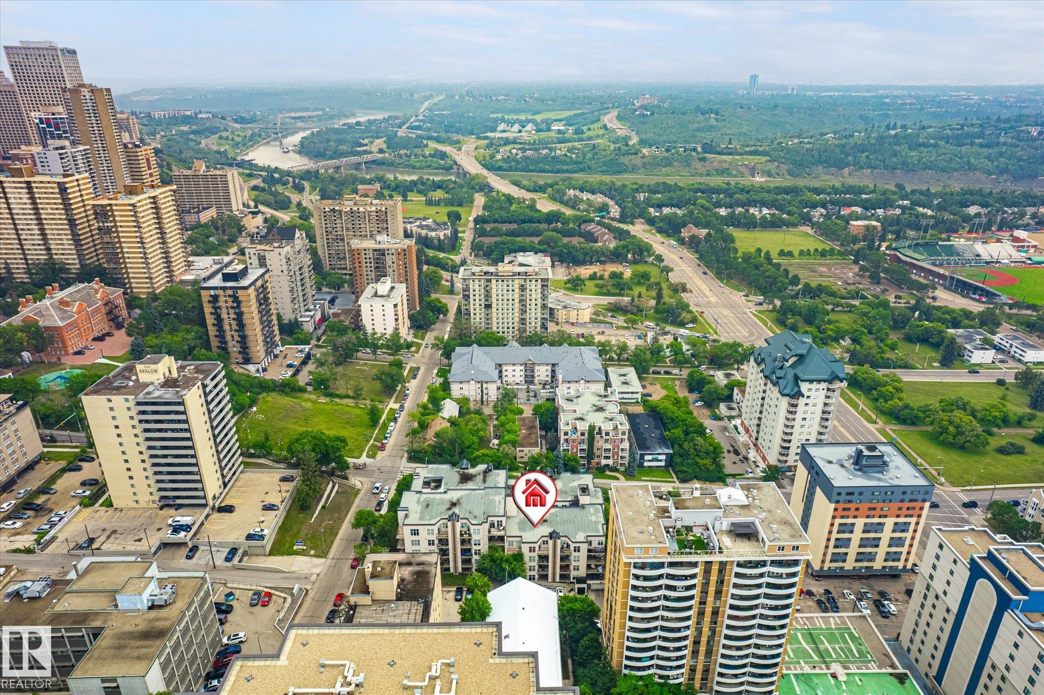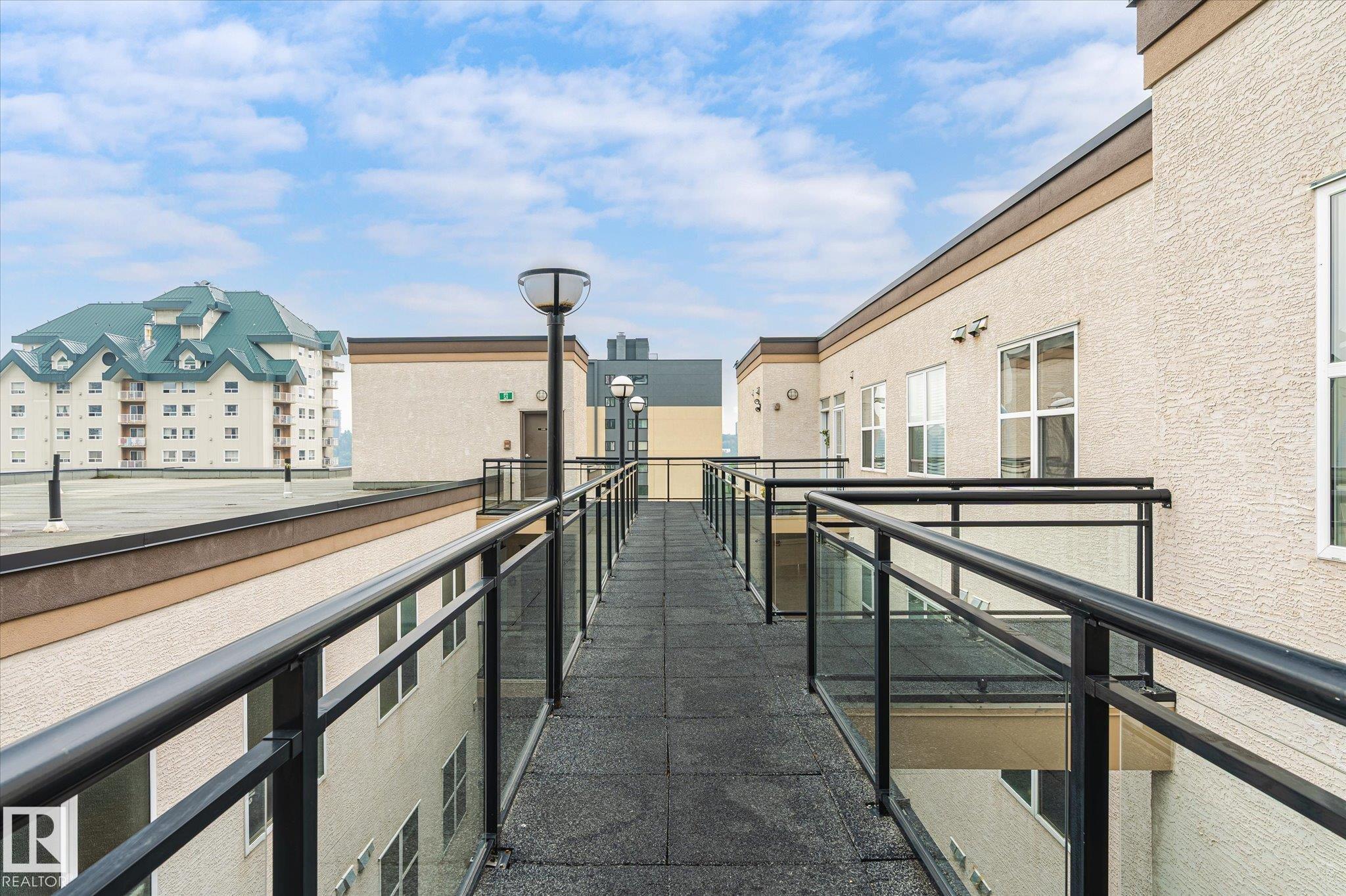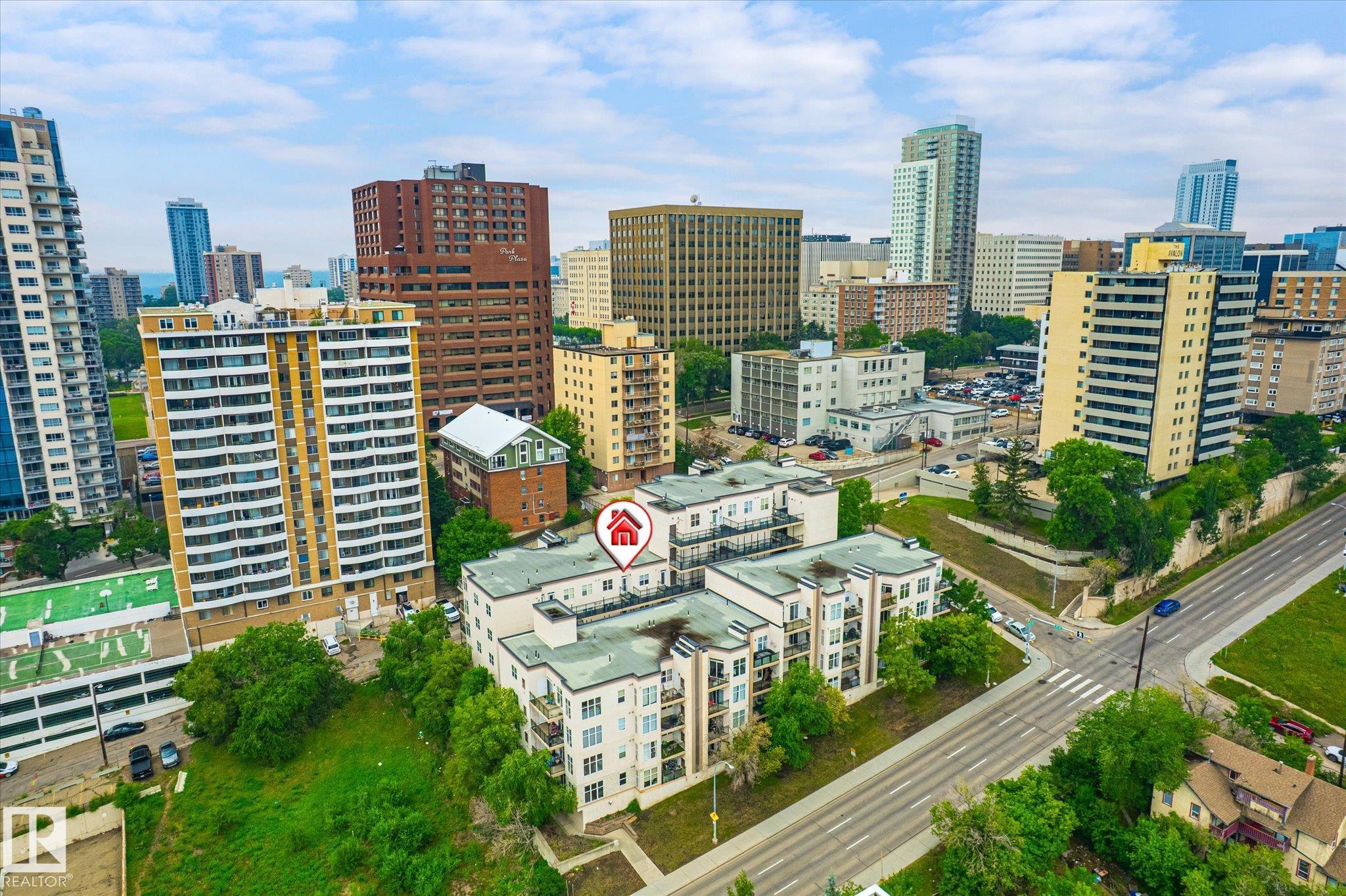 Top floor river valley unit! This contemporary condo is in a fantastic location, steps away from the Legislature, the river valley and the baseball park! As you walk to the suite's front door you will notice that your front entry and 2nd bedroom overlooks the river valley. Inside 9ft ceilings with floor to ceiling windows allows the sunlight in to bounce off of your hardwood flooring. A maple island kitchen with eating bar and tons of counters and cabinets is perfect for the chef in the family and it is also nicely equipped with stainless steel appliances. Patio doors lead to a balcony that faces west, A/C will keep you cool. The large master bedroom has a walk in closet and a full ensuite with tile tub surround and tile flooring. Main bathroom with tile flooring and shower, stackable washer and dryer and secure underground parking stall round out the features. There is ample visitor parking in the alley on the west side of the building. Some pictures are virtually staged.
