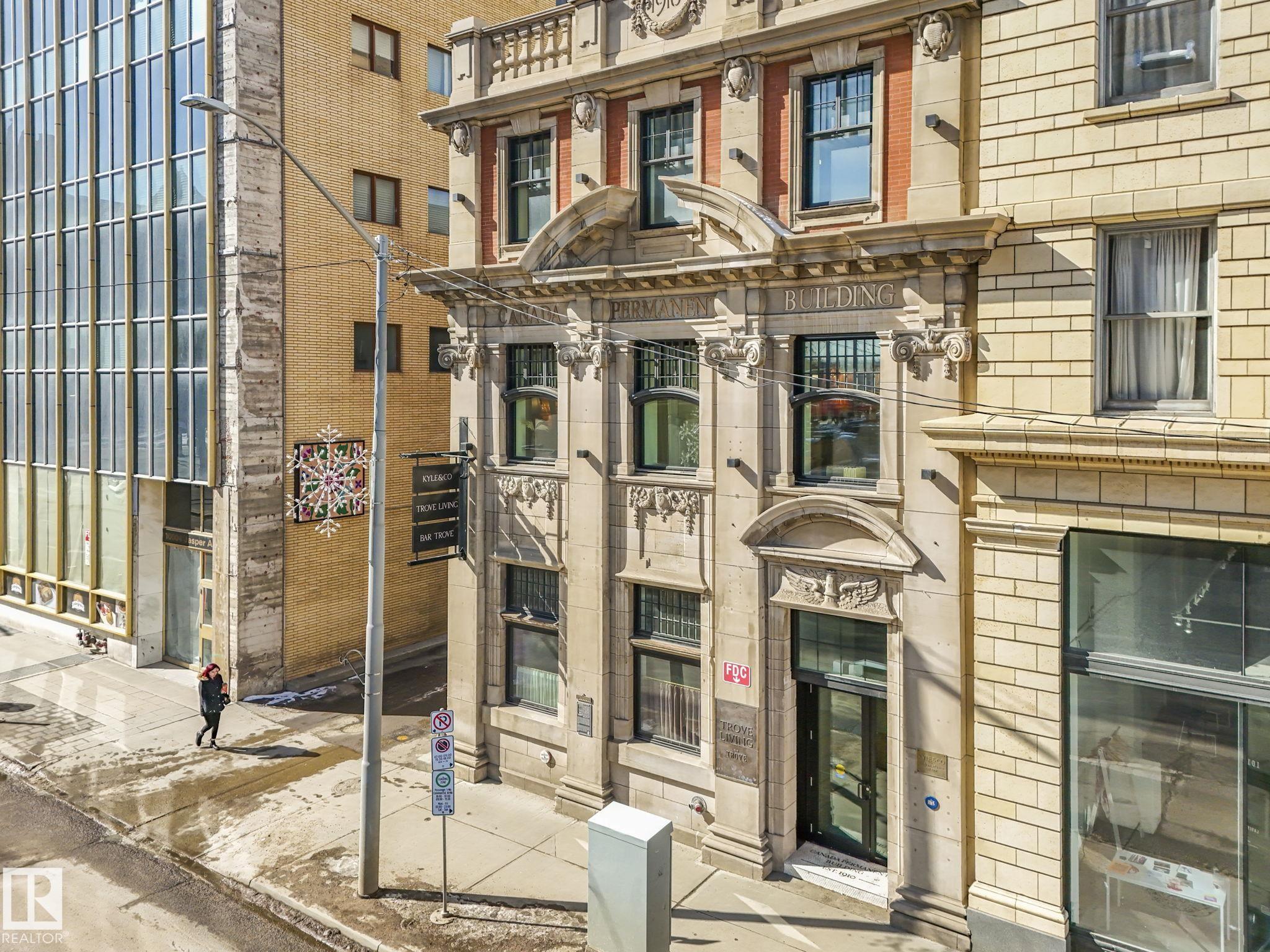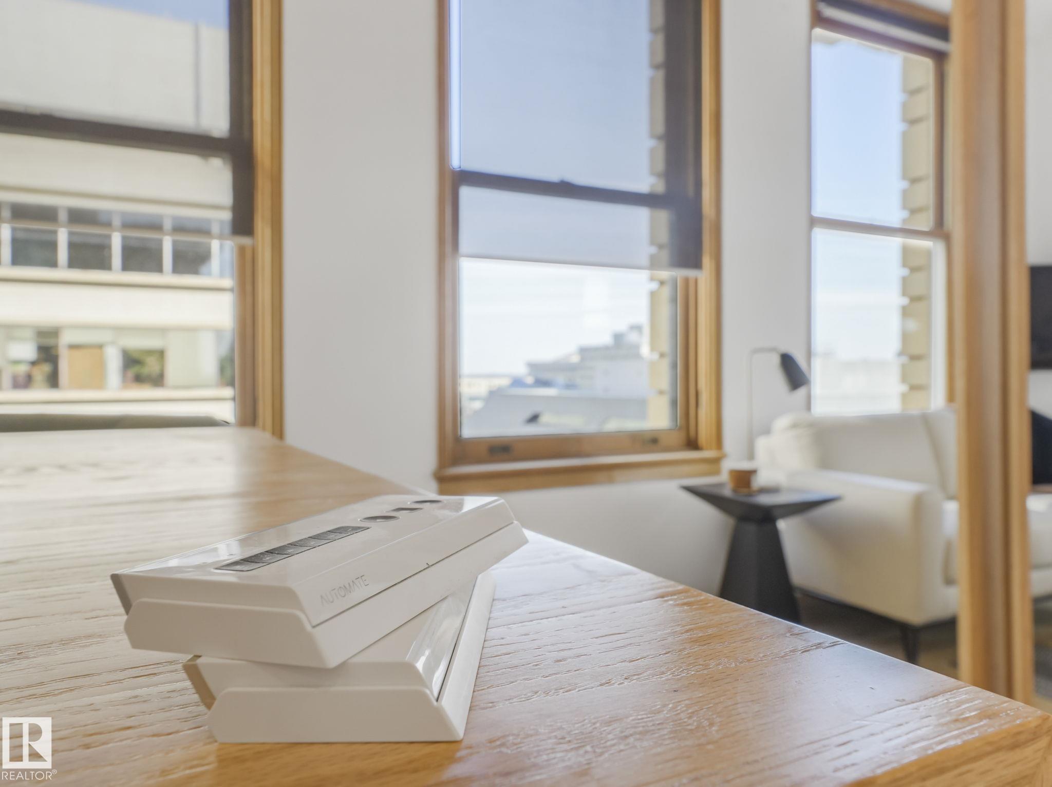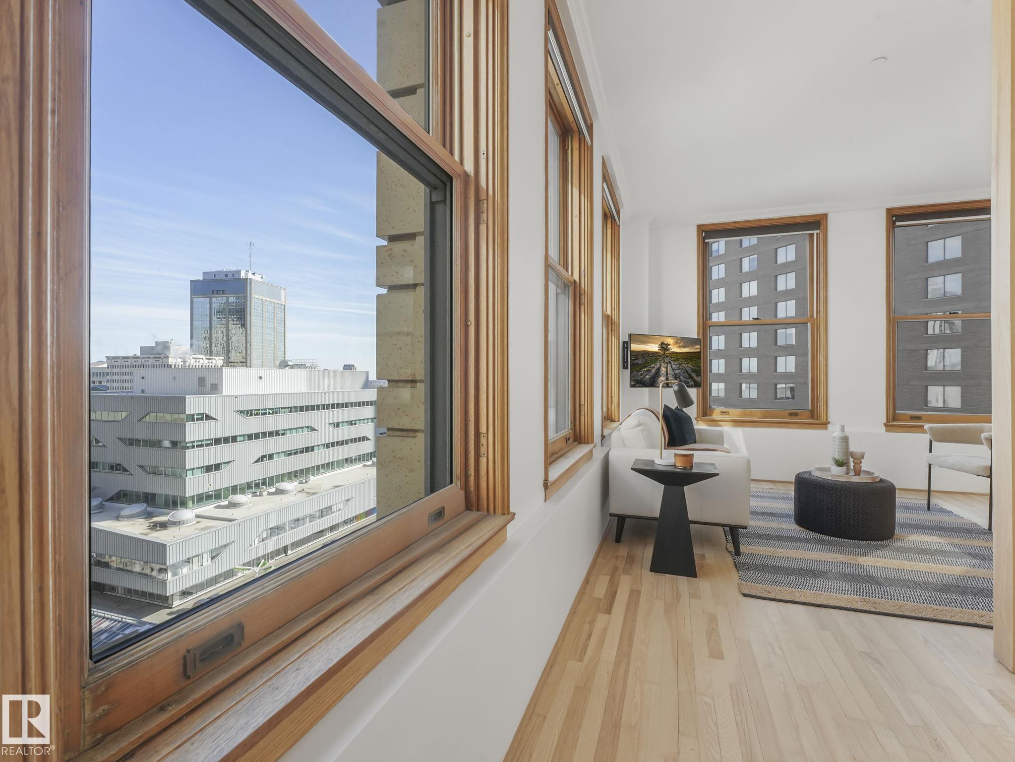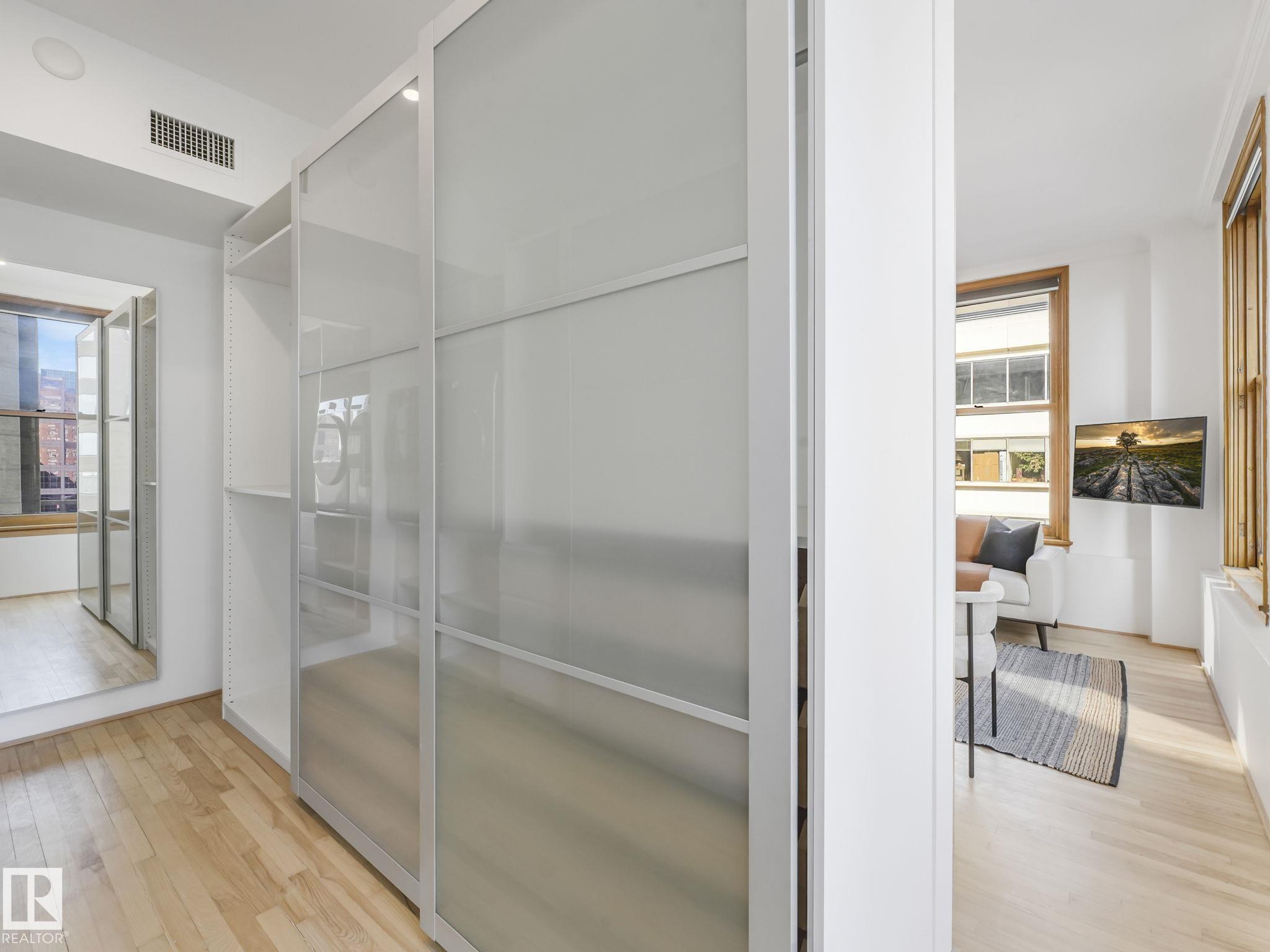 Gorgeous EXECUTIVE LOFT in The McLeod Building. 1915 CHARACTER with CONTEMPORARY VIBE in the CORE! This UNIQUE CORNER UNIT on the 8th FLOOR (sub-penthouse) features soaring 9.5 FT Ceilings, Hardwood Flooring & SEVEN 84"High Chicago-style windows that flood the space with natural light... all c/w MOTORIZED BLINDS! The CLEAN LINE KITCHEN features a new electric downdraft stove, an integrated fridge, low-profile microwave/hood fan & a commercial grade built-in Ice-maker. Island has casual seating and is ideal for both serving & entertaining while providing bonus storage space! THE BEAUTIFUL NEW CUSTOM MADE Murphy Bed/Wall system easily tucks up to give you a nice living area. Bathroom features a LARGE LUXURY STEAM SHOWER. Amazing WALK-IN CLOSET WARDROBE AREA WITH NEW IN-SUITE LAUNDRY! GREAT CITY VIEWS and STEPS FROM LRT, Great Restaurants, Art Gallery, Shopping, Rogers Place & River Valley trail system & more! All-Inclusive CONDO FEE INCLUDES ELECTRICAL, HEAT (GAS), WATER, SEWER, Res-Fund, Pro-Mgmt, Ext-Maint.