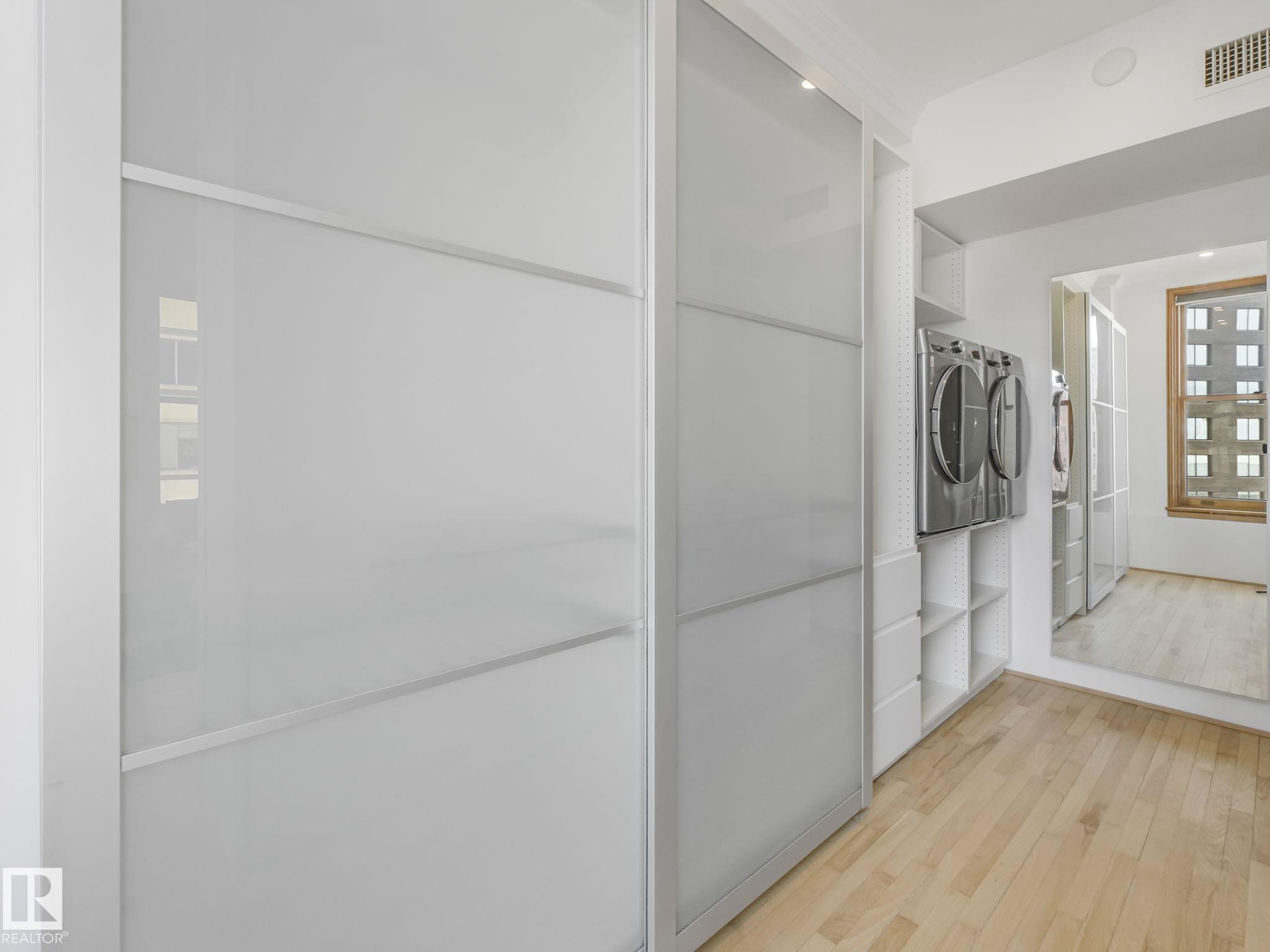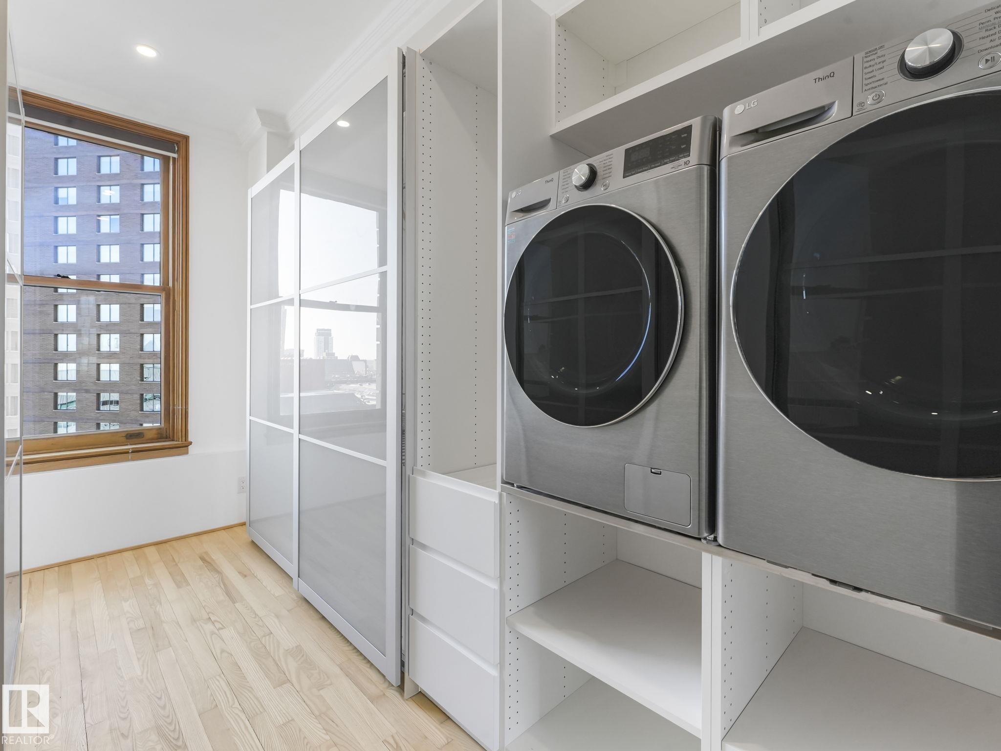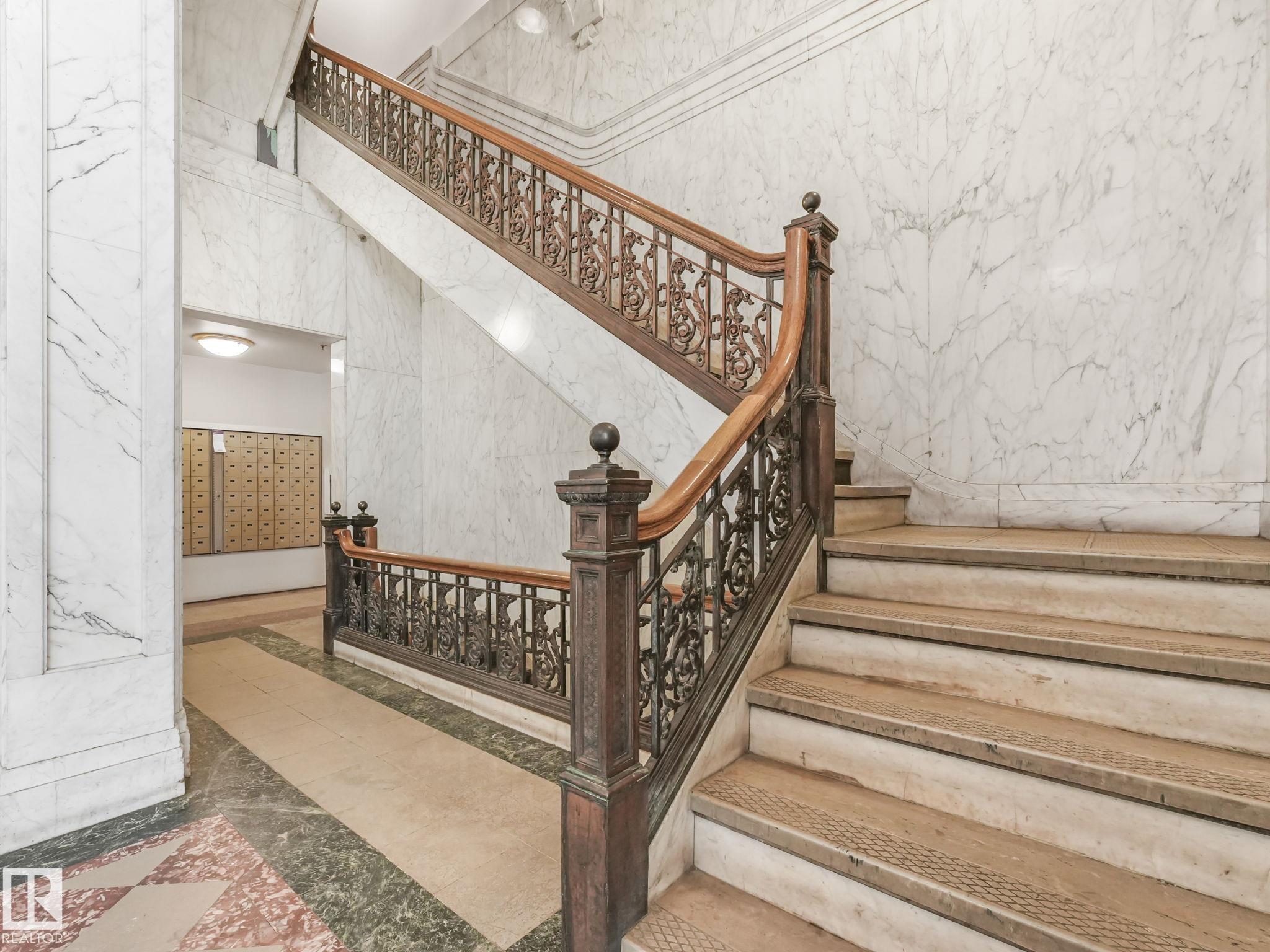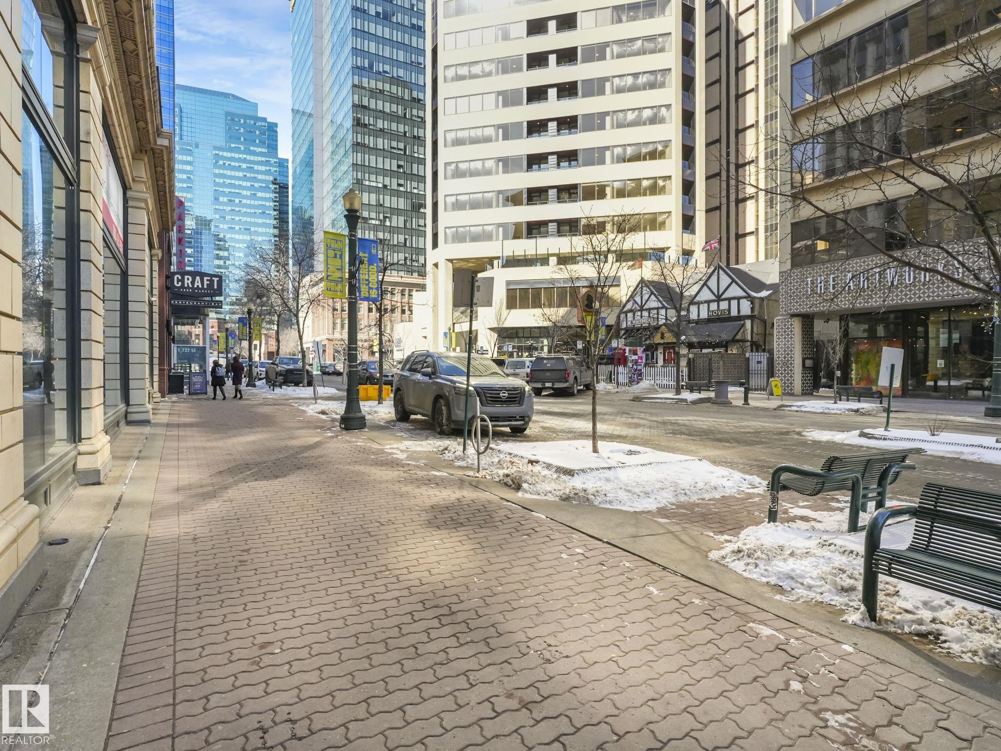 Gorgeous EXECUTIVE LOFT in The McLeod Building. 1915 CHARACTER with CONTEMPORARY VIBE in the CORE! This UNIQUE CORNER UNIT on the 8th FLOOR (sub-penthouse) features soaring 9.5 FT Ceilings, Hardwood Flooring & SEVEN 84"High Chicago-style windows that flood the space with natural light... all c/w MOTORIZED BLINDS! The CLEAN LINE KITCHEN features a new electric downdraft stove, an integrated fridge, low-profile microwave/hood fan & a commercial grade built-in Ice-maker. Island has casual seating and is ideal for both serving & entertaining while providing bonus storage space! THE BEAUTIFUL NEW CUSTOM MADE Murphy Bed/Wall system easily tucks up to give you a nice living area. Bathroom features a LARGE LUXURY STEAM SHOWER. Amazing WALK-IN CLOSET WARDROBE AREA WITH NEW IN-SUITE LAUNDRY! GREAT CITY VIEWS and STEPS FROM LRT, Great Restaurants, Art Gallery, Shopping, Rogers Place & River Valley trail system & more! All-Inclusive CONDO FEE INCLUDES ELECTRICAL, HEAT (GAS), WATER, SEWER, Res-Fund, Pro-Mgmt, Ext-Maint.