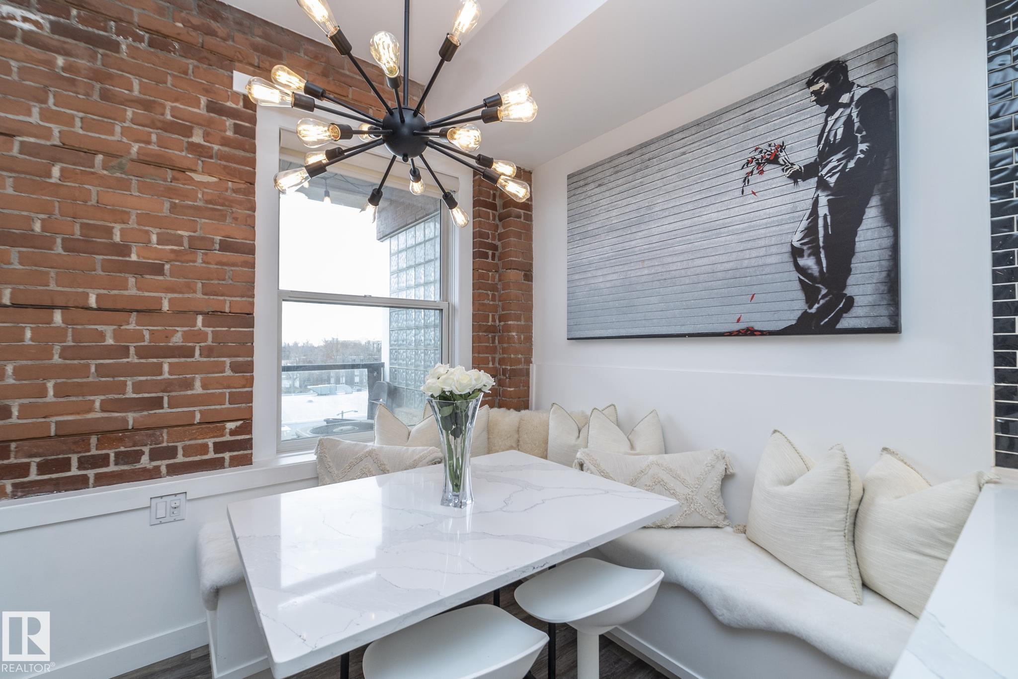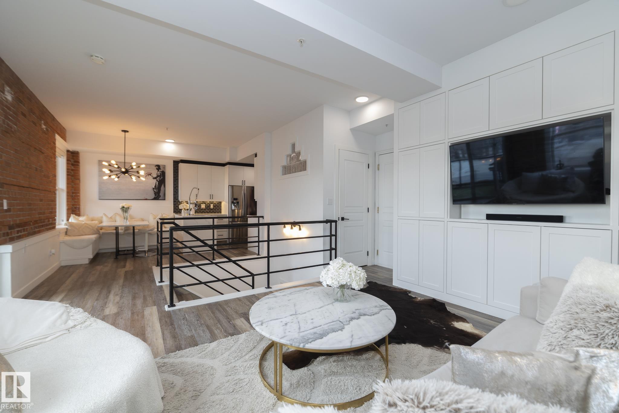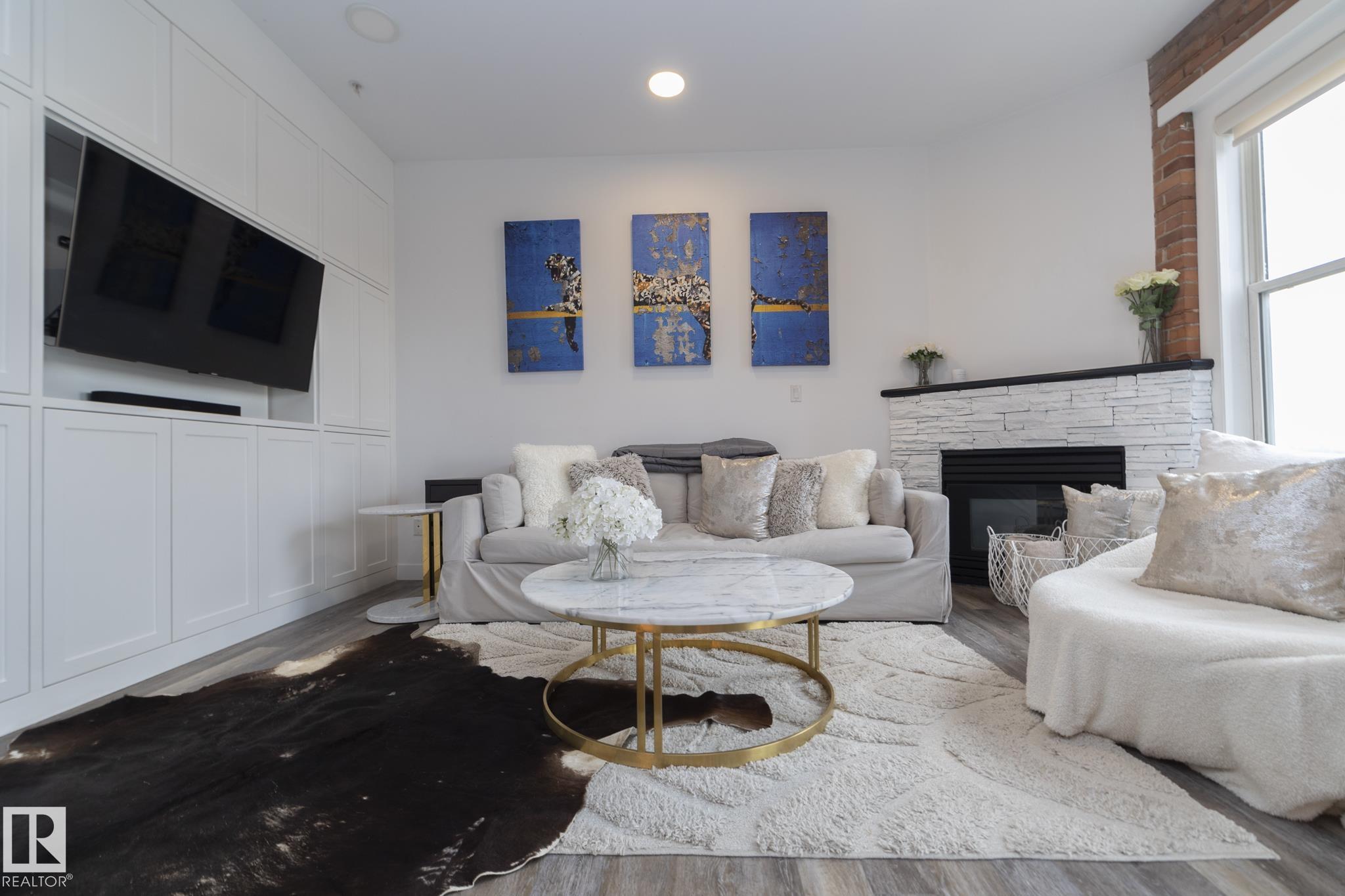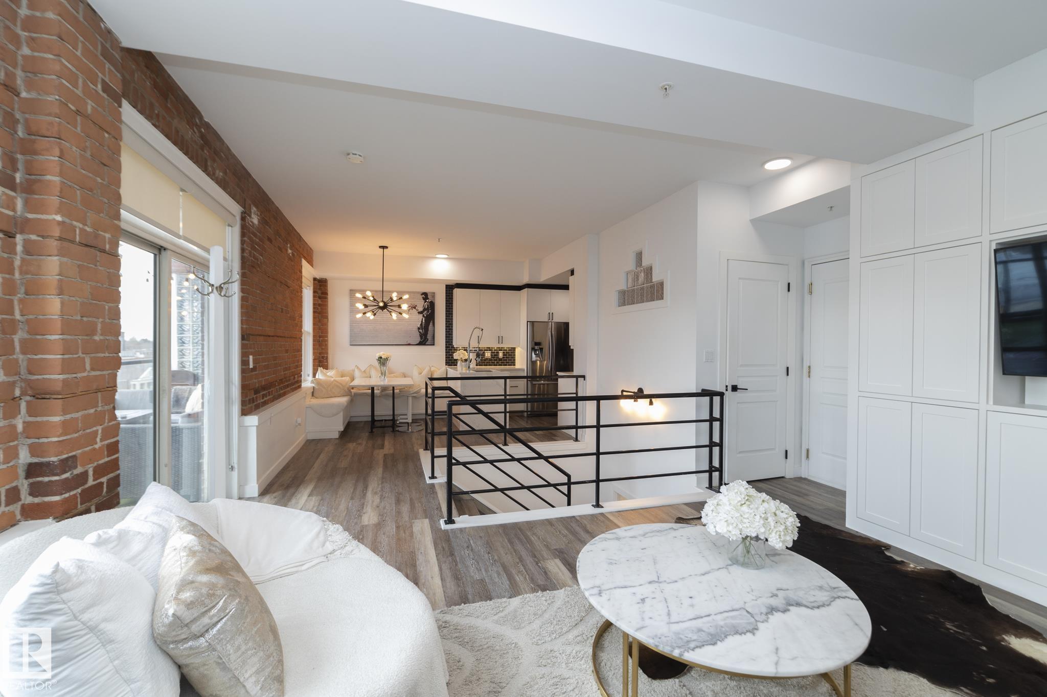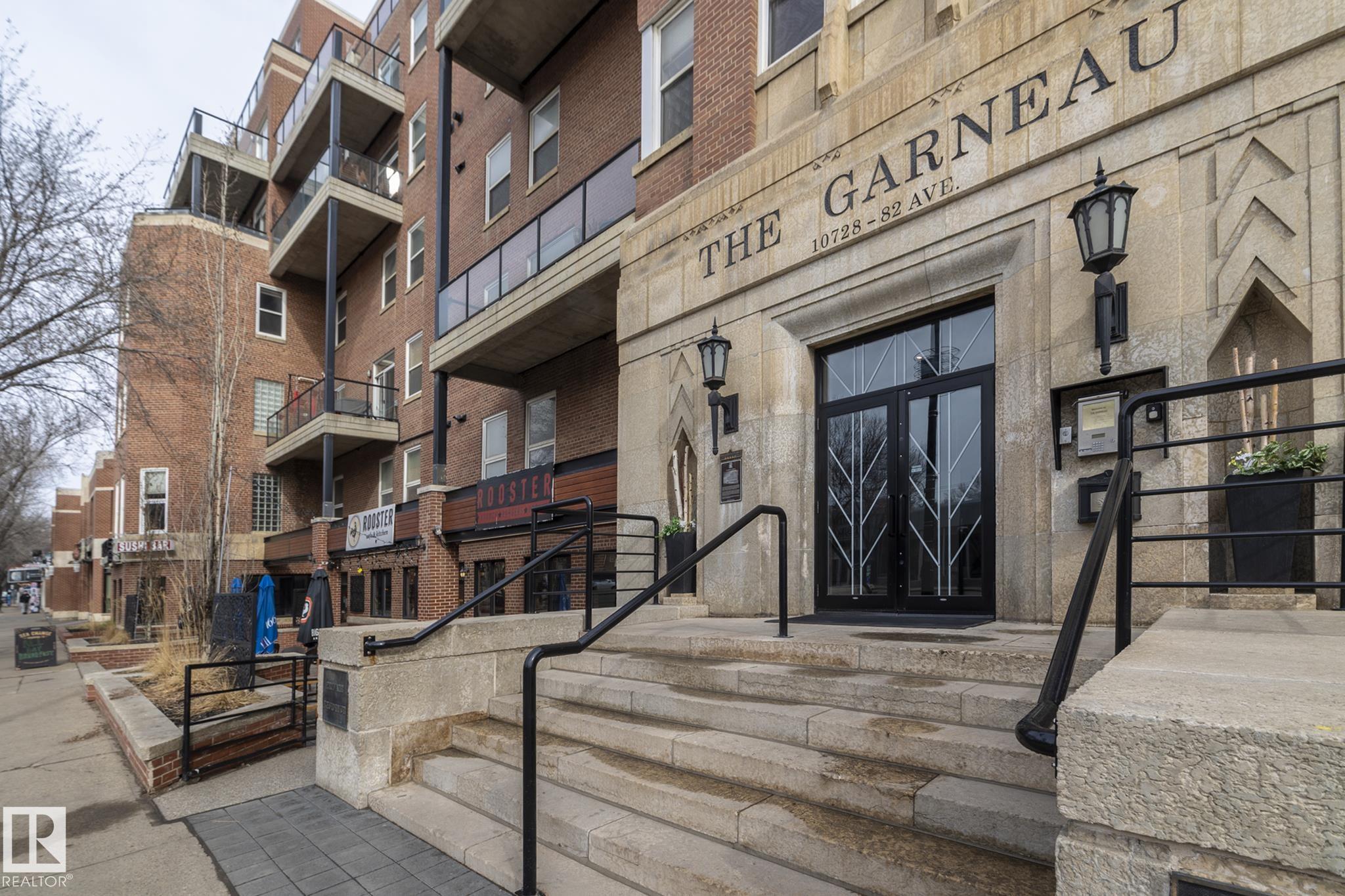 Stunning top-to-bottom renovation in the sought-after Garneau building! This stylish New York Chic inspired 1,100 sq ft 2-storey condo features luxury vinyl plank flooring, quartz counters, exposed brick & sleek chrome & black accents throughout. The bright, south-facing unit offers large windows with sweeping Whyte Ave views and floods of natural light. The modern kitchen boasts stainless steel appliances, gas stove, and a custom built-in dining table with bench seating and storage. Cozy up by the stone-facing gas fireplace in the open-concept living room, complete with a built-in media cabinet and 3 piece bathroom. Downstairs, find 2 bedrooms including a 5-piece ensuite with a jetted soaker tub, in the spacious primary suite with walk-in closet & in-suite laundry. With 2 parking stalls & unbeatable walkability to shops, cafes, and restaurants, this is urban living at its finest--just minutes to U of A, transit, and easy access to anywhere in the city! Property was rented out for almost $50,000 last year!