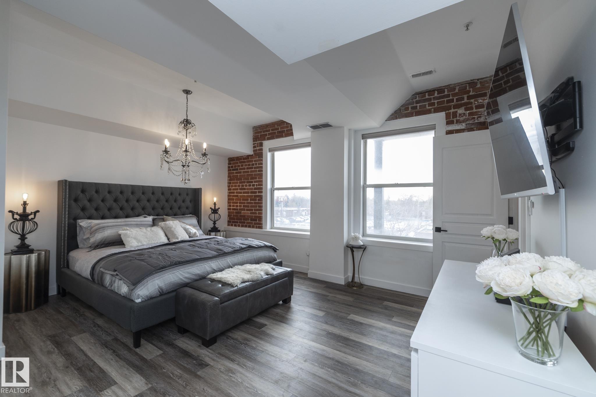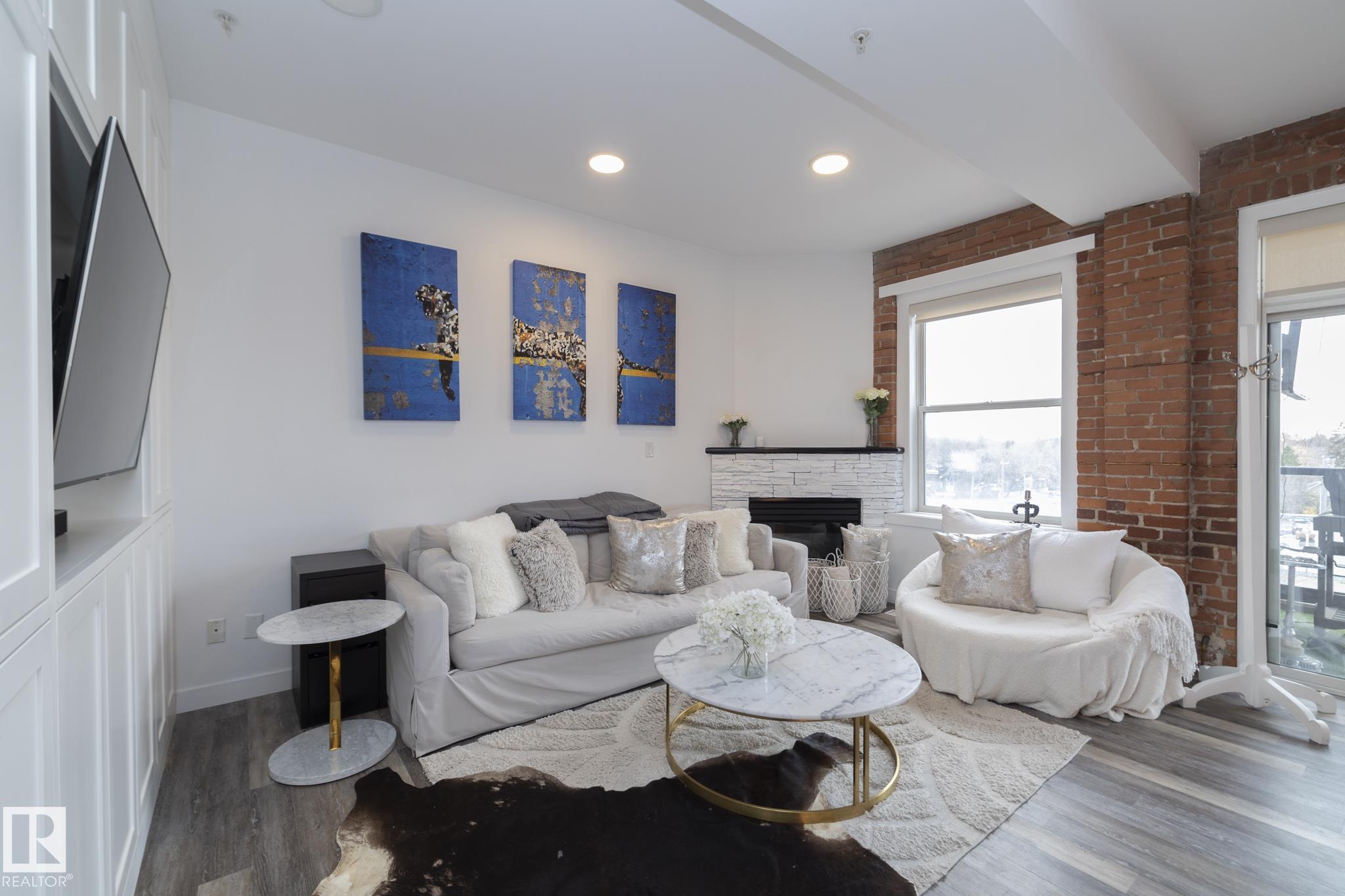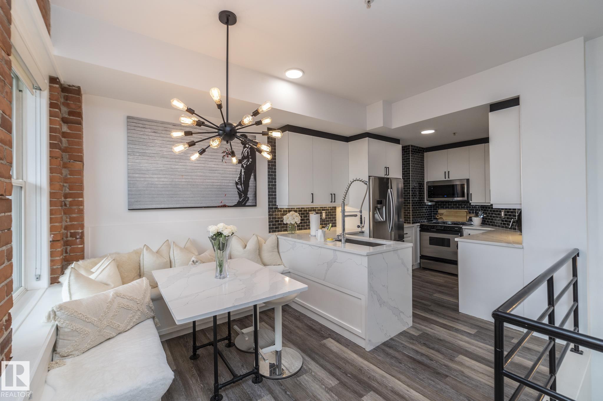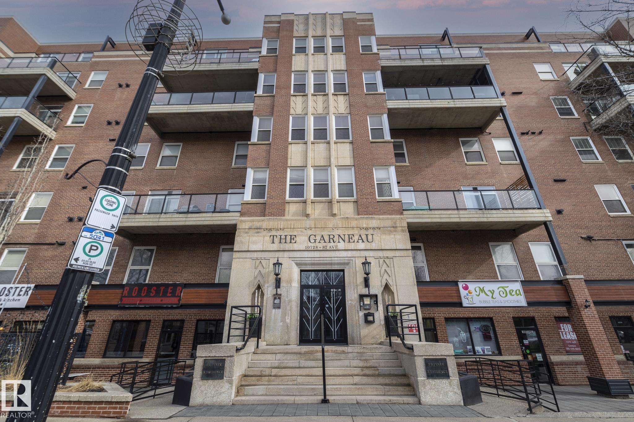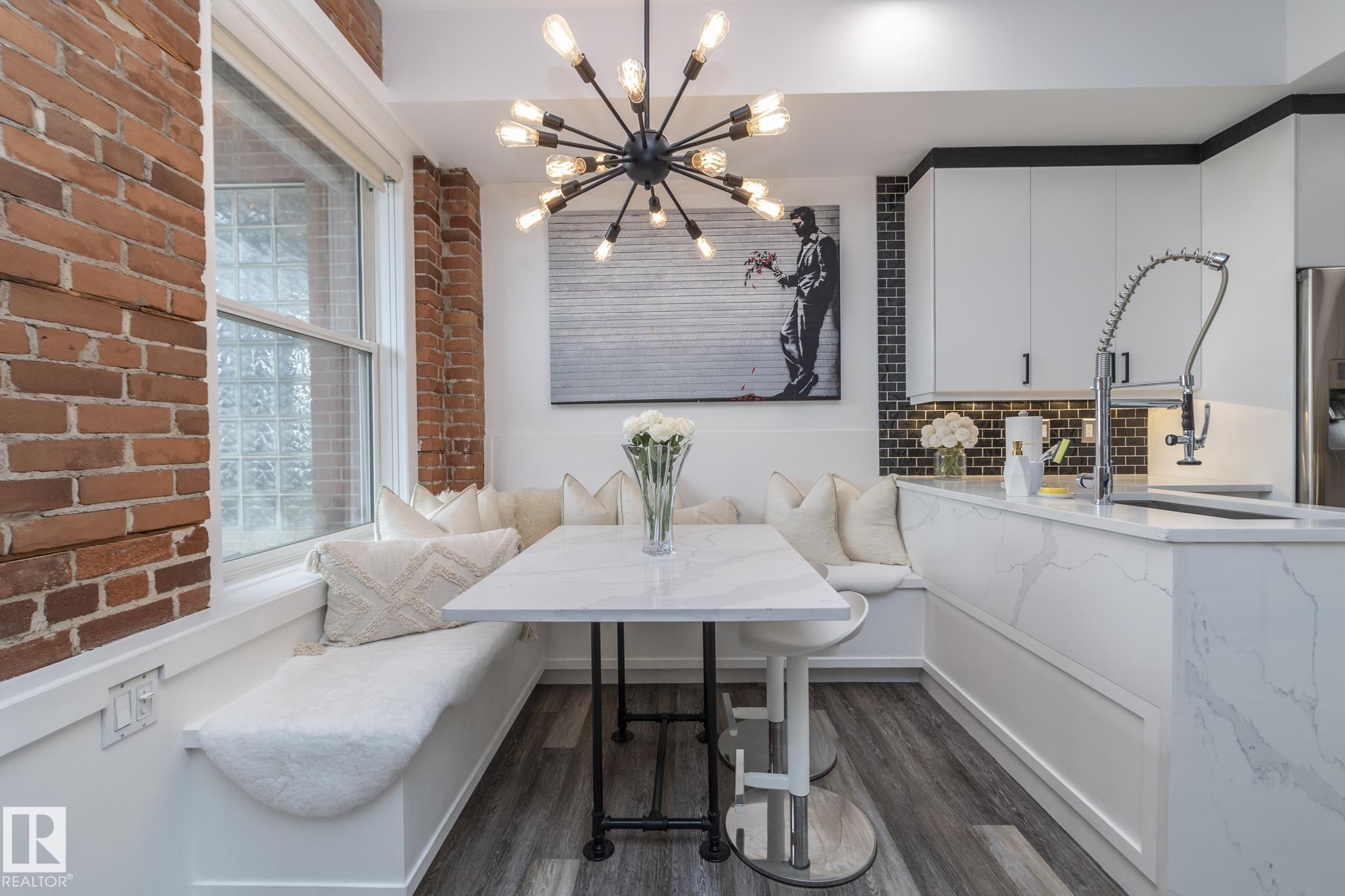 Stunning top-to-bottom renovation in the sought-after Garneau building! This stylish New York Chic inspired 1,100 sq ft 2-storey condo features luxury vinyl plank flooring, quartz counters, exposed brick & sleek chrome & black accents throughout. The bright, south-facing unit offers large windows with sweeping Whyte Ave views and floods of natural light. The modern kitchen boasts stainless steel appliances, gas stove, and a custom built-in dining table with bench seating and storage. Cozy up by the stone-facing gas fireplace in the open-concept living room, complete with a built-in media cabinet and 3 piece bathroom. Downstairs, find 2 bedrooms including a 5-piece ensuite with a jetted soaker tub, in the spacious primary suite with walk-in closet & in-suite laundry. With 2 parking stalls & unbeatable walkability to shops, cafes, and restaurants, this is urban living at its finest--just minutes to U of A, transit, and easy access to anywhere in the city! Property was rented out for almost $50,000 last year!