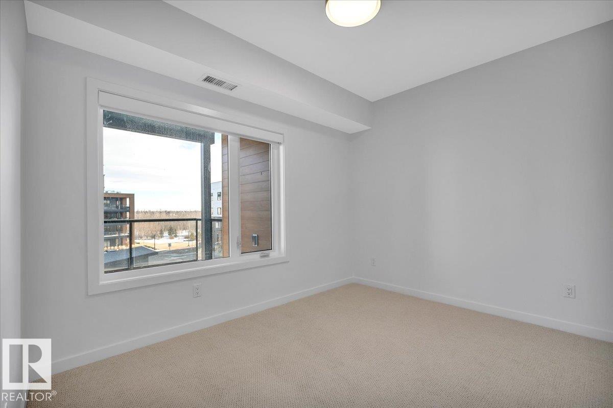 Enjoy the sweet life in this BRAND NEW, NEVER LIVED IN 2 BR/2 BATH, partial ravine view unit in "Evolve" at Edge at Larch Park. High end finishings throughout this bright open unit including vinyl Plank flooring, quartz counter tops in the kitchen both bathrooms and laundry room. Spacious primary bedroom, spa like 4 piece ensuite WITH MASSIVE WALK IN SHOWER, and dream walk in closet with custom shelves and hanging bars. Stainless steel appliances, generous cabinets and island with Silgranite sink. Black out blinds in both bedrooms and Duolite pleated shade in the living area. FABULOUS AMENITIES THAT HAVE TO BE SEEN! Games room, Chefs Kitchen, Owners Lounge, Gym, Craft/Art Studio, guest suites and ROOF TOP PATIO WITH SPECTACULAR VIEWS. Live your best life in this fabulous building and location. Adjacent to MacTaggart ravine and miles of trails. Close to amenities including shopping, restaurants, Terwillegar Rec centre, golf, schools, public transit, parks and proximity to YEG. Welcome Home!