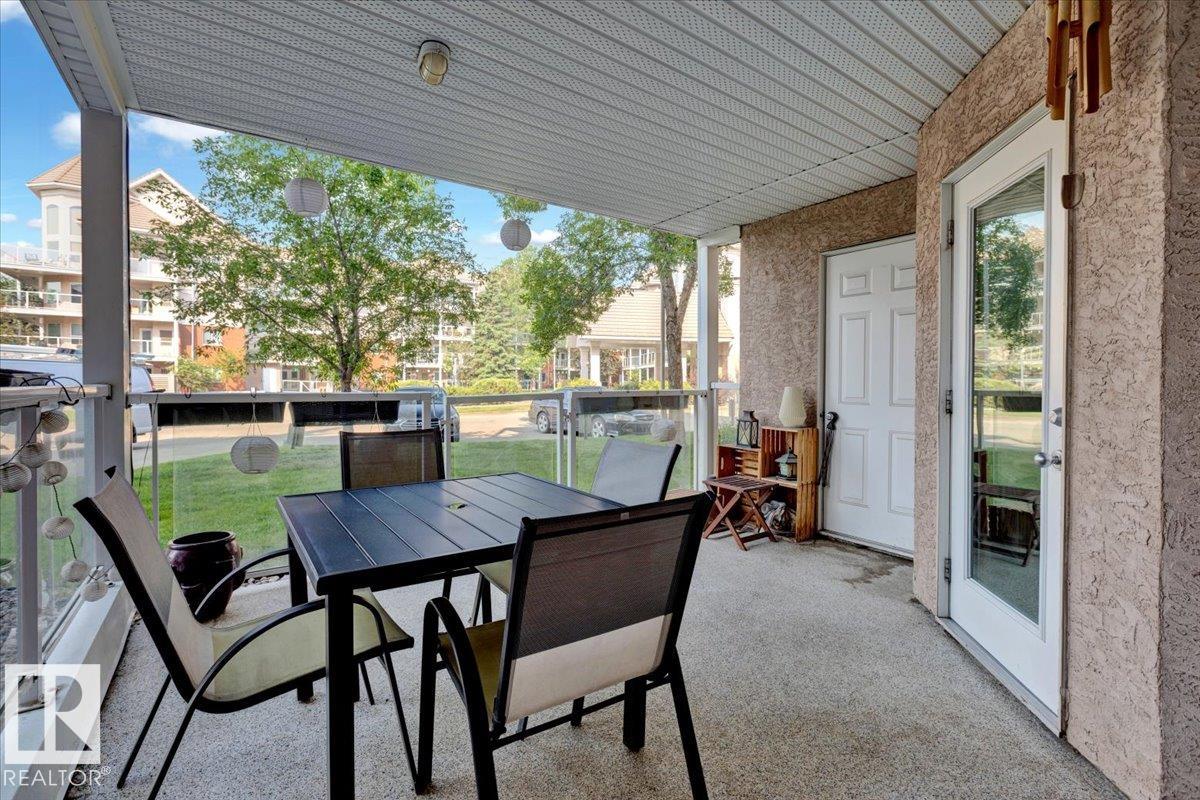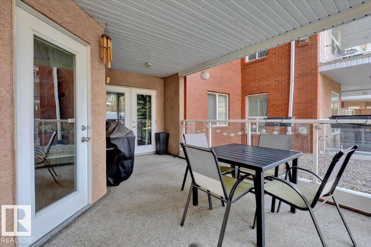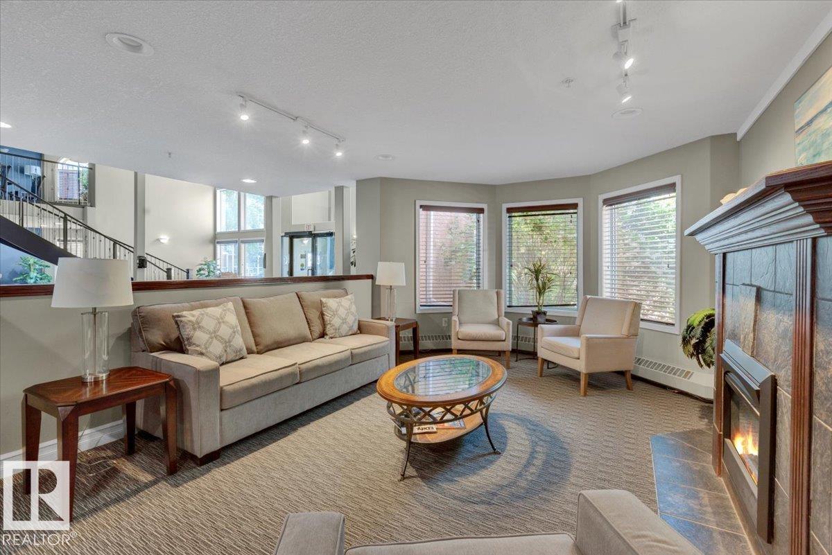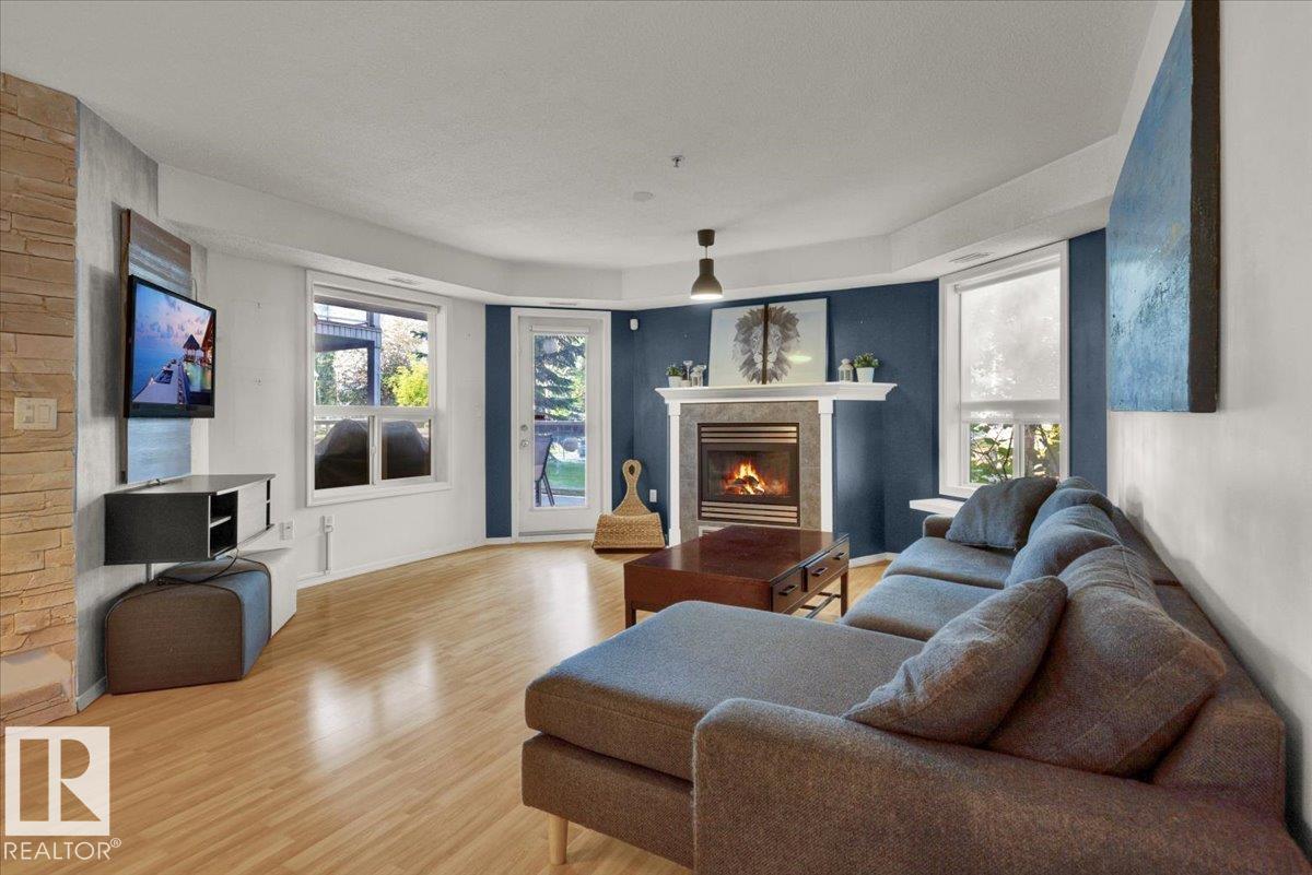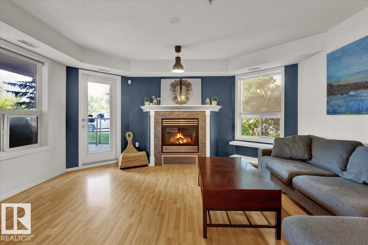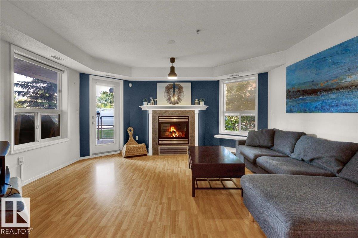 Welcome Home! Terrific Riverdale Location direct access to River Valley Trails with easy commutes Downtown and to the rest of the city. Nestled softly in one of Edmonton's most sought after communities. Ground floor unit with large wrap around patio. 18+ Adult Living complex and well cared for property boast Adult Living with tons to be proud of. Underground parking with storage locker and car wash. Grande entrance way leads to common area room, full gym, and pool table on the balcony overlooking main floor. Plenty of visitor parking in terrific turn about entrance way. Large open concept unit with in suite laundry. Full kitchen with pantry and kitchen island. Ample room for dining table. Huge living room leads to large wrap around patio. Large bedrooms and 2 full bathrooms. Master bedroom has plenty of storage and closet space leading to ensuite bathroom with tub. All appliances included. Central AC, Heat and Water Included in Fees, Pet Friendly. Fireplace sold as is. Wonderful opportunity and location!