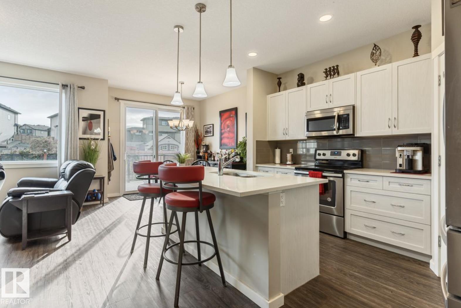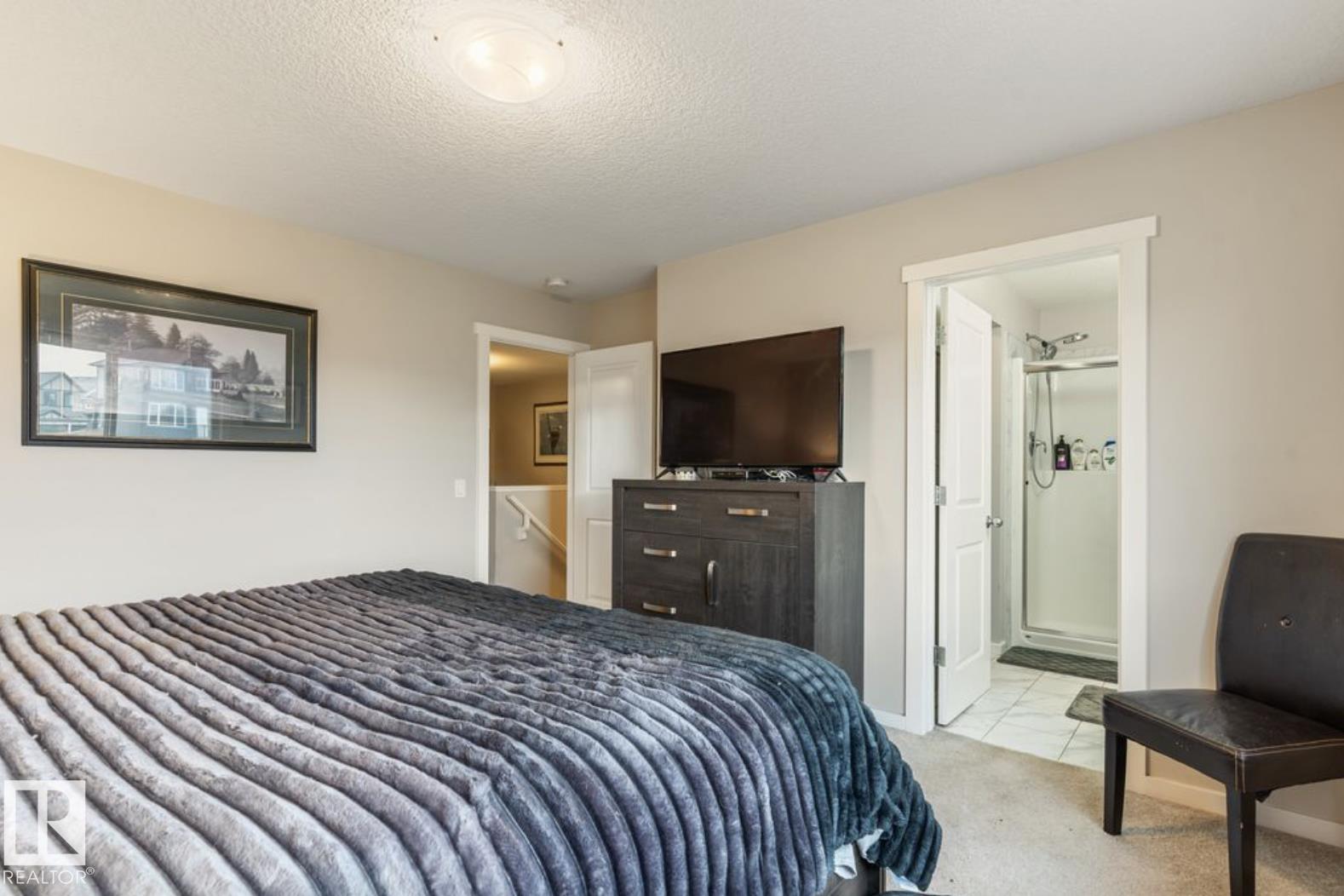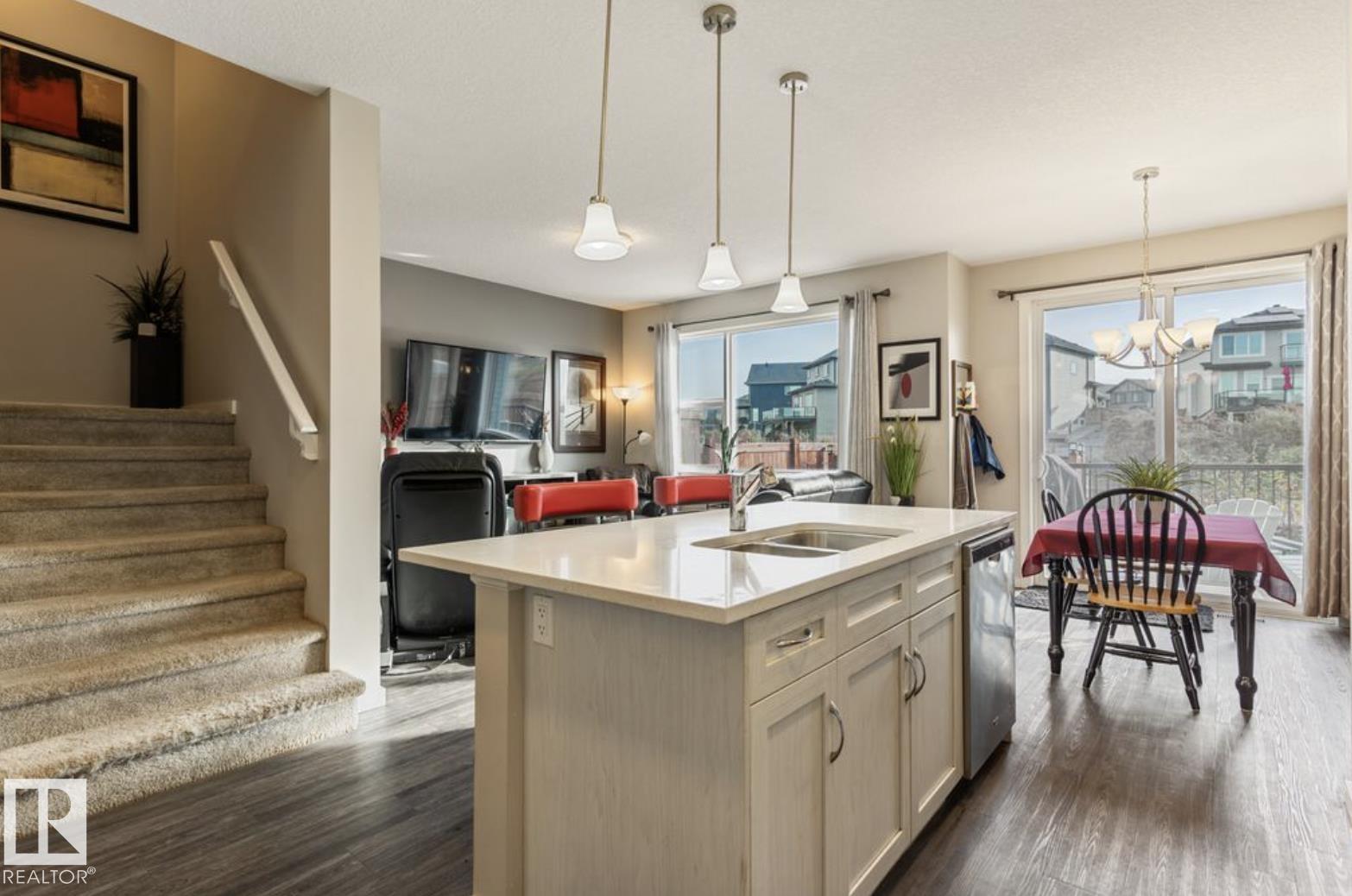 Welcome to this stunning 3-bedroom, 3-bath half duplex in the desirable community of Trumpeter, offering over 1,600 sq. ft. of modern living space and a fully insulated double-car garage. The main floor features 9-ft ceilings throughout and a bright open-concept design that seamlessly connects the kitchen, dining area, and living room, along with a convenient main-floor washroom. The kitchen impresses with snowy white quartz countertops and elegant beige cabinetry, creating a perfect blend of warmth and sophistication. Upstairs you'll find two additional bathrooms, three spacious bedrooms with ample closet space, and a versatile bonus room ideal for family entertainment or a home office. The professionally landscaped yard offers a sizeable deck and hot tub, providing the perfect space to relax and unwind. This home combines style, comfort, and functionality in one of Edmonton's most sought-after neighbourhoods.