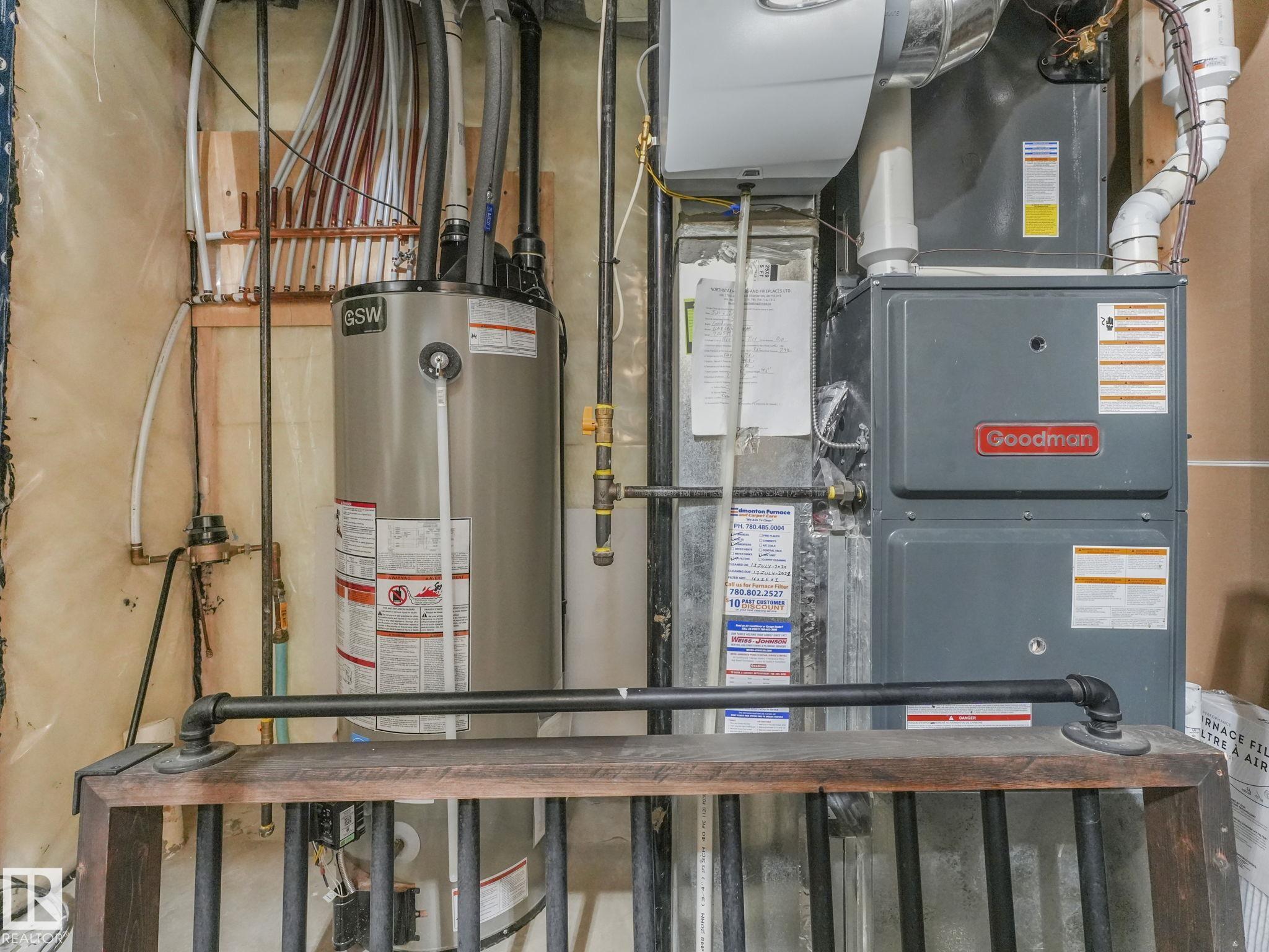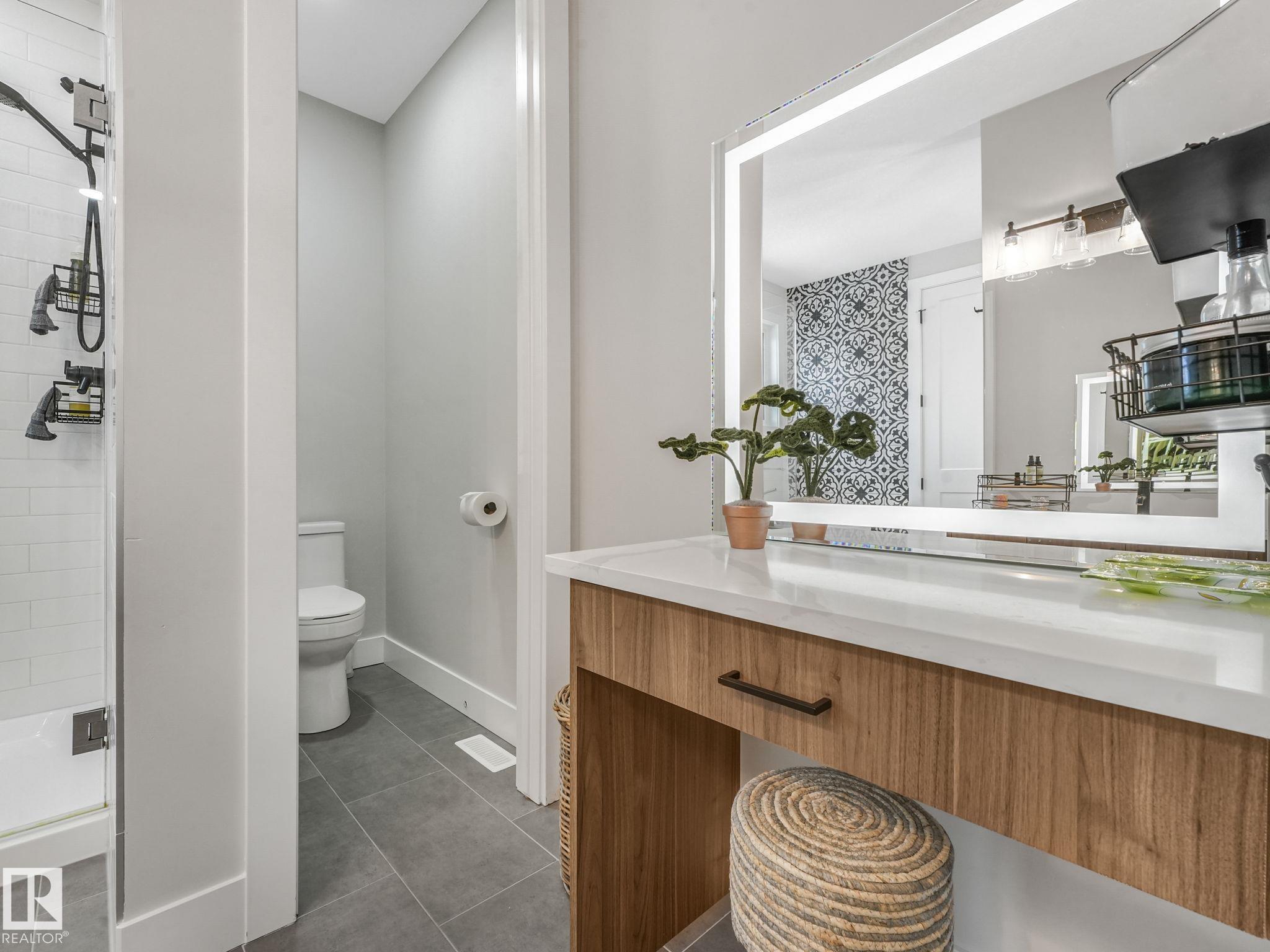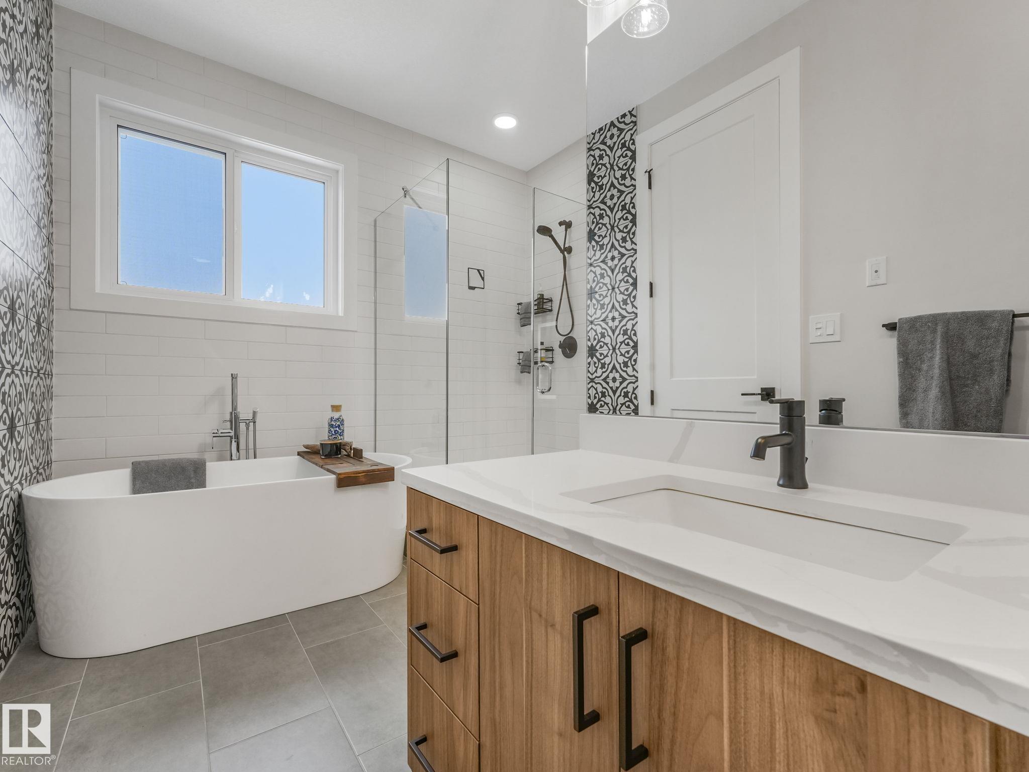 Prime Location! Private and sunny south backyard on a top-of-the-bank walkway adjacent to a Natural Conservation area. Enjoy privacy, natural light and wildlife views from your 2 level deck with pergola. Inside, this upgraded home features an open concept design with a $20,000 appliance upgrade including an induction cooktop on a custom-built cabinet, and in the new butler pantry there is a dual wall/convection oven beside a pullout pantry. The large custom walnut island extension is perfect for entertaining. All 3 levels feature 9'ceilings and triple pane windows. The upper level includes a spacious bonus room, laundry, and a generous primary suite with a dual vanity ensuite and 2 walk in closets. New A/C and garage heater. Side entrance has access to an enclosed dog run and the basement flex room with ample space for another bedroom. Trumpeter has it all ...wildlife and birdlife, hiking, biking, skiing and peaceful protected natural areas adjacent to the Lois Hole Provincial Park. Beautiful location!!