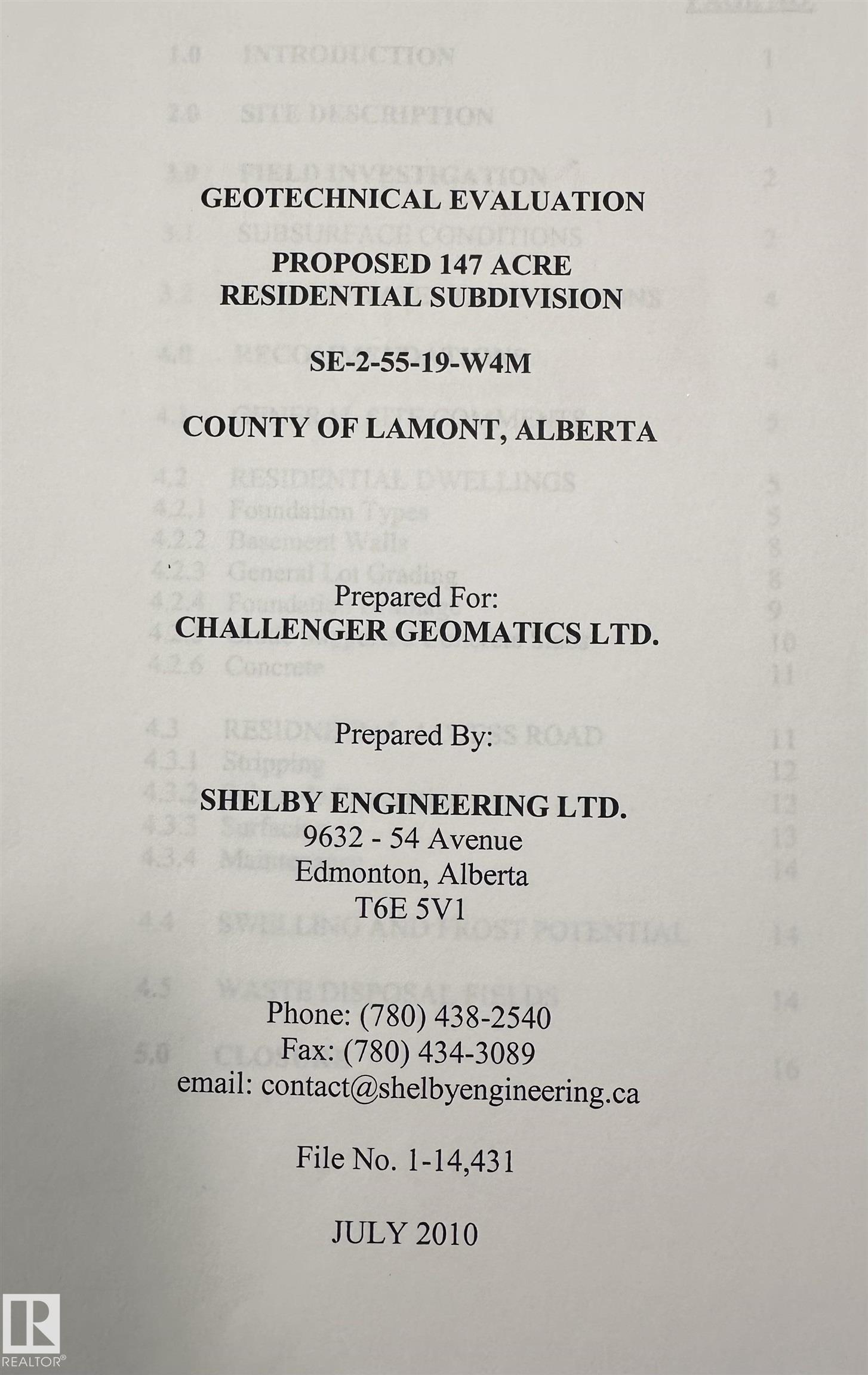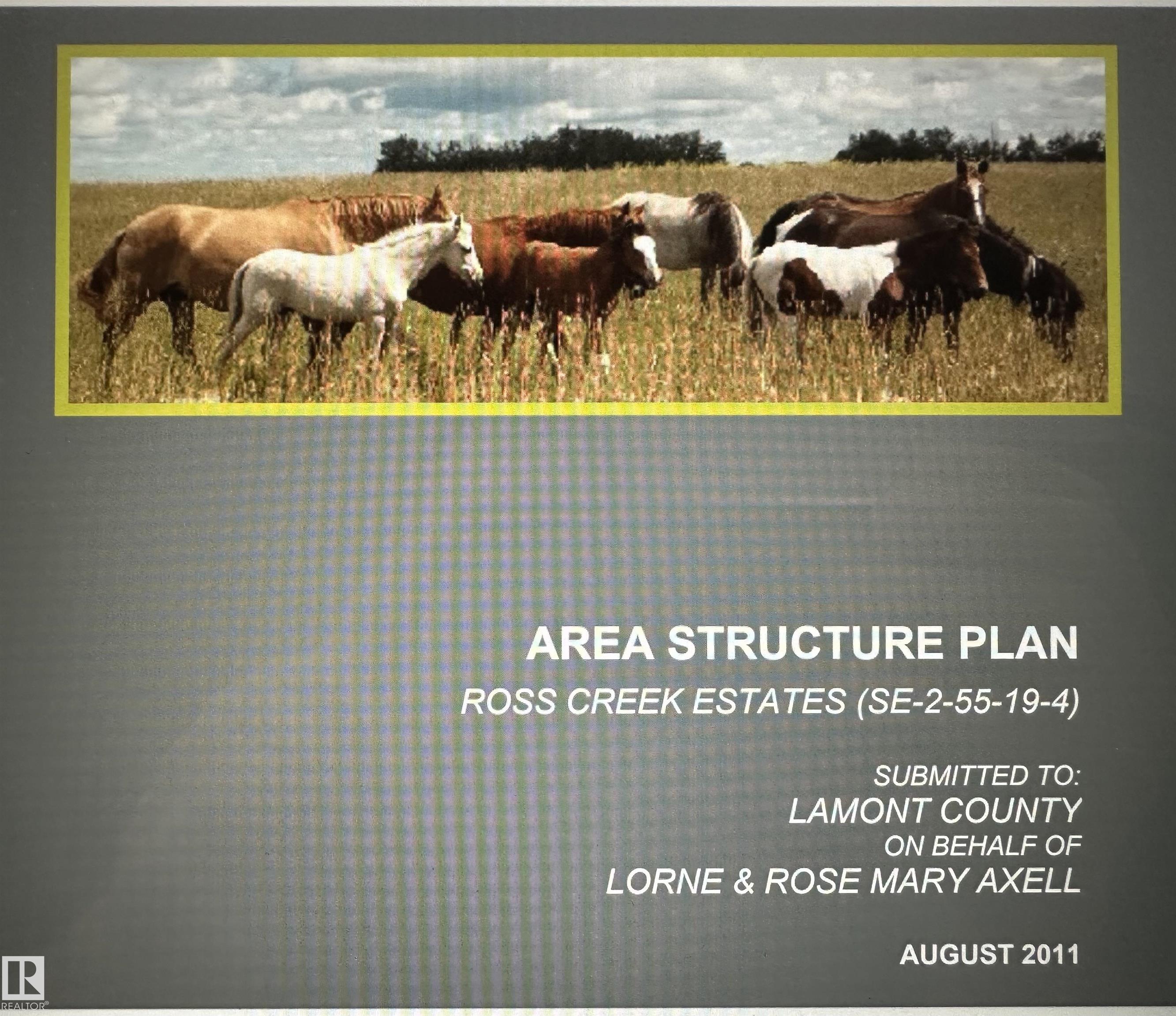 147.30 acres of Land used agriculturally, but ZONED COUNTRY RESIDENTIAL. Currently in hay, pasture and a small ~20 acre field seeded to oats in 2025. The owners spent years of effort and lots of money to have an Area Structure Plan completed, various studies and tests done, and rezoning approved. This land can be used as hay and farmed for now, but is ready for a developer to build a subdivision road, bring in gas/power to the lot lines, and subdivide, title and SELL ACREAGES. This is a great area for future acreages, with close proximity to Highway 15, 16, 831 and 834, Elk Island Natl park and the Industrial Heartland area with lots of high-paying jobs. Can you see the opportunity? Do you have the vision?