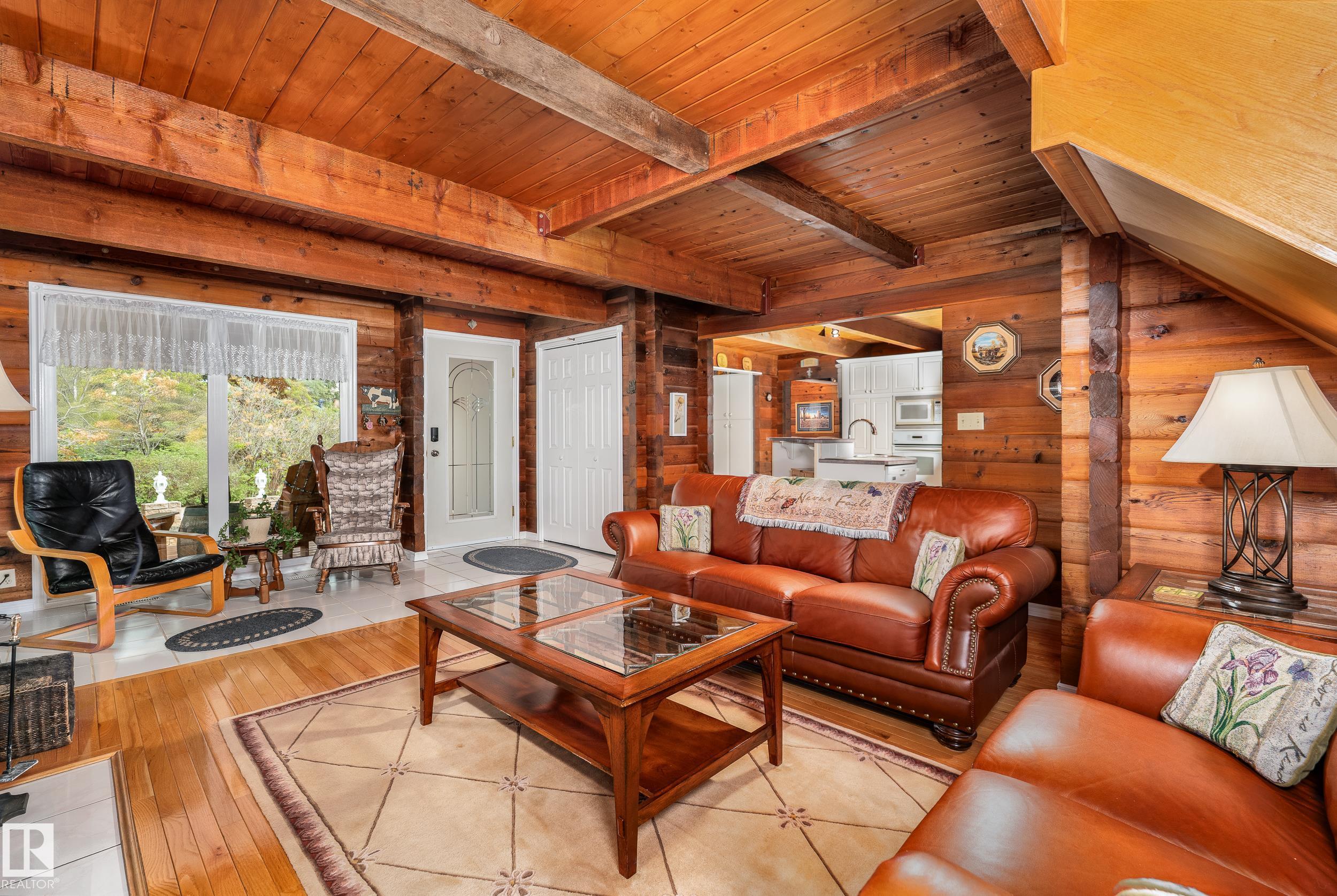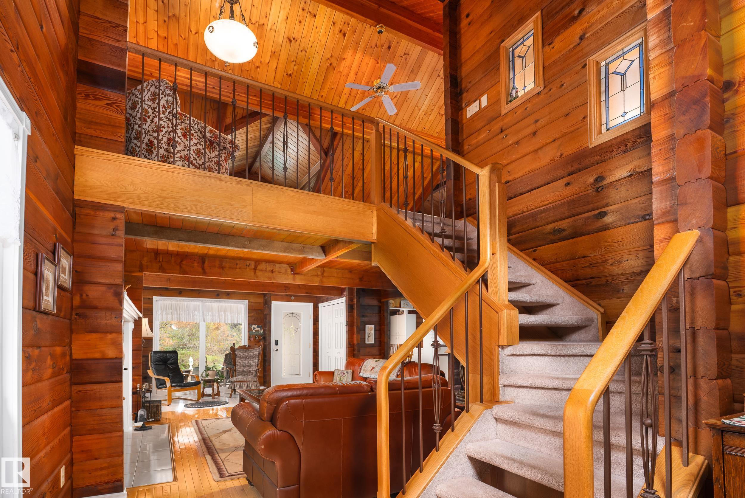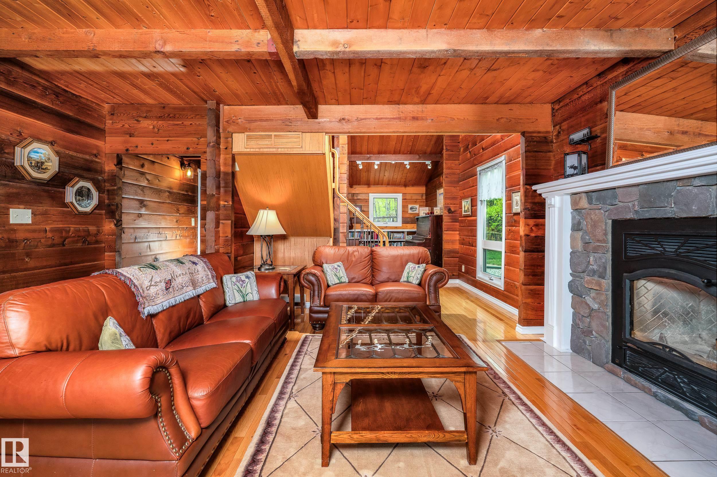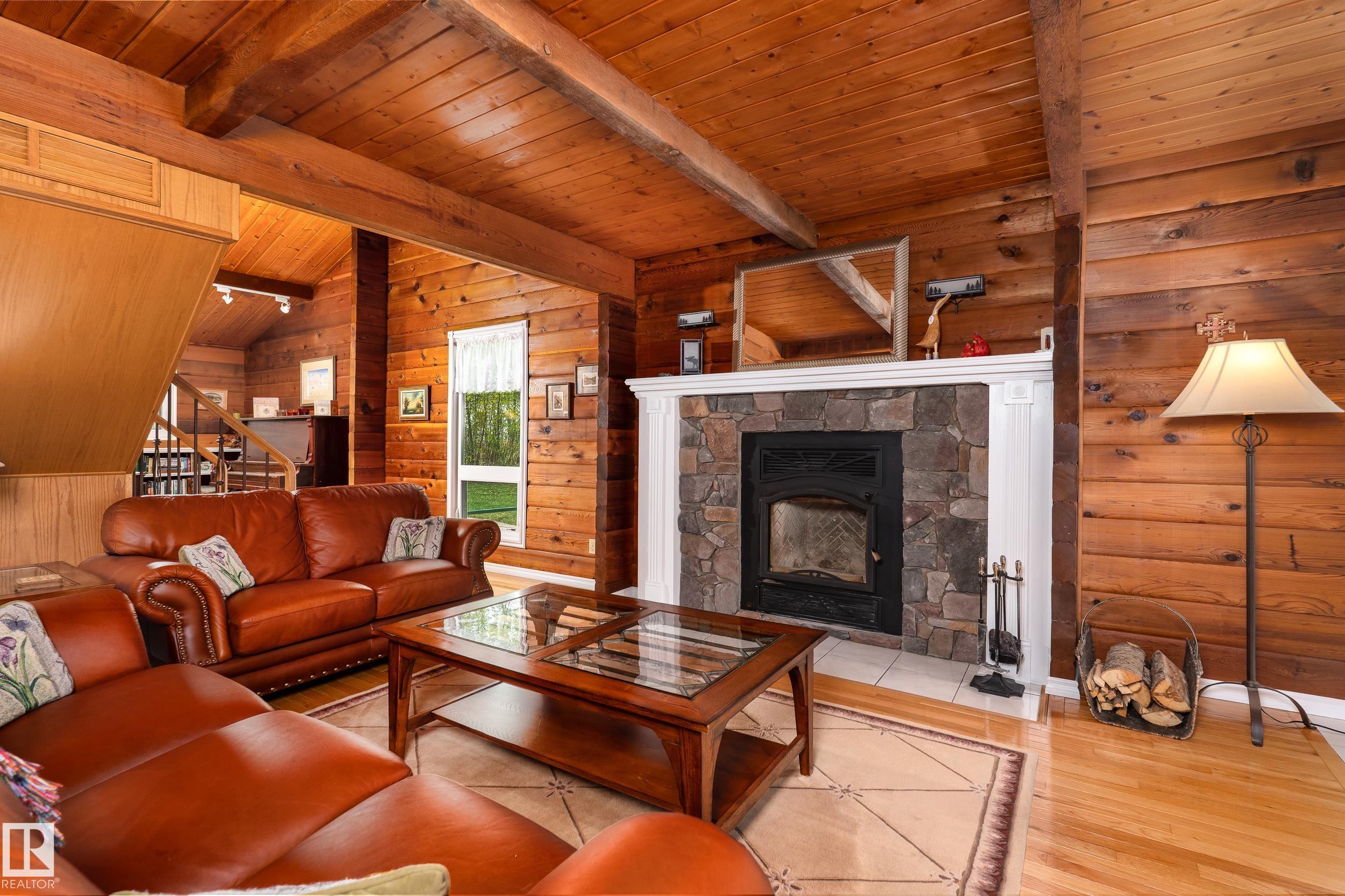 Absolutely STUNNING! This meticulous 1 1/2 storey red cedar log home is 2866 sq. ft., tucked away on 5.9 acres of your own private oasis. The covered front veranda welcomes you as you enter into the home with a wood stone fireplace, hardwood floors, and vaulted ceiling throughout the home. The home has 3 bedrooms & den, 3.5 bathrooms, the loft master bedroom is huge with enough room for your own personal office, workout area, sitting area or for whatever you desire. The kitchen is spacious with a huge island, dining area off the family room, and an additional sitting area with it's own sink, perfect for a bar/coffee bar. The lower level has a second kitchen/bar, bedroom, 4 pc bathroom, games room and additional family room. Upgrades include metal roof, triple pane window, hot water tank (2024), furnace (2024) and septic tank (2021). Detached triple garage with a 4 bay workshop. The backyard is beautiful, and has a fenced area for horses. Serene lifestyle just minutes from the city.