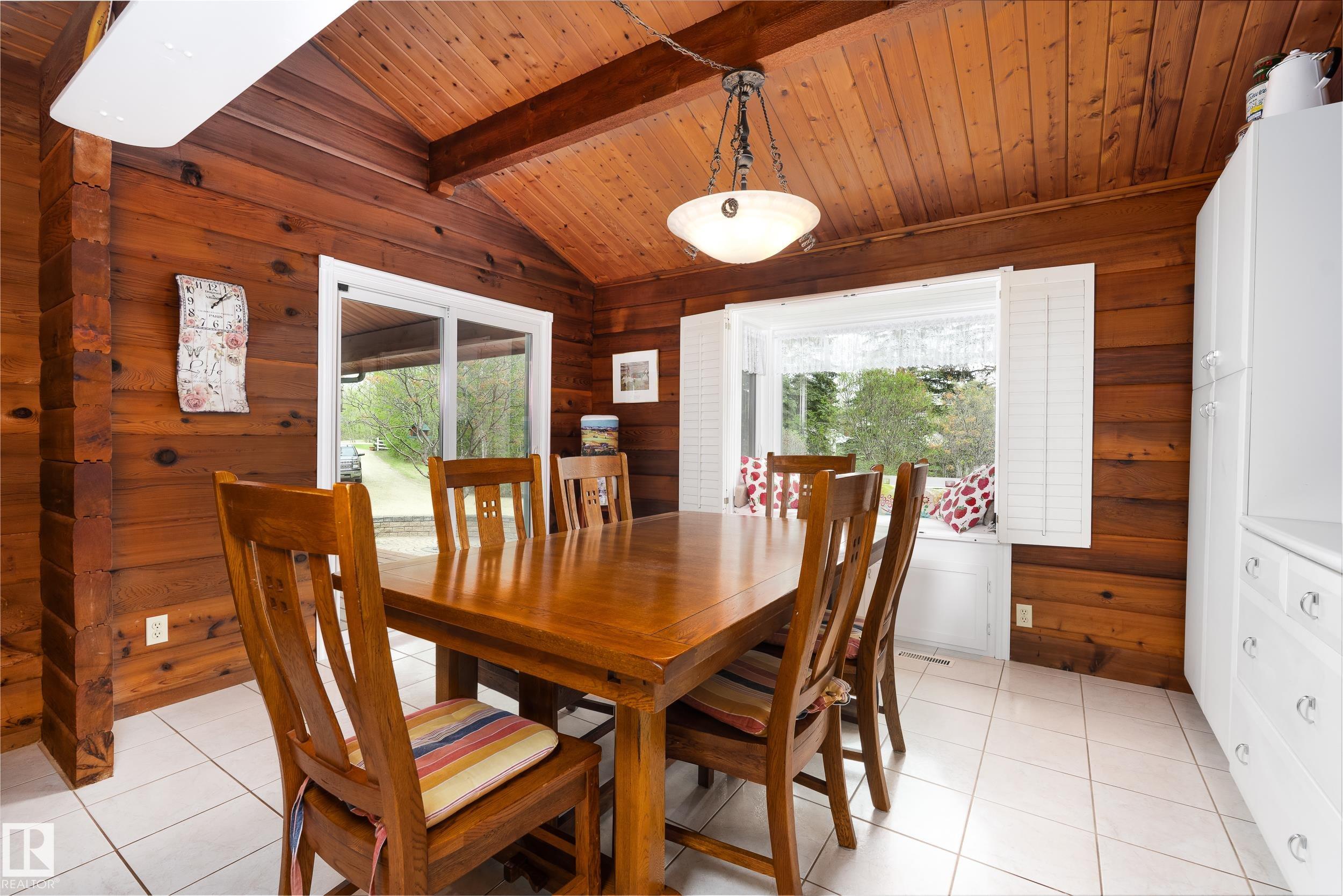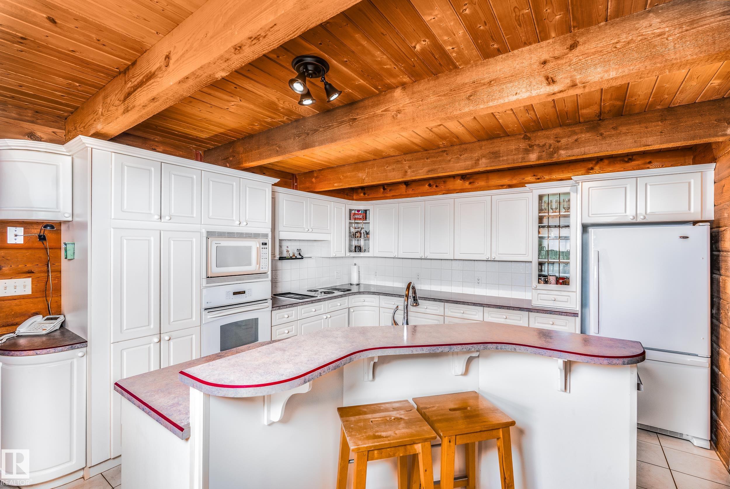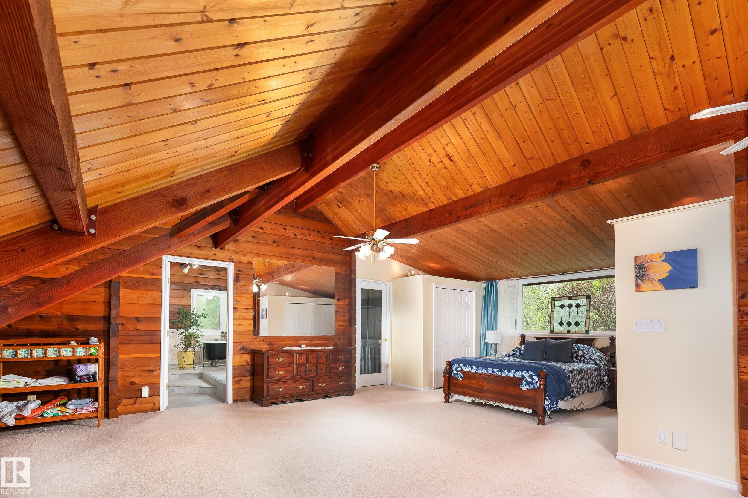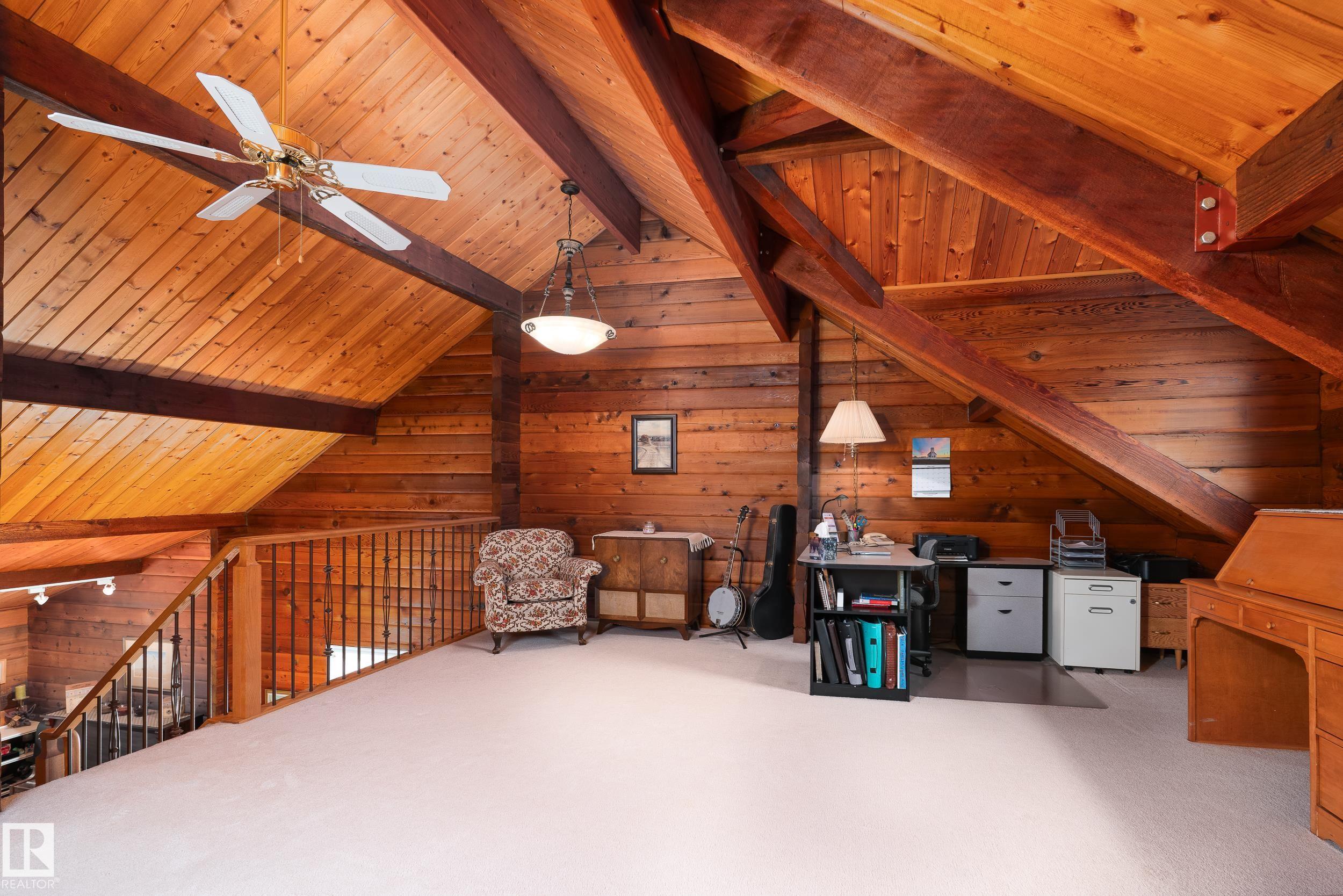 Absolutely STUNNING! This meticulous 1 1/2 storey red cedar log home is 2866 sq. ft., tucked away on 5.9 acres of your own private oasis. The covered front veranda welcomes you as you enter into the home with a wood stone fireplace, hardwood floors, and vaulted ceiling throughout the home. The home has 3 bedrooms & den, 3.5 bathrooms, the loft master bedroom is huge with enough room for your own personal office, workout area, sitting area or for whatever you desire. The kitchen is spacious with a huge island, dining area off the family room, and an additional sitting area with it's own sink, perfect for a bar/coffee bar. The lower level has a second kitchen/bar, bedroom, 4 pc bathroom, games room and additional family room. Upgrades include metal roof, triple pane window, hot water tank (2024), furnace (2024) and septic tank (2021). Detached triple garage with a 4 bay workshop. The backyard is beautiful, and has a fenced area for horses. Serene lifestyle just minutes from the city.
