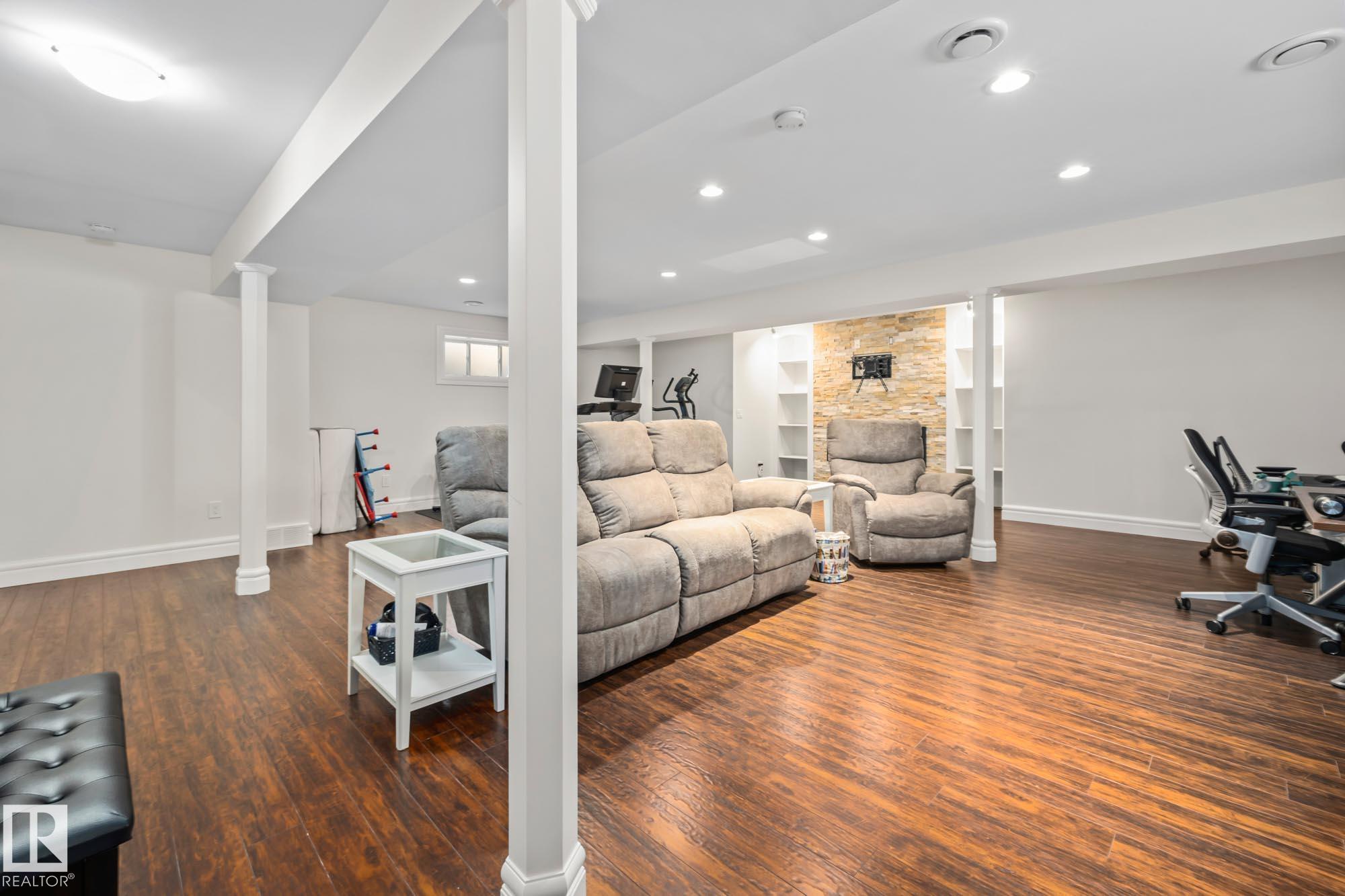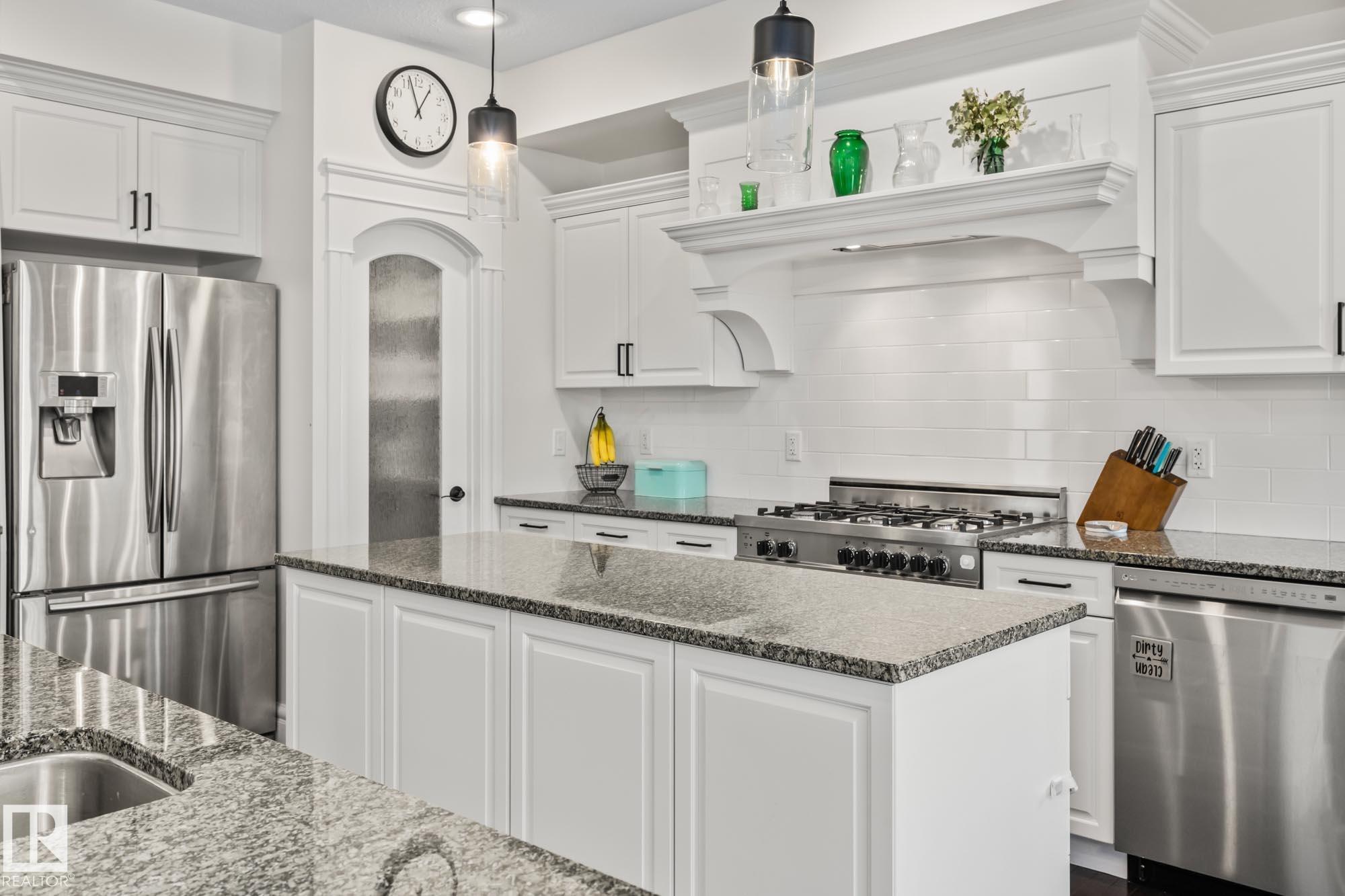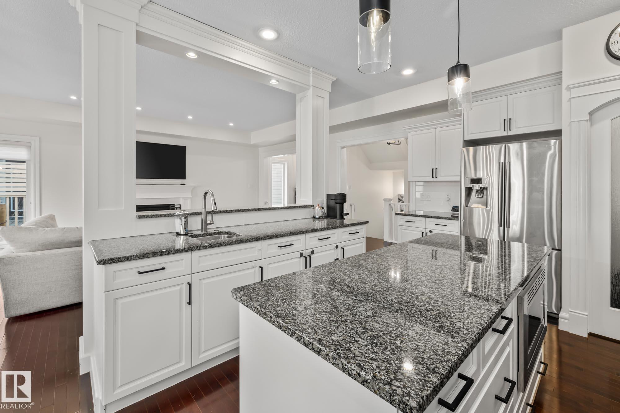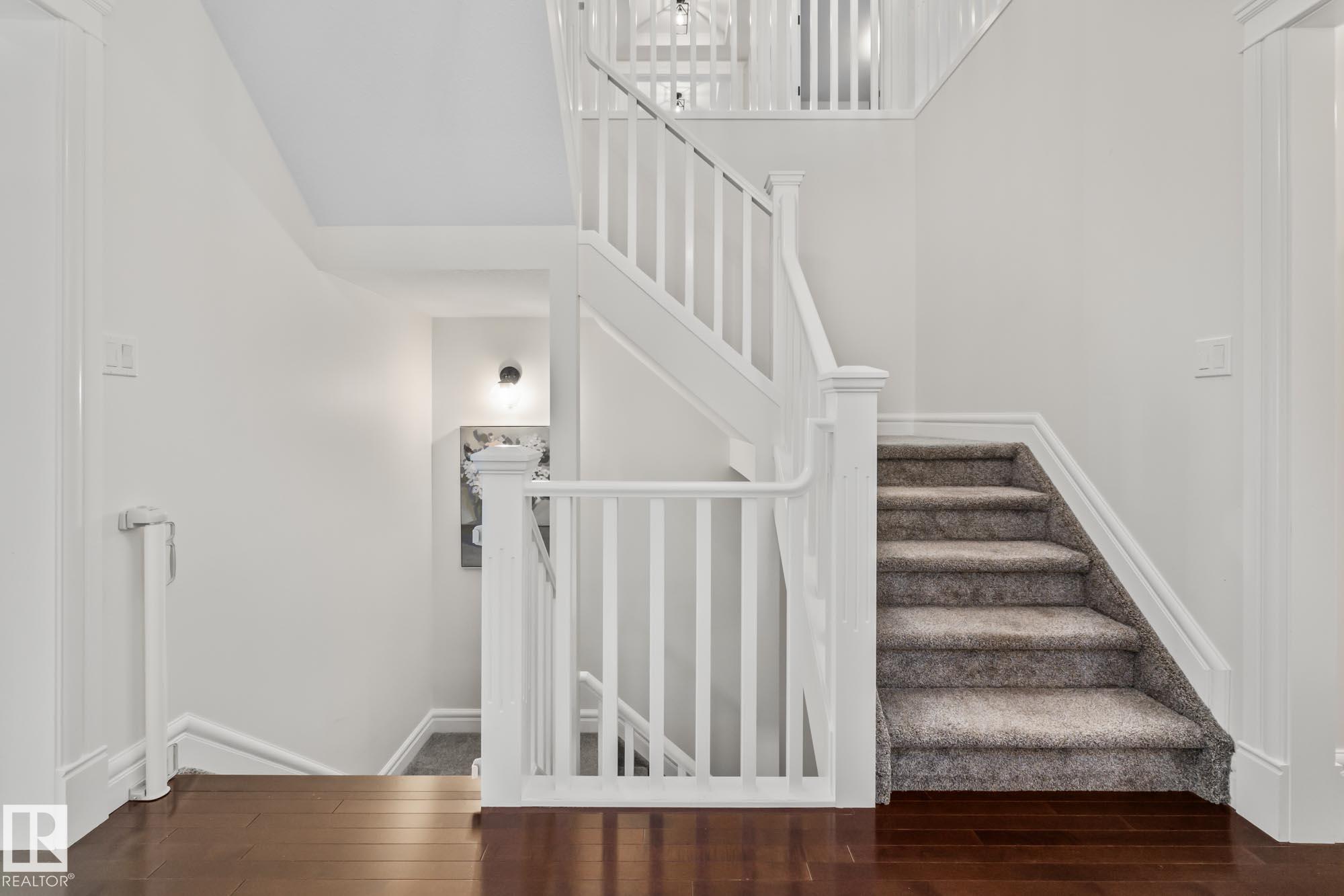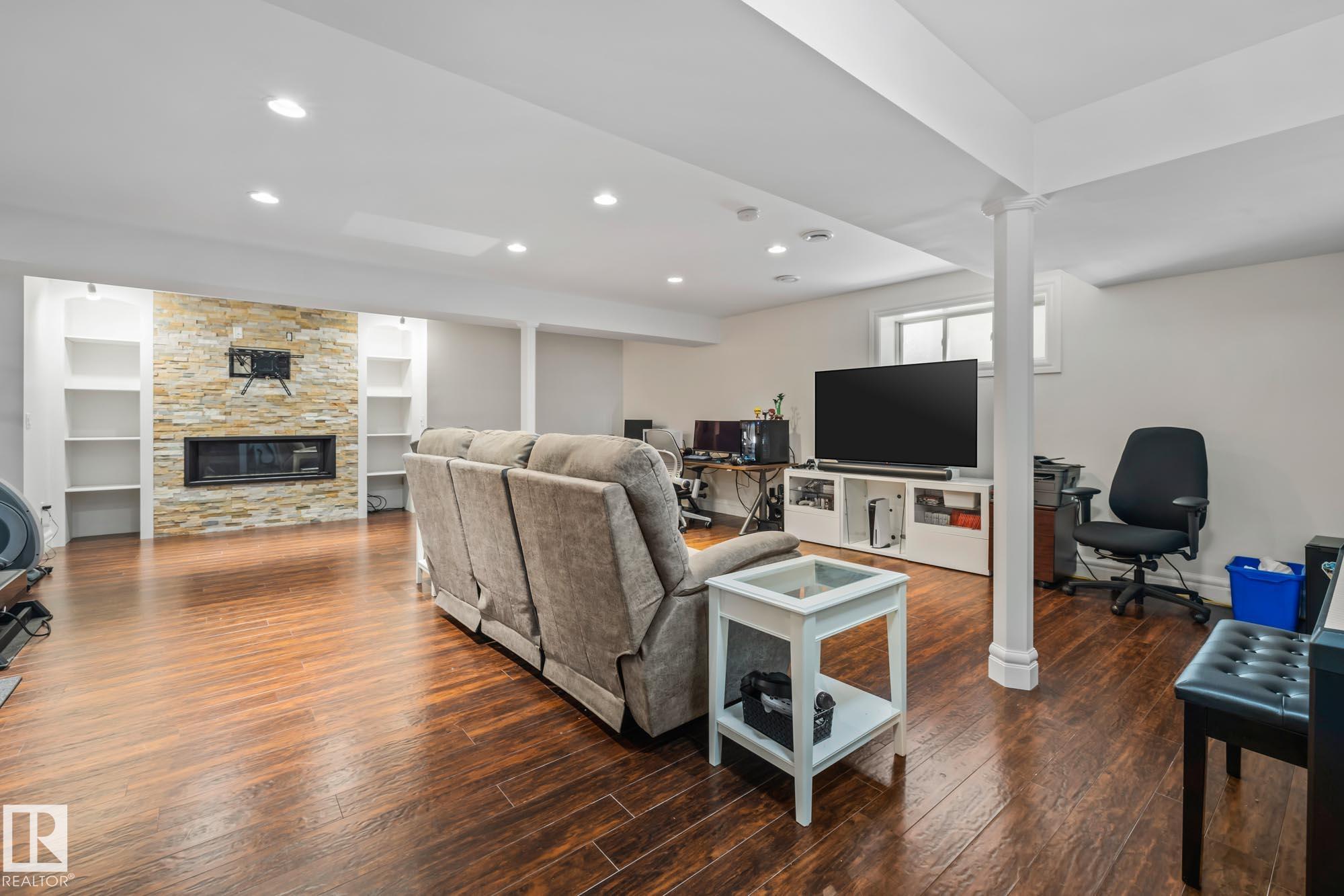With over $100K in upgrades, this Summerwood 2 storey is truly move in ready. Offering 4 bedrooms, 3.5 baths, and an oversized insulated double garage, it blends modern style with everyday function. The main floor features a chef's kitchen with granite island, professional gas range, refinished cabinets, new backsplash, updated sinks and hardware, opening to a bright living room with stone fireplace. Upstairs, a spacious bonus room, two bedrooms, full bath, and convenient laundry surround the luxurious primary suite with walk in closet, wet bar, and spa inspired ensuite with soaker tub and glass shower. The finished basement adds scraped hardwood floors, a second fireplace, large rec room, flexible fitness or office space, and an additional bedroom with a full bath nearby. Key updates include fresh paint, lighting, hot water tank, water softener, furnace motherboard, washer, dryer, and a remodeled powder room. Outside, enjoy artificial grass, a stone patio, and built in seating, all close to trails, parks