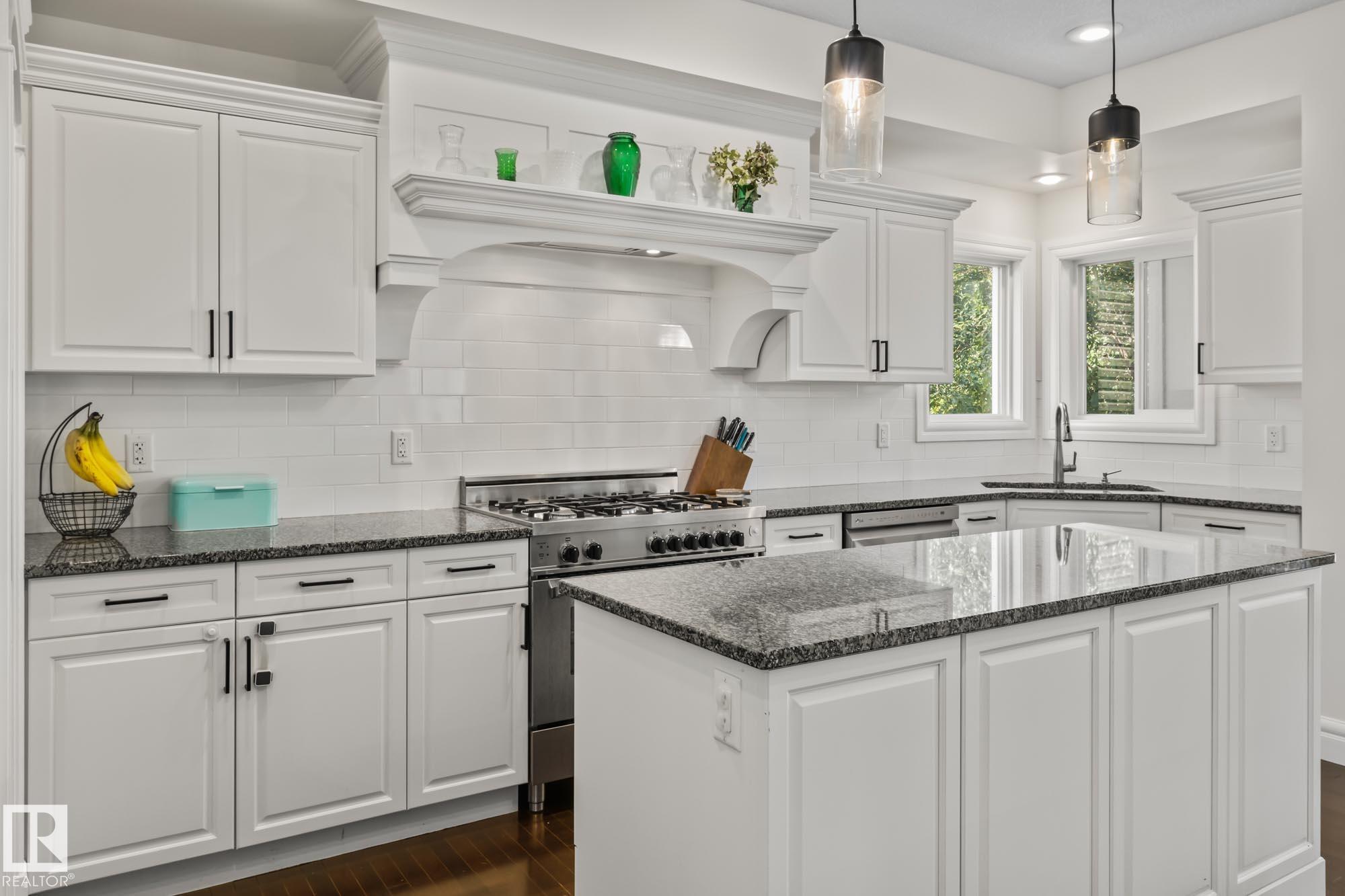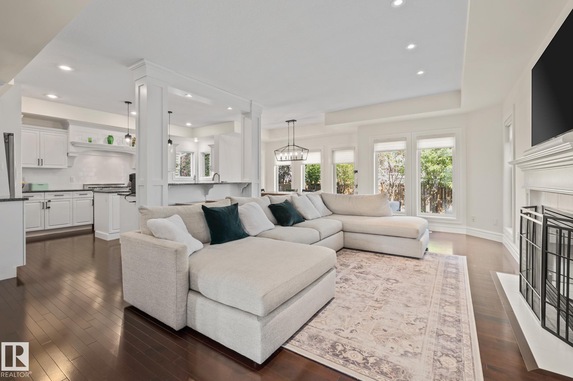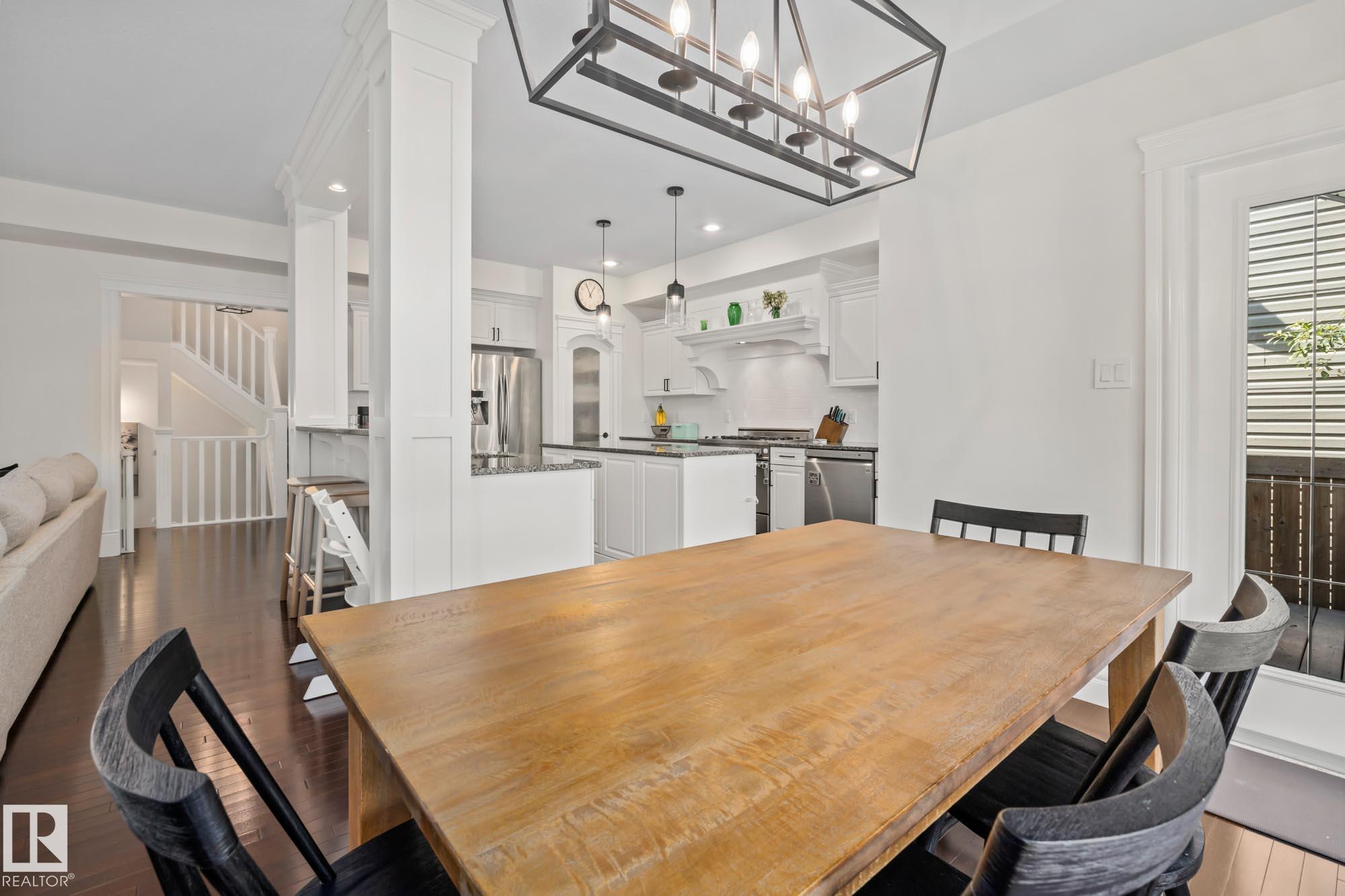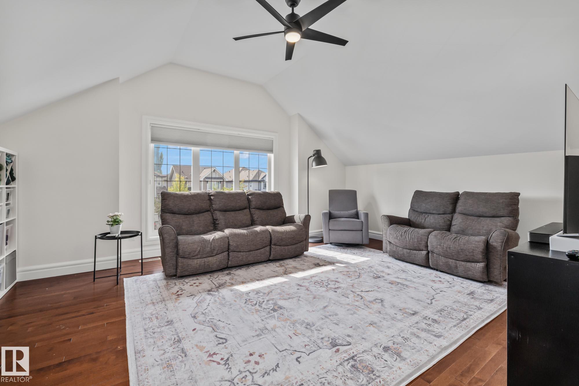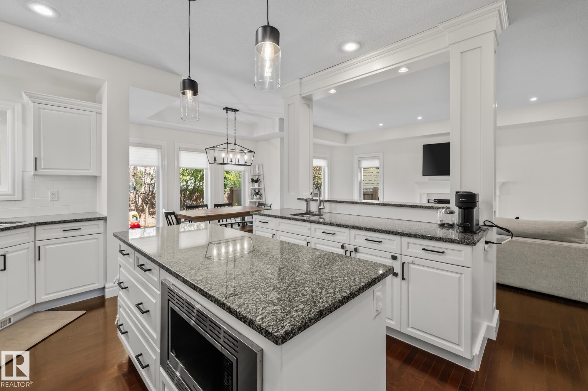 With over $100K in upgrades, this Summerwood 2 storey is truly move in ready. Offering 4 bedrooms, 3.5 baths, and an oversized insulated double garage, it blends modern style with everyday function. The main floor features a chef's kitchen with granite island, professional gas range, refinished cabinets, new backsplash, updated sinks and hardware, opening to a bright living room with stone fireplace. Upstairs, a spacious bonus room, two bedrooms, full bath, and convenient laundry surround the luxurious primary suite with walk in closet, wet bar, and spa inspired ensuite with soaker tub and glass shower. The finished basement adds scraped hardwood floors, a second fireplace, large rec room, flexible fitness or office space, and an additional bedroom with a full bath nearby. Key updates include fresh paint, lighting, hot water tank, water softener, furnace motherboard, washer, dryer, and a remodeled powder room. Outside, enjoy artificial grass, a stone patio, and built in seating, all close to trails, parks