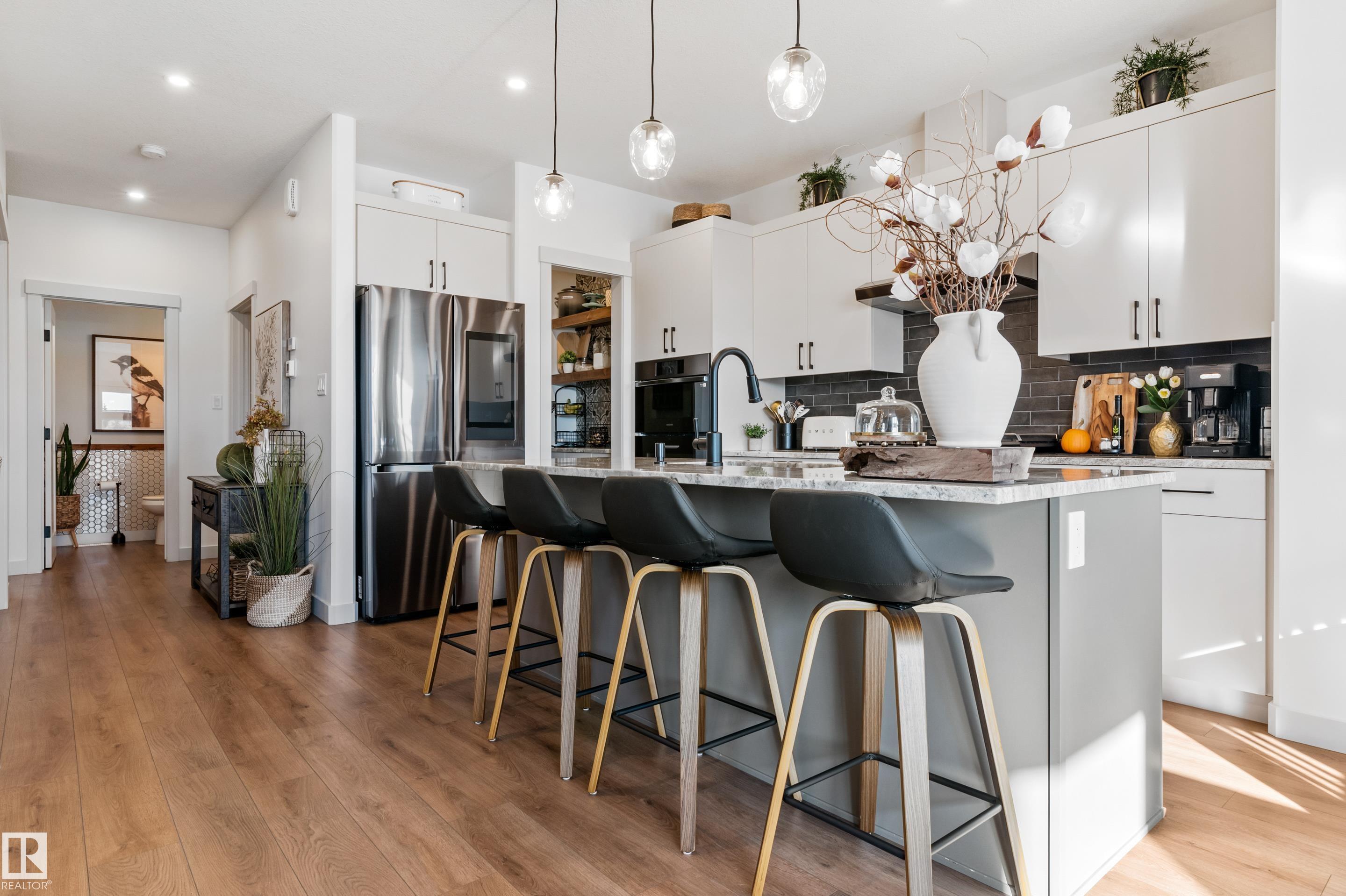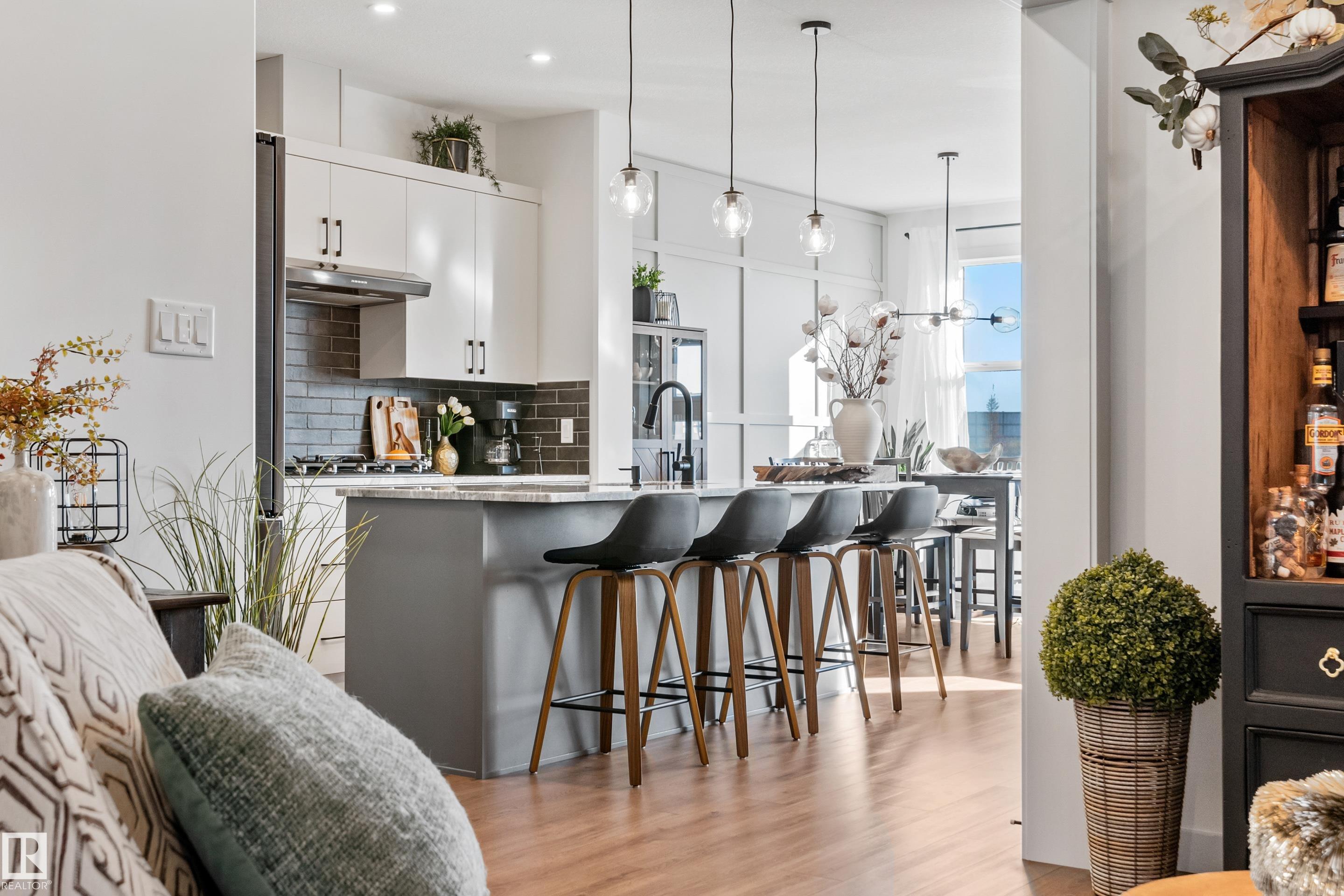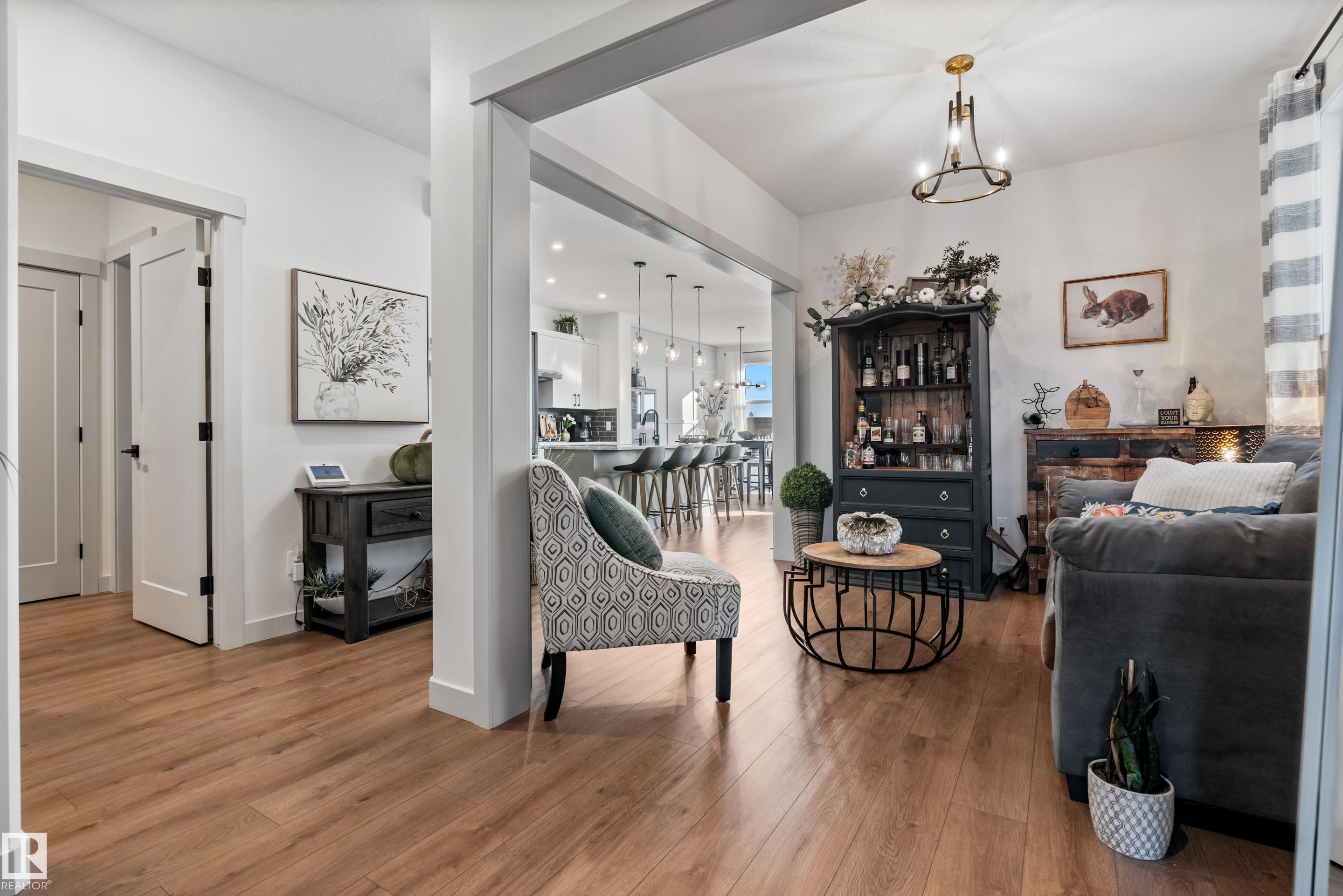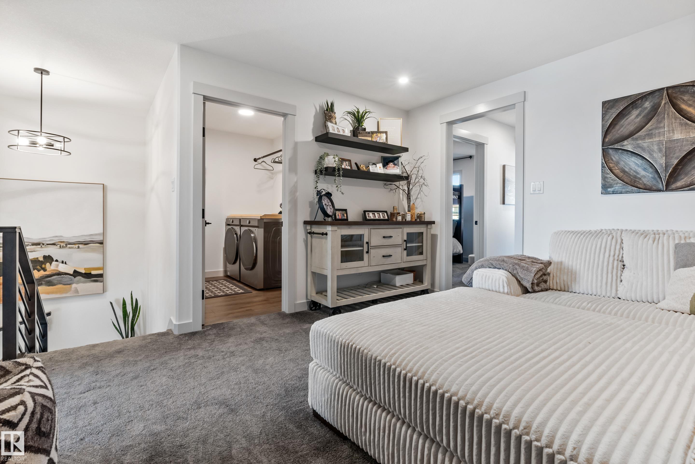 Backing onto the lake and facing the park, this exceptional 2-storey home features a modern farmhouse design with 2,159 sq. ft. plus a partially finished walkout basement. The main floor offers a stunning kitchen with high-end appliances, quartz countertops, walk-through pantry, and spacious dining area. Additional features include vinyl plank flooring, flex room/office, powder room, and bright living room with electric fireplace. Upstairs offers a bonus room, new carpet (to be installed), 3 bedrooms, 4-piece bath, and laundry room with sink. The primary suite includes a luxurious 5-piece ensuite and walk-in closet. The walkout basement is framed for a future bedroom, bathroom, wet bar, and fireplace. Enjoy beautiful sunrise views from the large deck. Fully fenced and landscaped yard with dog run and $20K custom shed. Oversized (23'x26') heated garage with custom shelving, cabinetry, and 8-ft door. A perfect blend of luxury, location, and lifestyle.